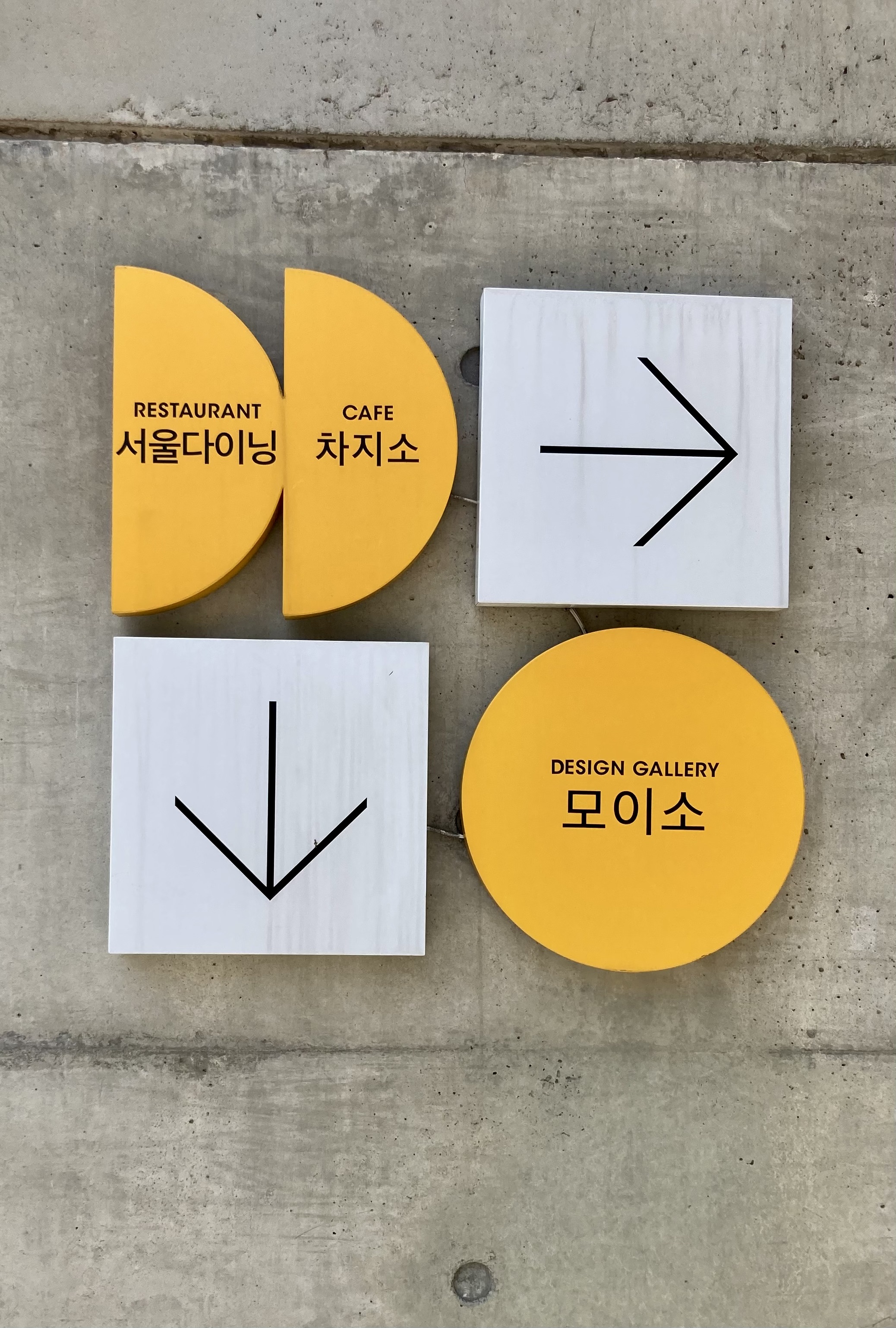 입구 콘크리트 벽면에 이 건물에 있는 레스토랑, 카페, 갤러리 안내판이 엘로우와 화이트, 반달과 원형 그리고 정사각형과 화살표로 독특하게 디자인 돼 있어 그 앞에서 사진 찍는 이들이 많다. 레스토랑 이름은 바로 알아보겠는데, 카페와 갤러리 이름은 한 번에 들어오지 않아 무슨 뜻일까 궁금해지게 만든다.