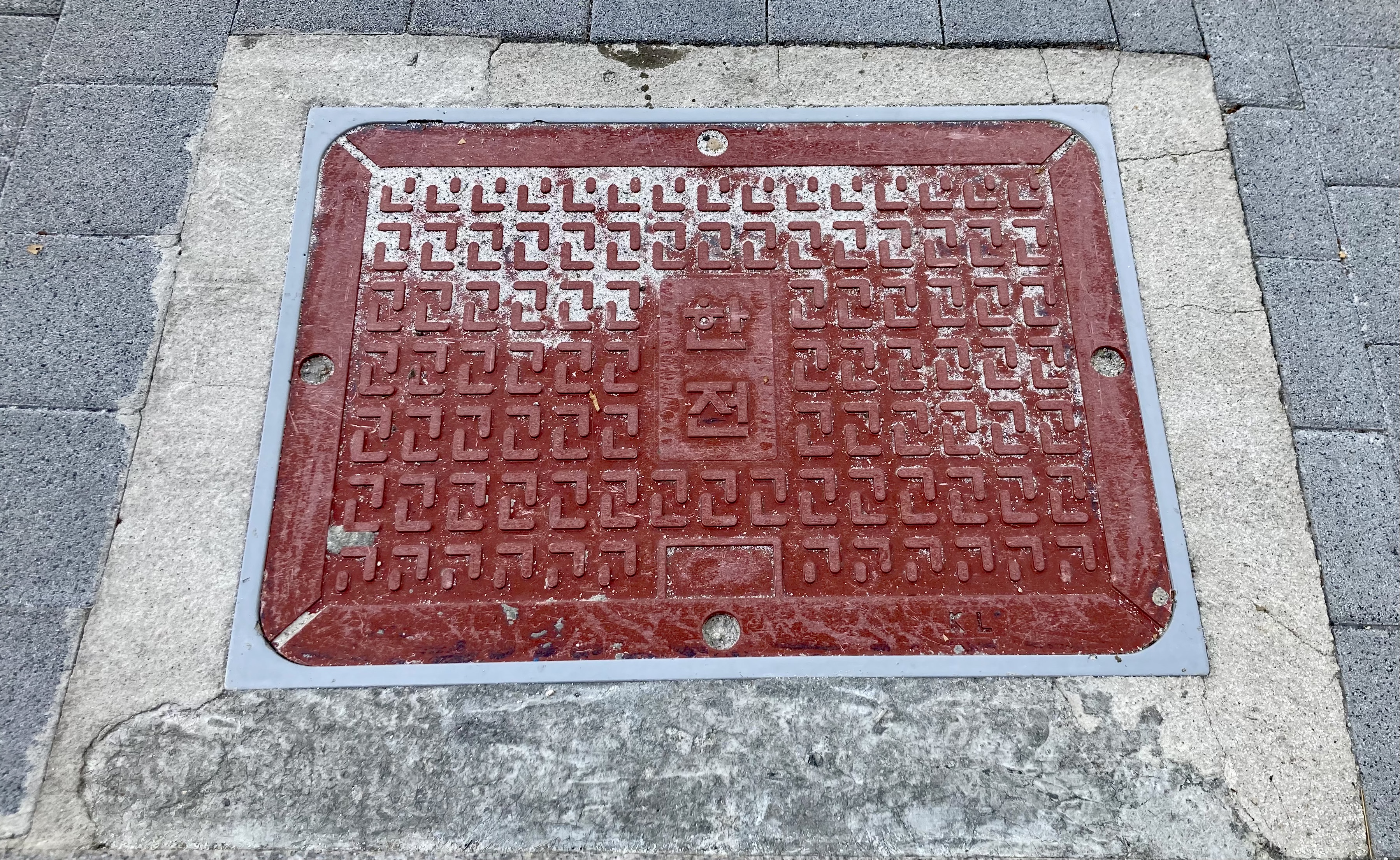 송파나루역 4번 출구로 나가면 몇 걸음 간격으로 다양한 컬러의 보행 블럭들 사이에 이런저런 맨홀들이 설치돼 있다. 여기만 아니라 다른 동네도 사정은 대체로 비슷해서, 우리 발밑엔 여러 가지 맨홀들이 설치돼 있다. 설치 주체에 따라 크기와 모양이 다양한데, 여기는 유난히 한전에서 설치한 것들이 눈에 띄었다.
