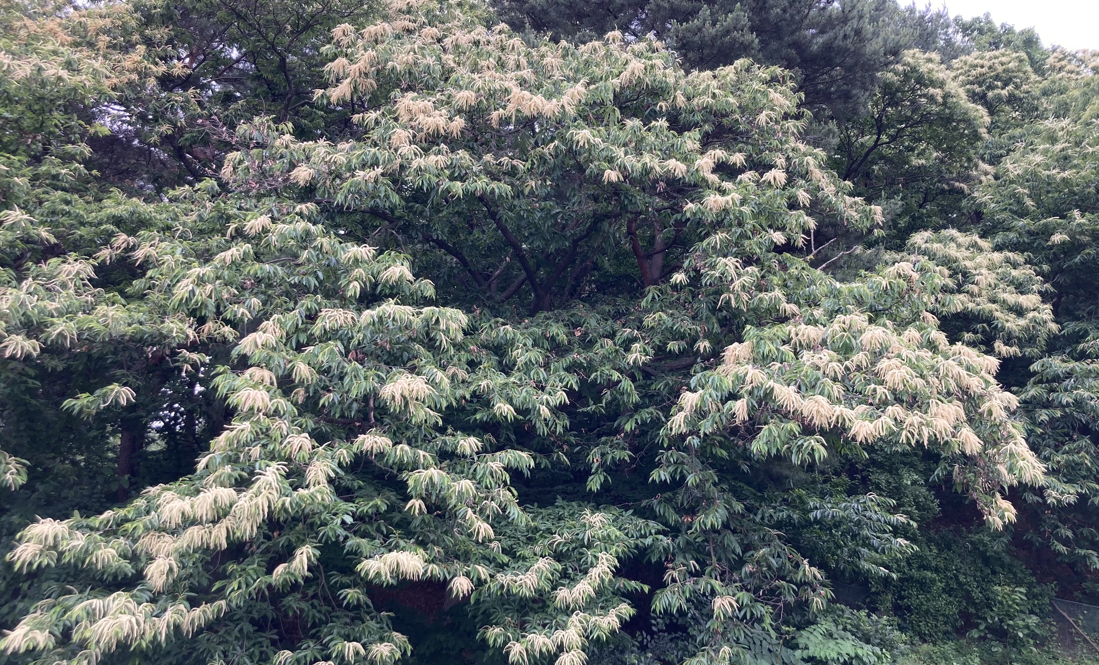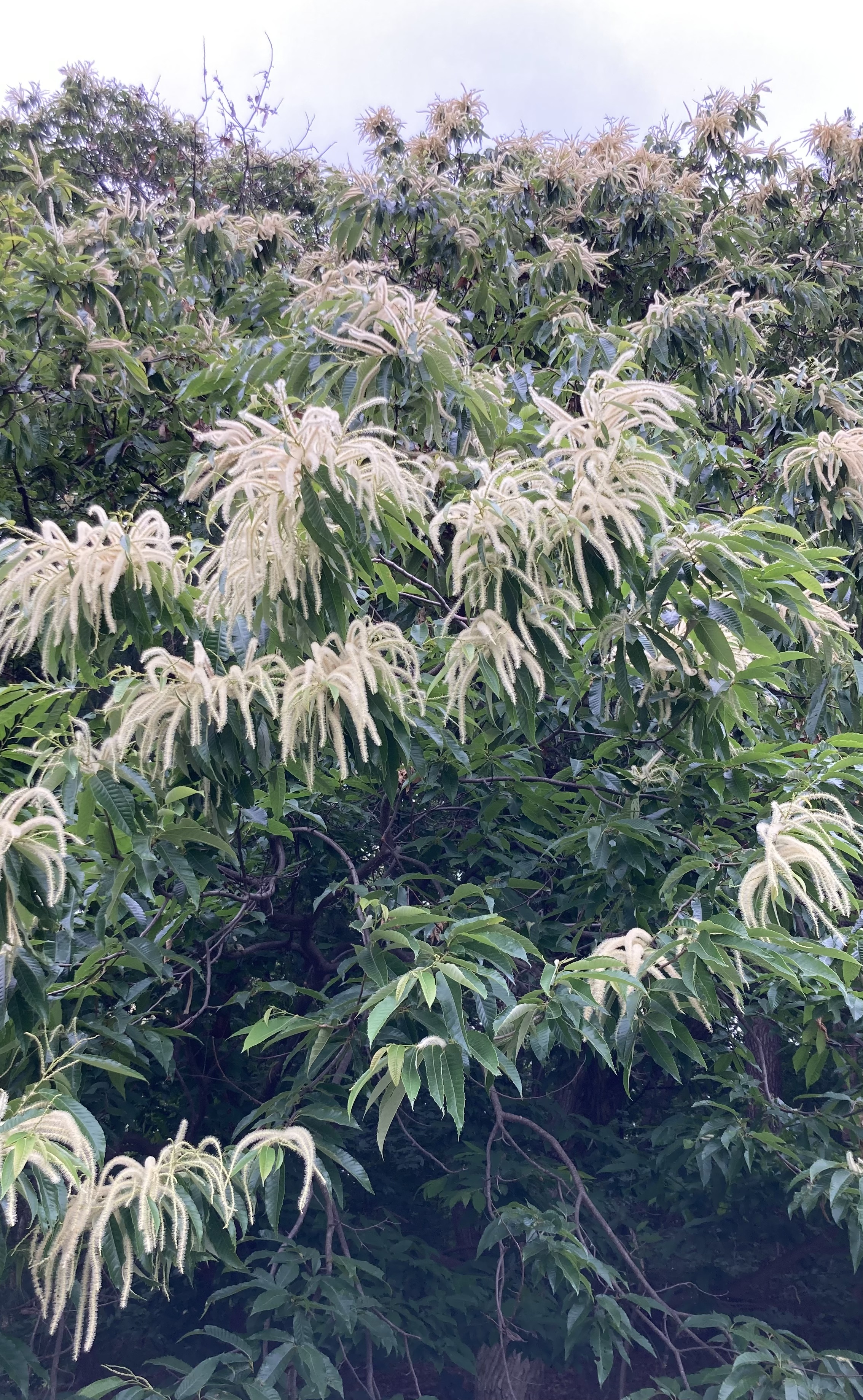 팔당대교 못 미쳐 있는 동네 냉면(6/6/22)(어디다 내놔도 손색없는 맛집이다) 먹으러 검단산 아래를 걸어가는데, 길바닥에 허옇고 길다란 것들이 떨어져 있었다. 고개를 들어보니 조금 안쪽으로 밤나무들이 서 있었다. 하옇고 길다란 것들이 수북허니 달려 있는데, 밤꽃 무더기였다.