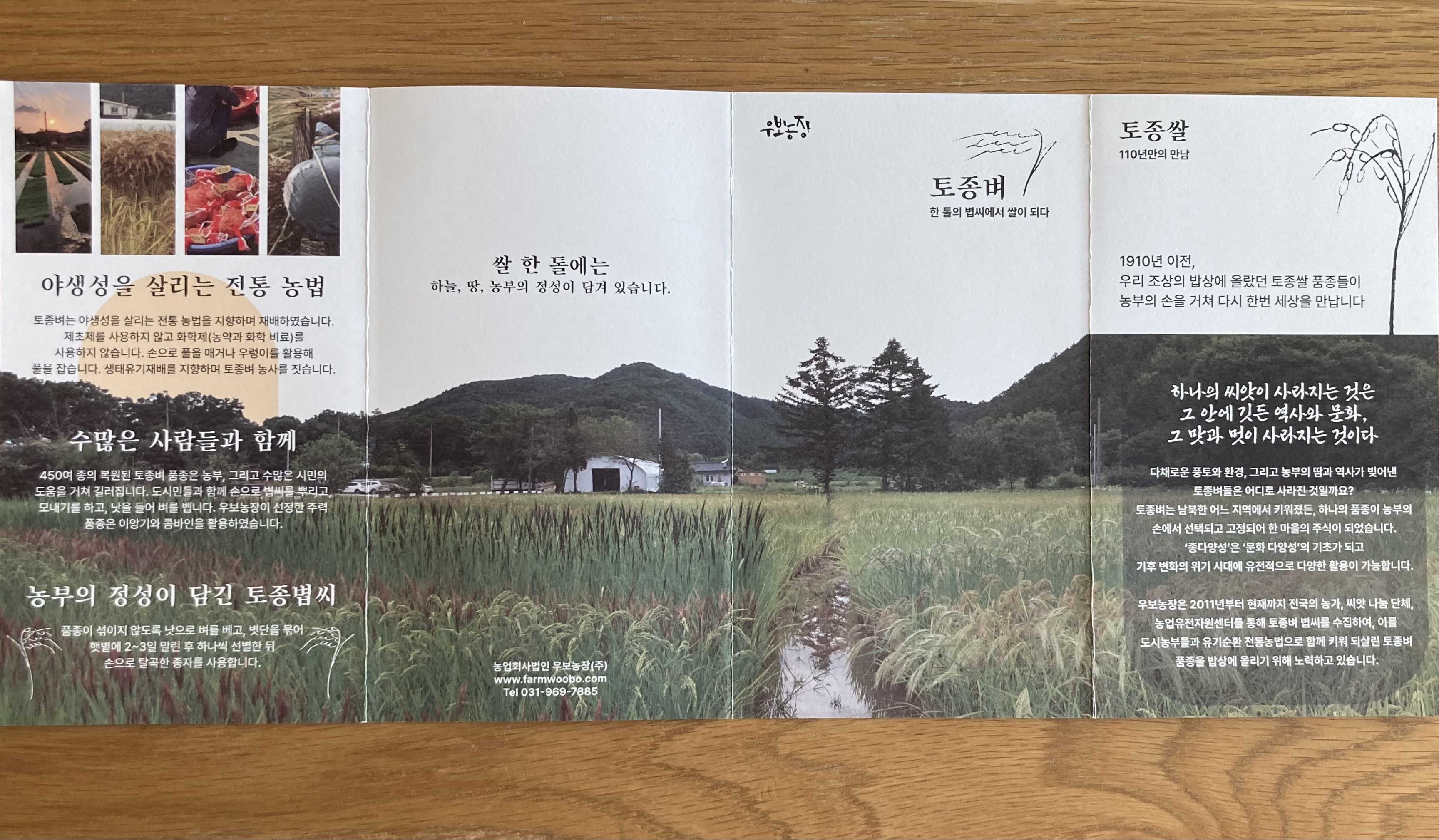 팜플렛을 읽어보니, 토종벼가 제법 많았는데 일제 시절을 지나면서 아키바레, 고시히카리 등 일본 품종에 생산성에서 밀려 경작 농가가 줄어들고 지금은 이런 게 있는지도 모르는 시대가 된 것 같다. 농업유전자원센터가 보존하고 있는 토종벼 볍씨를 수집하고 유기순환 전통 농법으로 되살려낸 뚝심이 대단해 보인다.