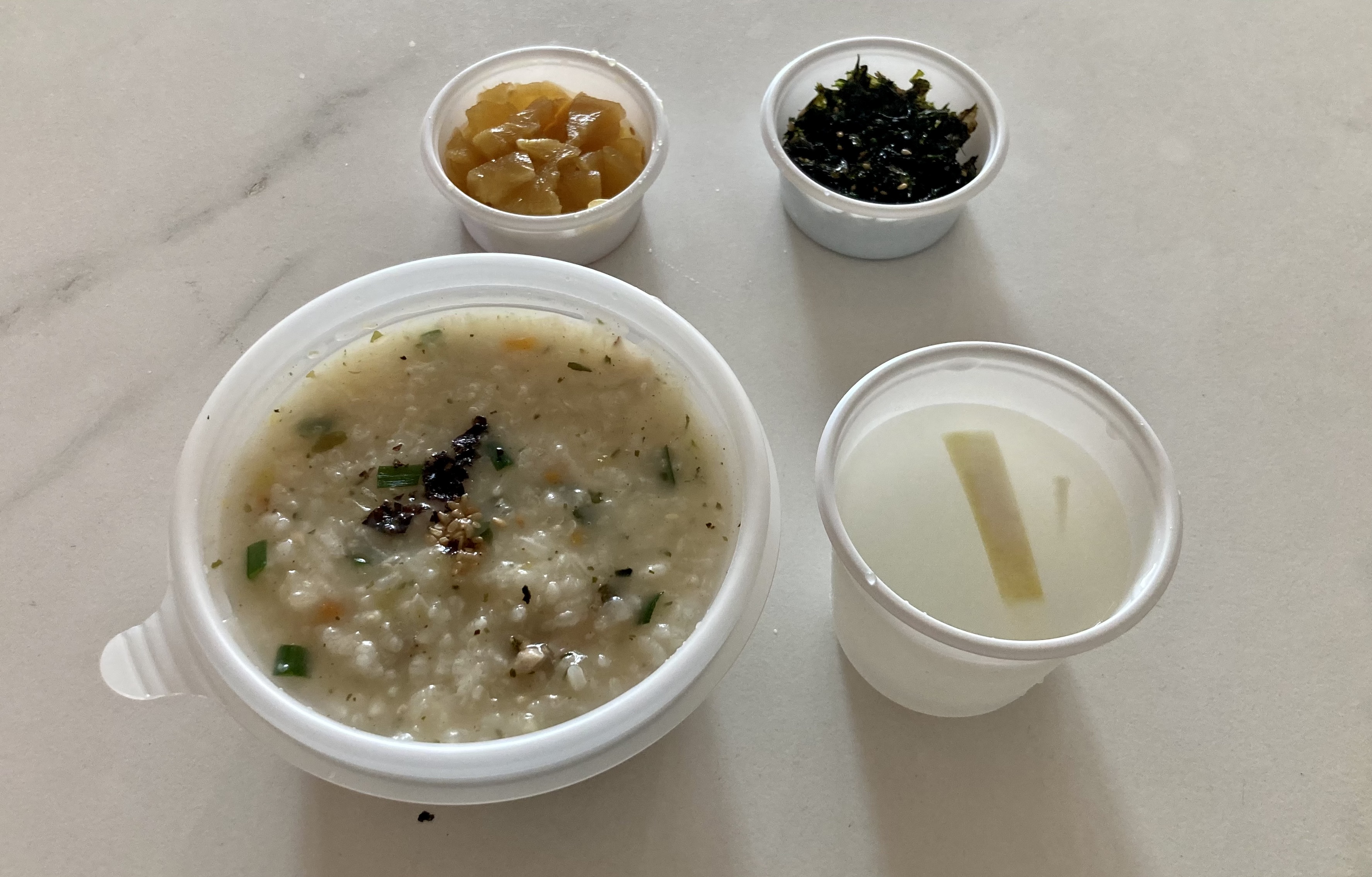 여름 감기 몸살이 와서 하루를 누워 지냈다. 전날 화성까지의 운전 피로도 누적돼 비실대는 바람에 아침은 건너뛰고 점심은 아내가 종종 주문해 먹는 동네 죽집(5/20/21)에서 해물죽을 사 왔다. 보통 땐 길죽한 네모 그릇에 주더니만, 덜어 먹을 줄 알고 동그란 그릇에 둘로 나눠 담아 주었다. 그러고 보니 죽 1인분이 적은 양이 아니다.