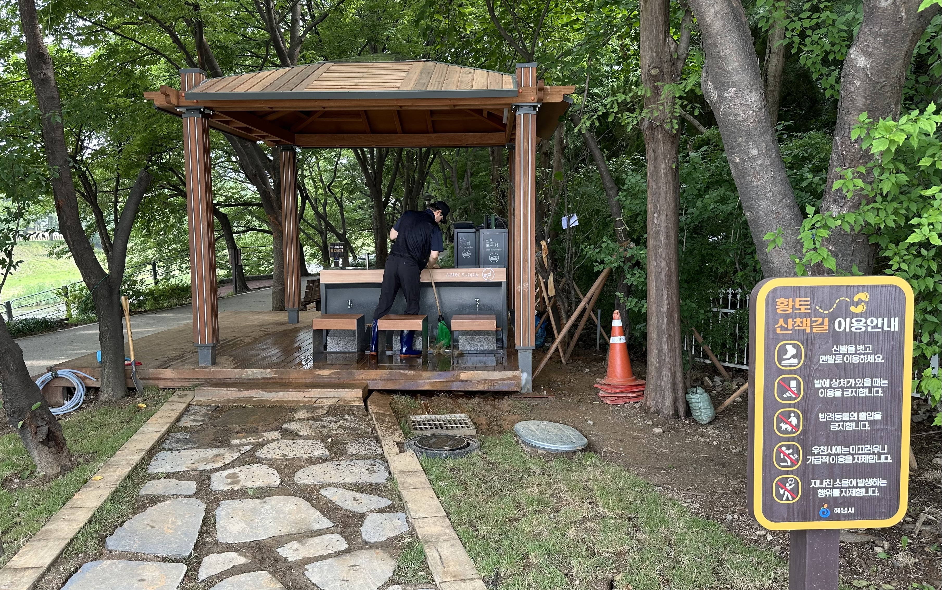 나는 이 길이 멀쩡할 때도 아직 걷지 않았는데, 걷는 건 좋지만 발에 묻은 흙을 닦아내는 게 귀찮기 때문이다. 그래도 이왕 해 놓았으니, 장마가 그치고 땅이 굳어지면 왕복 두어 번 걸어보고, 지속할지 여부를 생각하려 한다. 황토길이 끝나는 곳에는 이용 안내문과 앉아서 발을 닦을 수 있도록 수도와 돌의자 6개가 있는 정자를 설치해 놓은 것도 보기 좋았는데, 요즘 같아선 발에 달라붙은 흙이 너무 많아 황토가 거덜나지나 않을까 모르겠다.