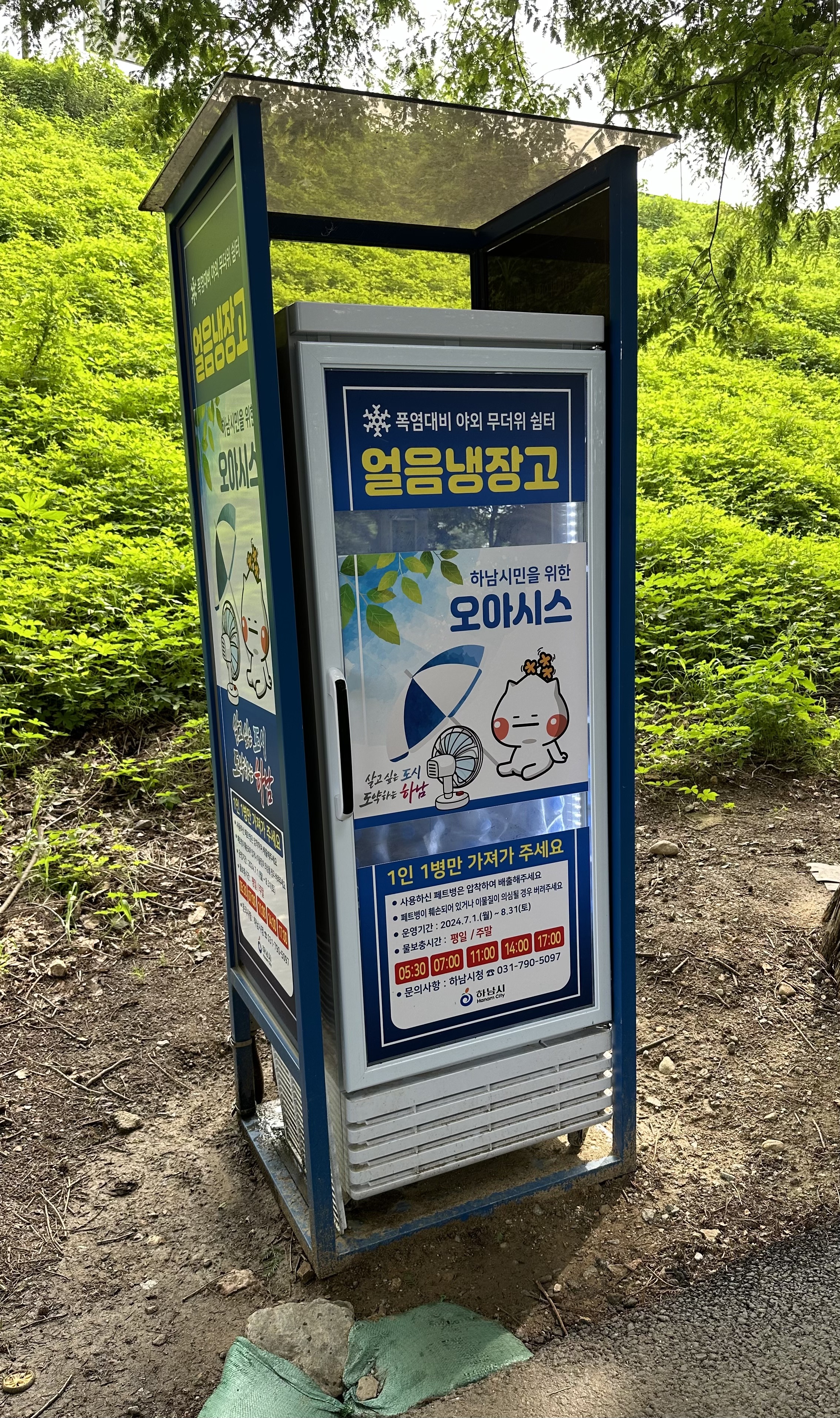 전에는 5백 mm 병이라 반쯤 마시고 가져왔는데, 작은 사이즈로 바뀌어 냉장고엔 좀 더 많은 병이 들어 있었다. 어찌나 꽁꽁 얼렸는지, 바로 마실 순 없어 손에 쥐고 녹는 대로 마셔야 했으니, 더위 날리는 덴 제격이었다. 이런 서비스의 원조가 어딘지 모르겠지만, 두어 주 전 아차산 숲속도서관에서 광나루역 내려오는 길에도 보여 반가웠다.