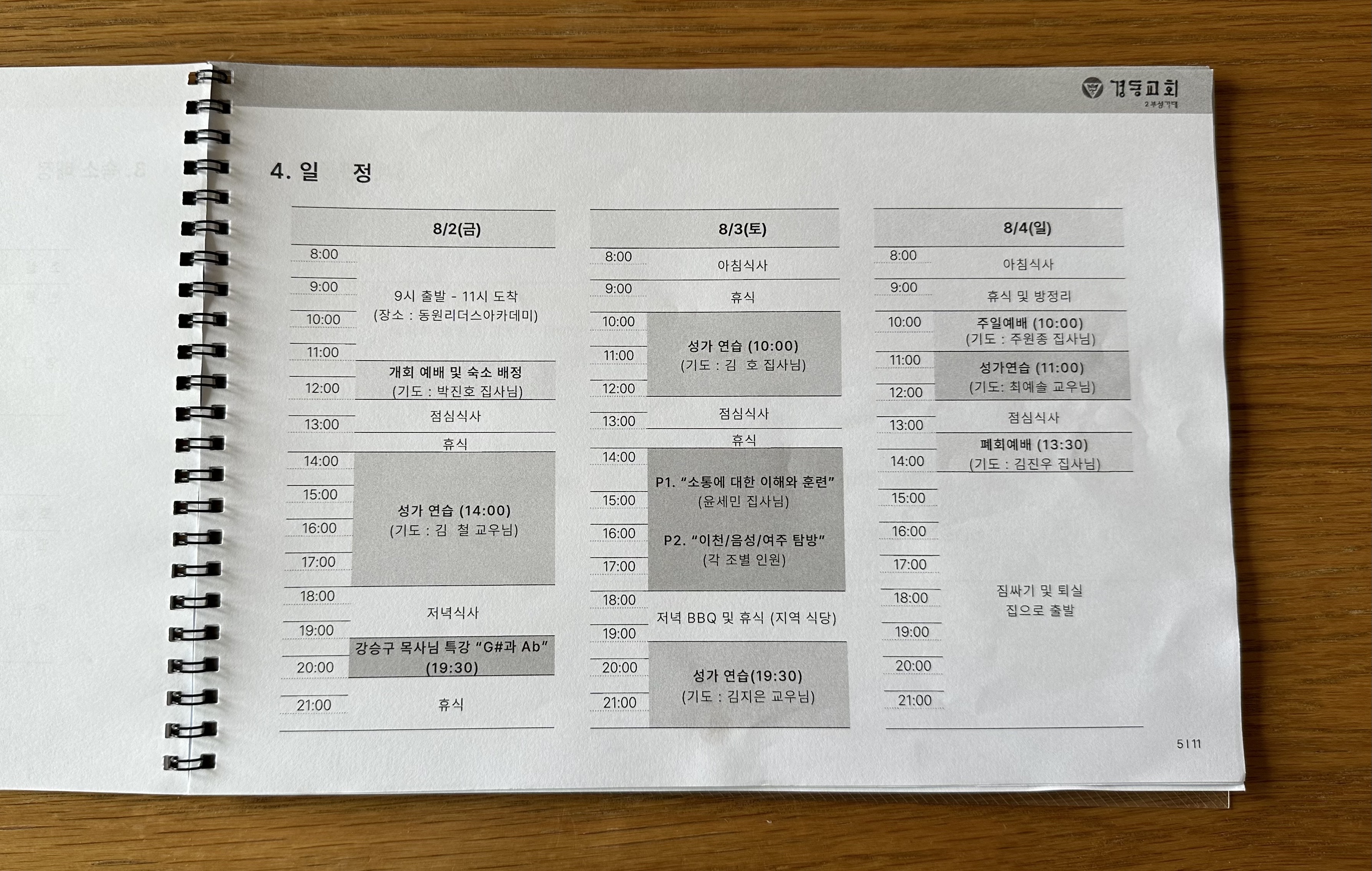예배 앞뒤의 연습 때문에 오전엔 따로 가고, 오후엔 점심을 함께 먹고 연습하는 동안 기다렸다가 같이 오는 생활로 패턴이 바뀔 것 같다. 합류하자마자 바로 성가대 수련회에 갔는데, 프로그램이 대부분 연습으로 구성돼 있는 것도 흥미롭다. 나도 할 순 있지만^^, 매이지 않고 할 수 있는 다른 봉사를 알아보고 있다.
