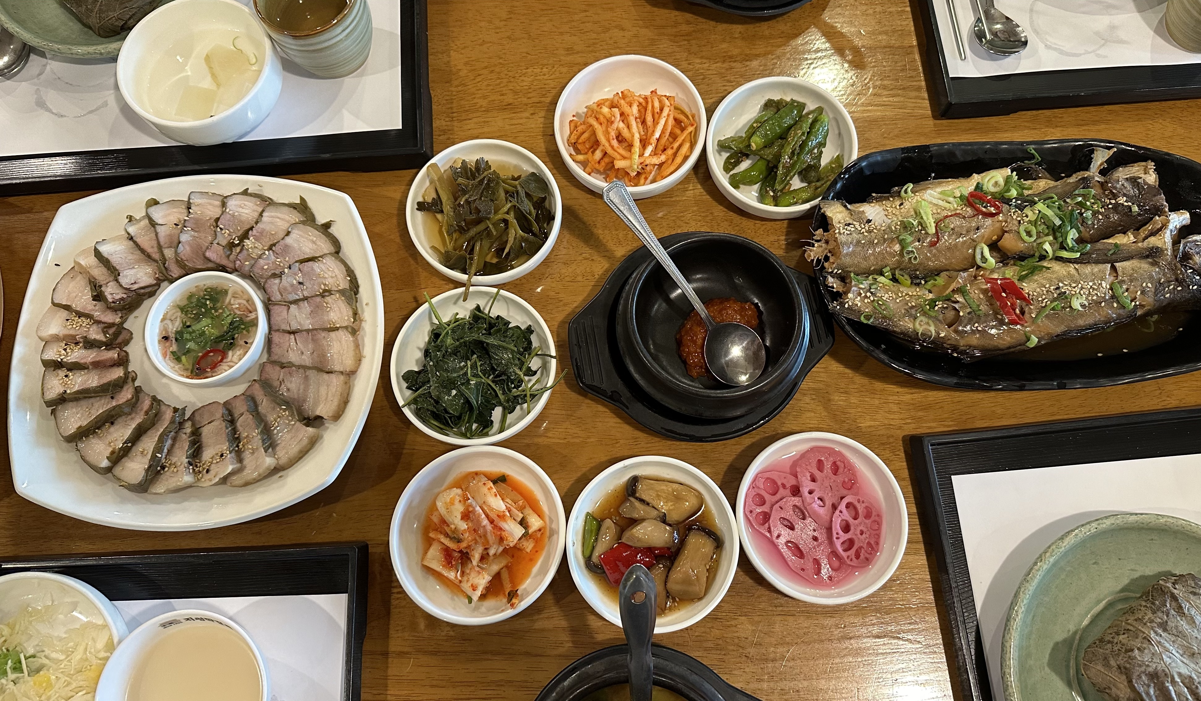 수육과 명태찜을 시켰는데, 연잎이 감싼 수육은 그냥 먹어도 된다고 했다. 명태찜은 매콤하게 내는 다른 집들과는 달리 집에서 먹는 것처럼 간장 베이스였는데, 젓가락을 대면 도톰한 살점이 잡혔다. 연잎을 벗기면 나오는 찰밥은 들어간 게 많진 않았지만, 아내가 워낙 좋아하는지라 비주얼만으로도 합격이었다.