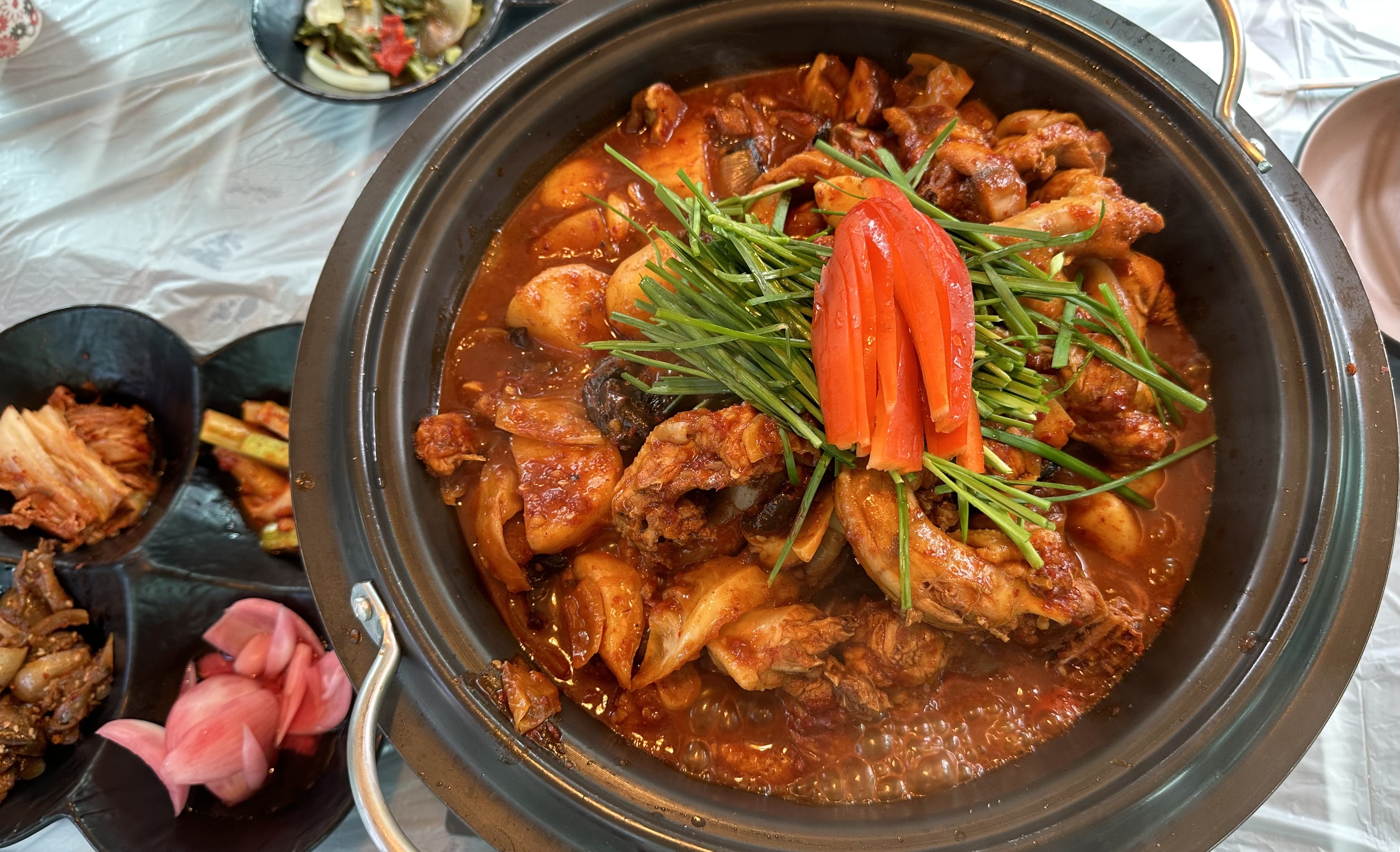 토종닭은 두어 번 먹어본 적이 있는데, 보통 먹는 닭고기보다 질길 거라고 예상은 했지만 꽤 질겼다. 그런데 이 집의 특징인지 전라도 닭볶음탕이 그런 건지 모르겠지만, 고추장 베이스로 조금 맵기도 해서 여전히 맛있지 않냐는 추천인만 빼고 썩 즐기진 못했다. 김치를 포함해 너댓 가지 반찬이 우리 입에 잘 안 맞은 것도 아쉬운 대목이었다.