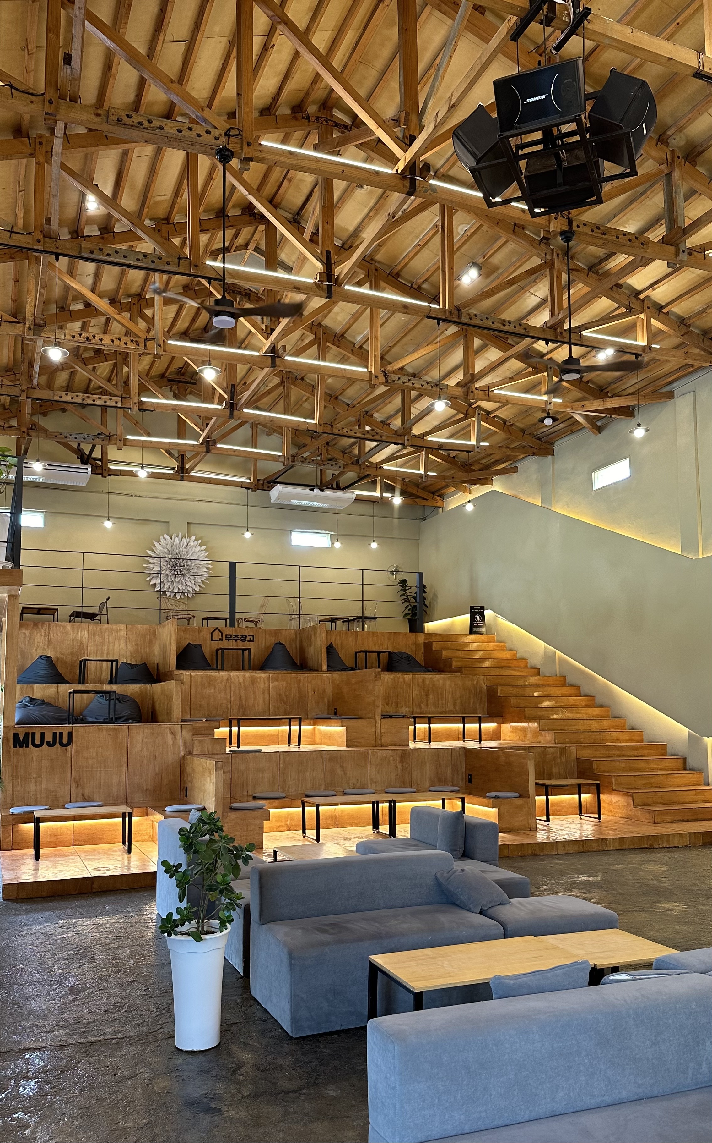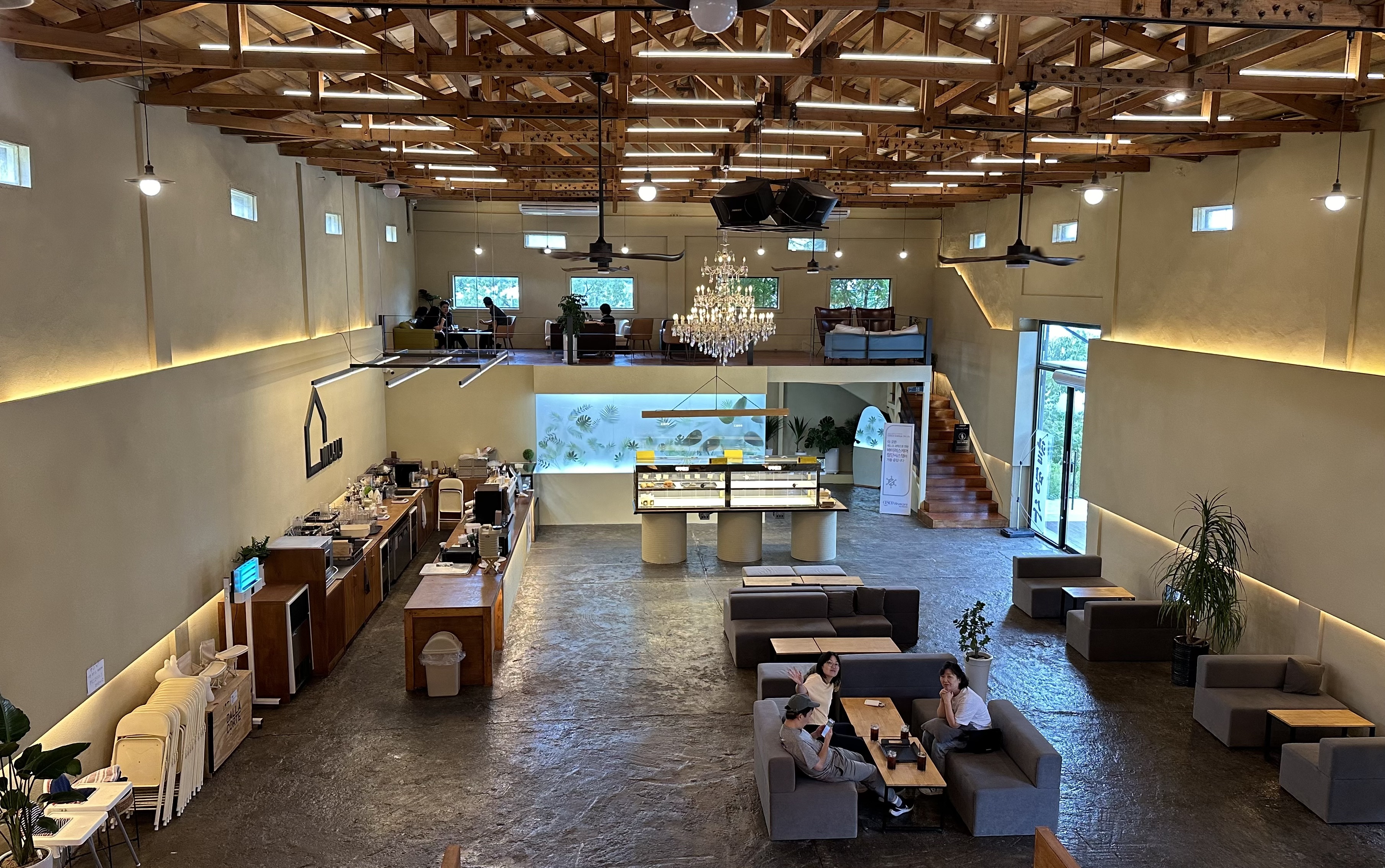 목재로 세련되게 마감한 지붕의 공간감과 작은 창들과 전망창들이 눈길을 끄는데, 넓직넓직하게 배열한 자리는 방해 받지 않는 휴식을 보장하고 있었다. 7,8월 무더위는 지나갔어도 9월초의 한낮은 30도를 넘겨 제법 더웠는데, 최신 에어컨을 어찌나 세게 틀었는지 2층에서 1층으로 자리를 옮겨야 할 정도로 시원했다.