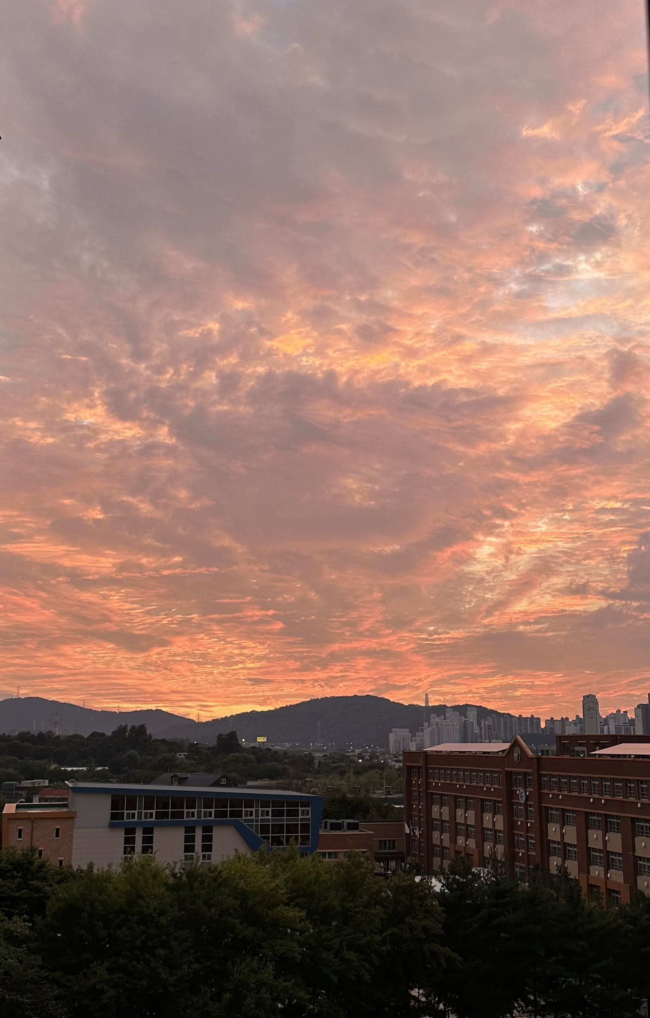 늘 저녁노을(9/11/22)만 감상하다가 어느날 새벽 6시쯤 주방 쪽 베란다에 서니, 검단산 앞 이웃 단지들 사이로 찬란하기까진 아니어도 제법 붉고 아름다운 아침노을이 펼쳐지고 있었다. 조금 일찍 산책길에 나서서 산곡천이나 팔당대교 앞에서 만났거나, 더 일찍 부지런을 떨며 산에 올라 이 시간대에 영접했다면 정말 끝내주었을 것이다.