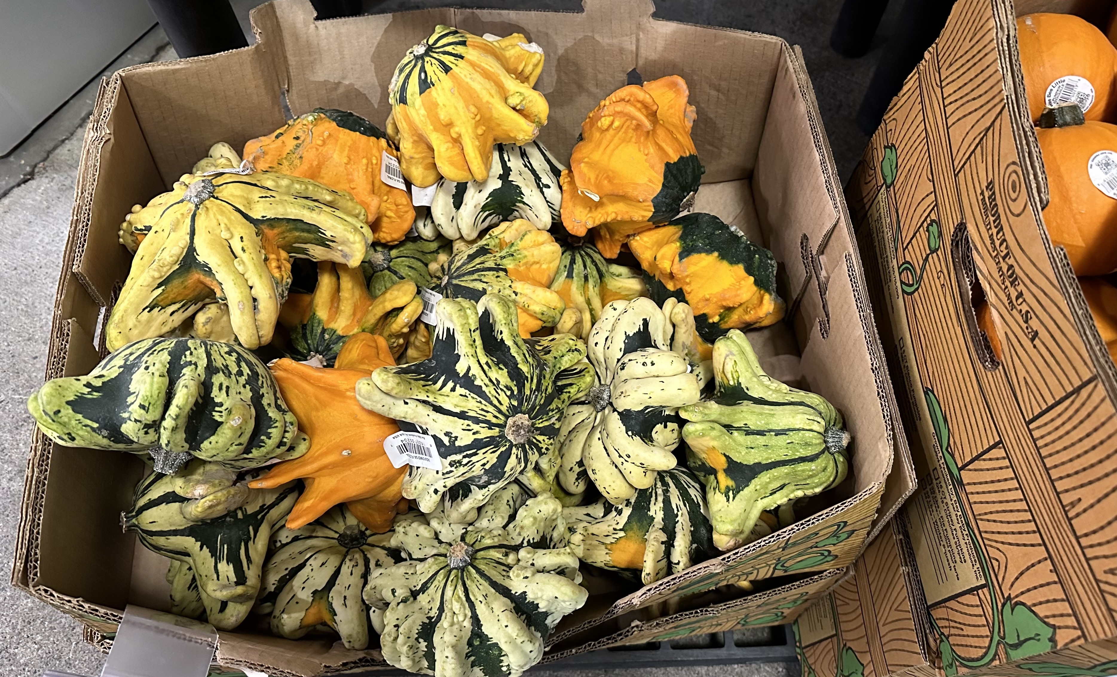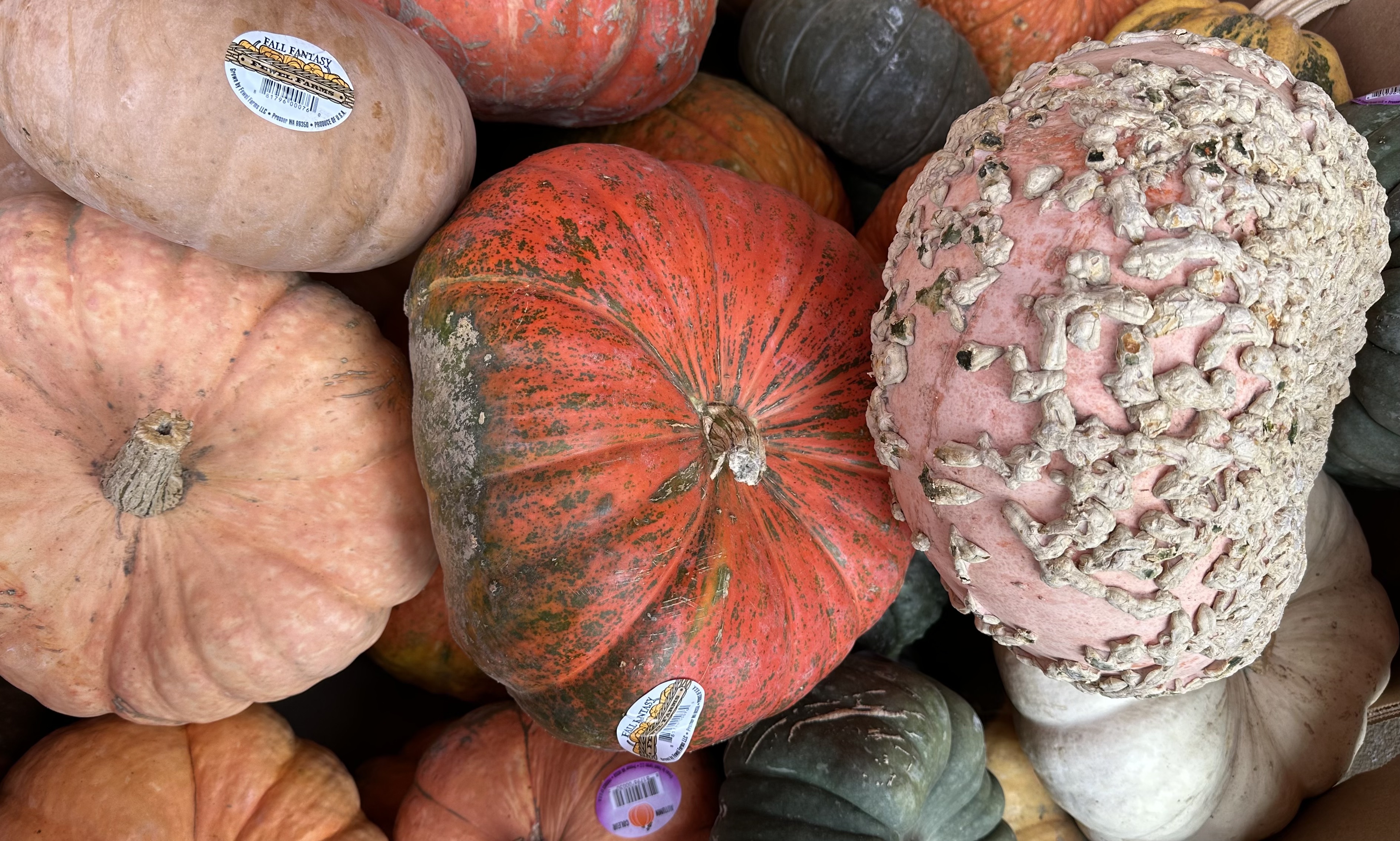 제법 크고 무거워 보이는 것들도 많은데, 일단 호박들의 색깔이 다양해 눈길을 끌었다. 겉이 매끄러운 것도 있지만 우둘투둘한 것들도 많았다. 아예 특이하고 우스꽝스럽게 못 생긴 것들은 따로 모아놓기도 했는데, 못 생긴 바나나, 불가사리, 말미잘, 문어 다리처럼 기이하게 생겨 한참을 바라보게 만들었다.