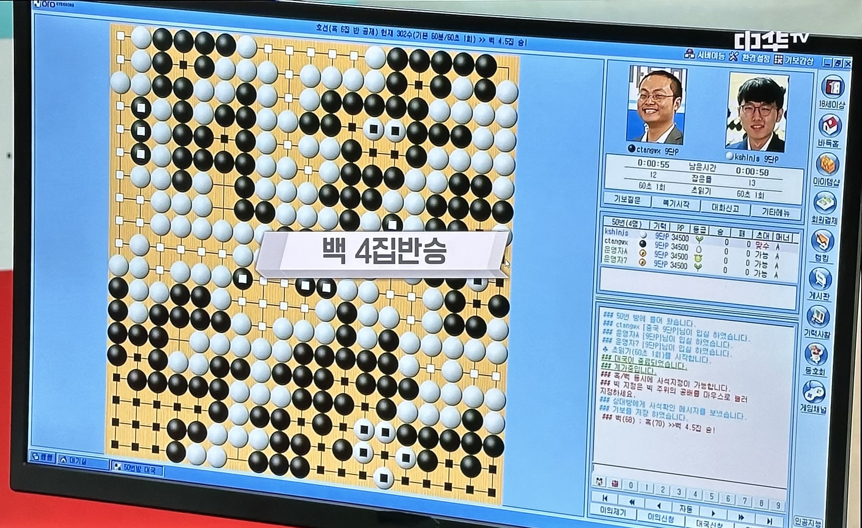 두 대국자의 표정에서 짐작할 수 있듯, 백은 조금 여유 있어 보이고, 흑이 밀리는 형국이었다. 바둑 고수들이 판을 못 읽을 리 없는데, 흑은 돌을 던지지 않고 계가까지 가서 덤으로 진 것 같았다. 포기하지 않으면서 상대의 실수를 노렸던 건지, 아니면 다음 대국을 위한 공부로 끝까지 던지지 않은 건지 그 속내까진 알 수 없다.