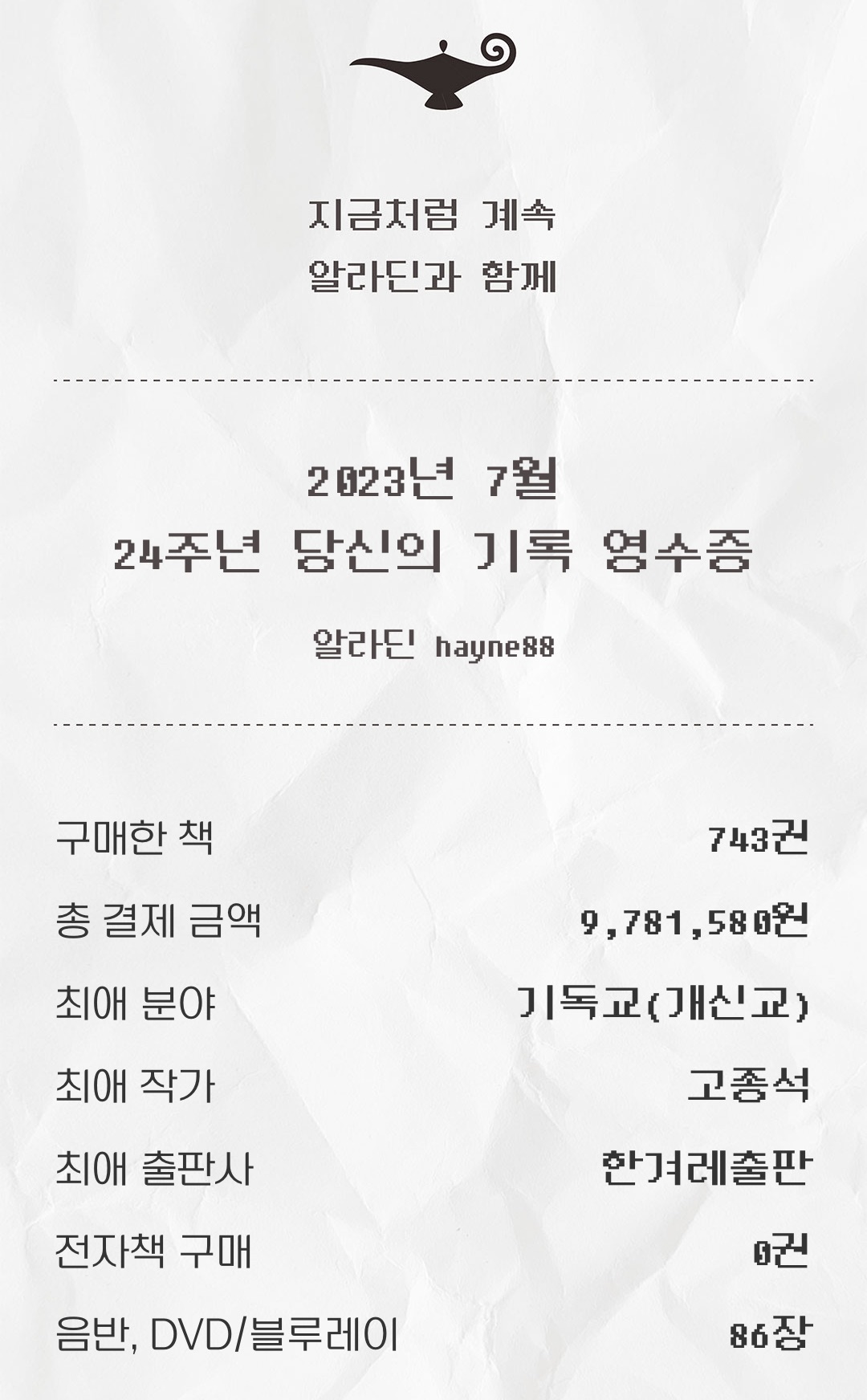 온라인 서점 알라딘이 24주년이 됐다면서 고객 서비스의 일환으로 그 동안 주문한 각종 데이타를 정리해 주었다. 20여 년에 걸쳐 천만원 가까이 썼다는데, 요 몇 년은 있는 책도 정리하느라 바빠 주문량이 줄어서 그렇지, 제법 충실한 고객이었던 것 같다. 이런 영수증을 보낸 건, 올해 안에 천만원을 넘기라는 고도의 마케팅 전략인가.^^