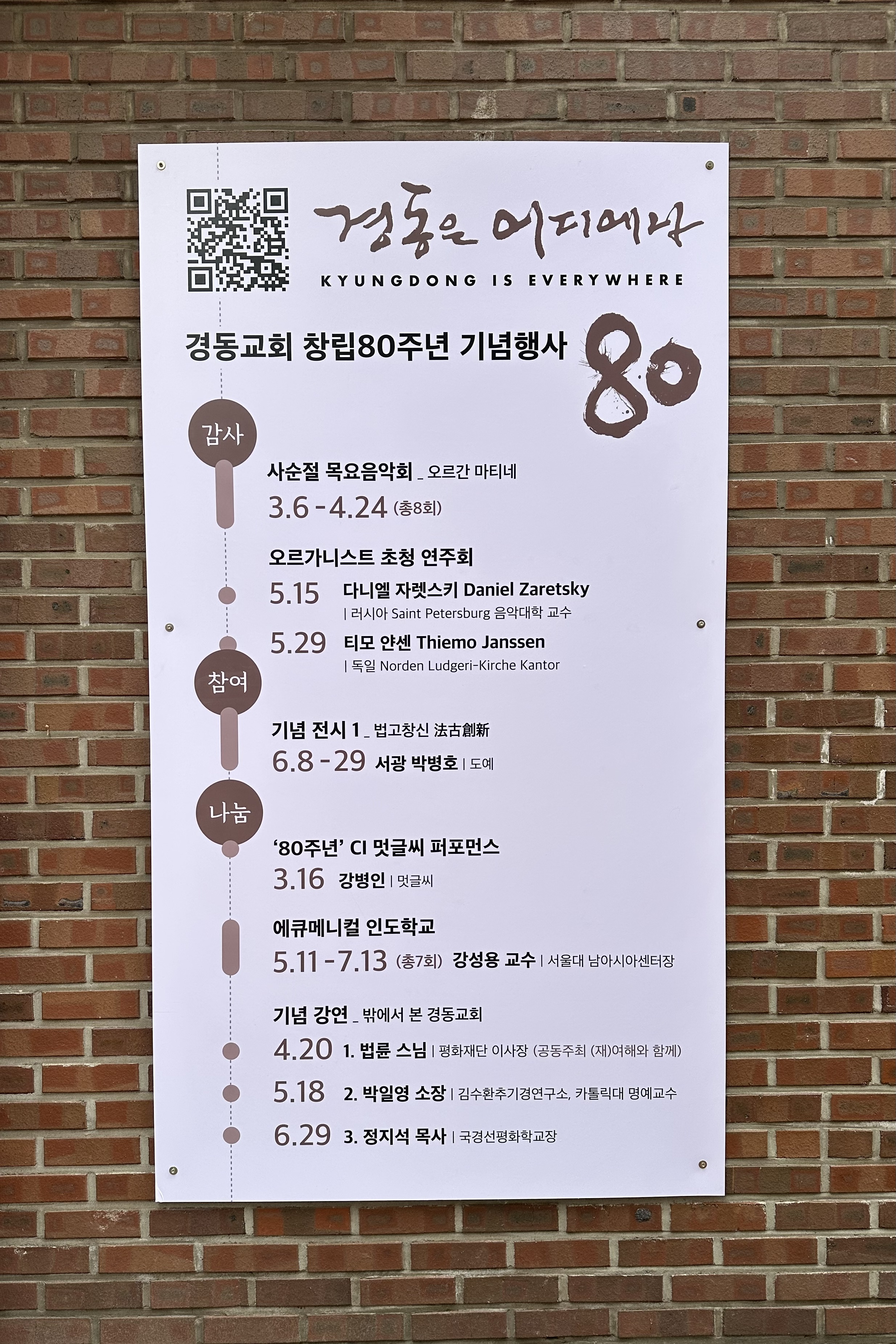교회당 벽에 올해로 창립 80주년을 맞아 열리는 기념행사 안내판이 걸렸다. 12월 첫 주일이 창립 주일이니, 하반기 행사도 많이 준비되고 있을 것이다. 지난 주일 오후엔 교회 계단을 올라가면 나오는 여해기념관에서 멋글씨 퍼포먼스가 열렸다. 교회 앞마당에서 하려다가 오전에 비가 와서 계단식 실내 공간으로 옮긴 것이다.