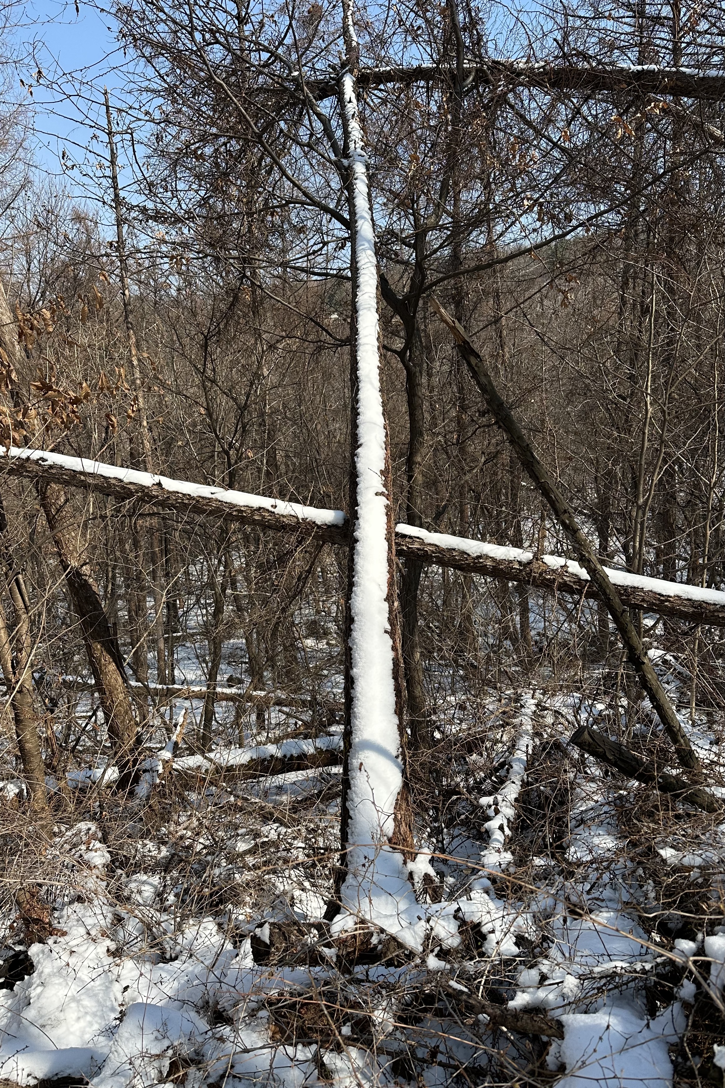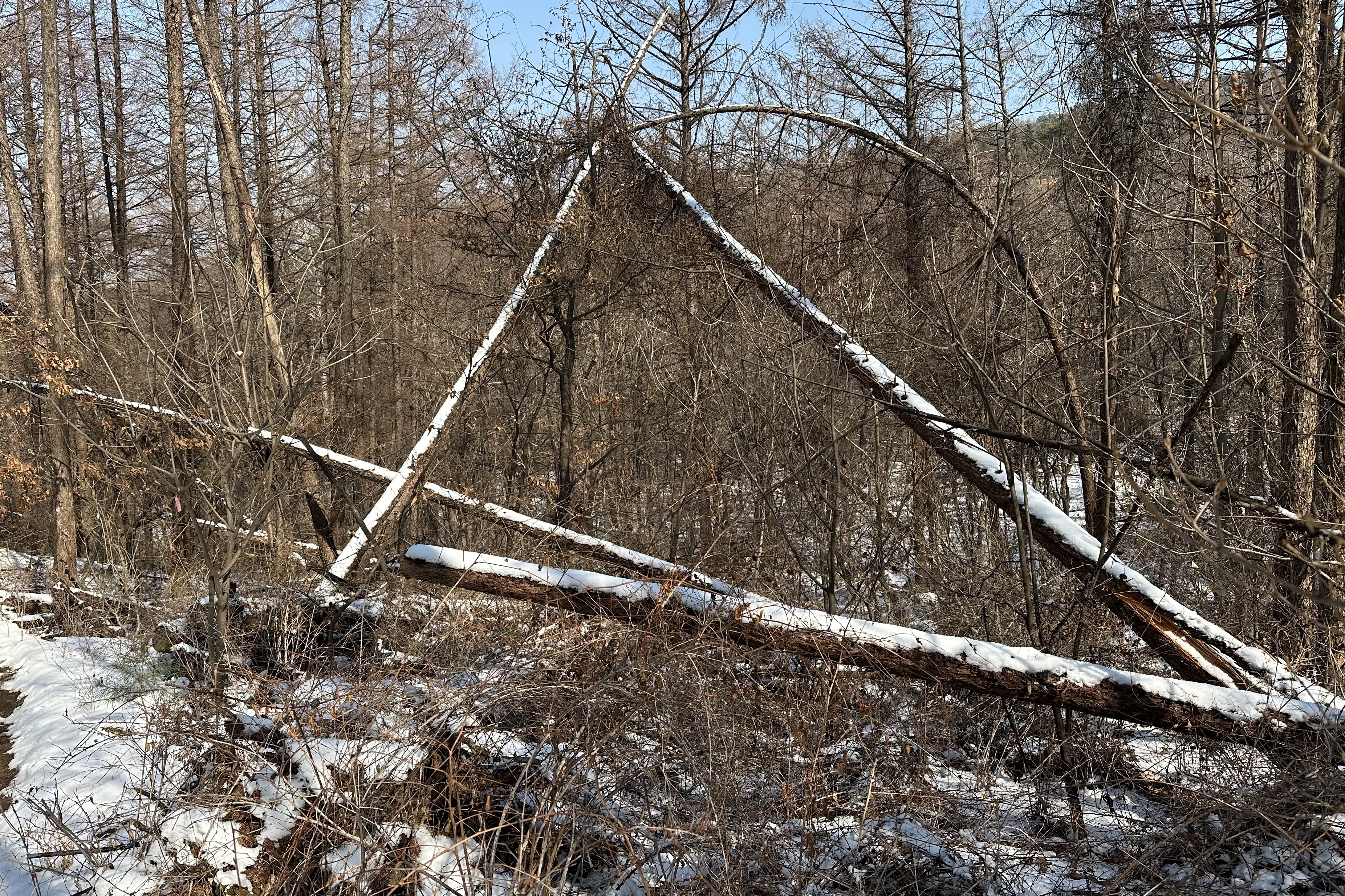 나무를 벤 후 저 멀리 있는 나무에 일부러 걸쳐놓은 것도 아닐 텐데, 옆 나무의 가지에 그것도 나무 둘이 서로 엇갈리는 모양새로 걸쳐 있으면서 삼각형 꼭지점 자리가 된 게 재밌어 보인다. 조금 더 가니 이번엔 서로 교차하며 열 십자 모양으로 쓰러져 있는 나무들도 보였다.