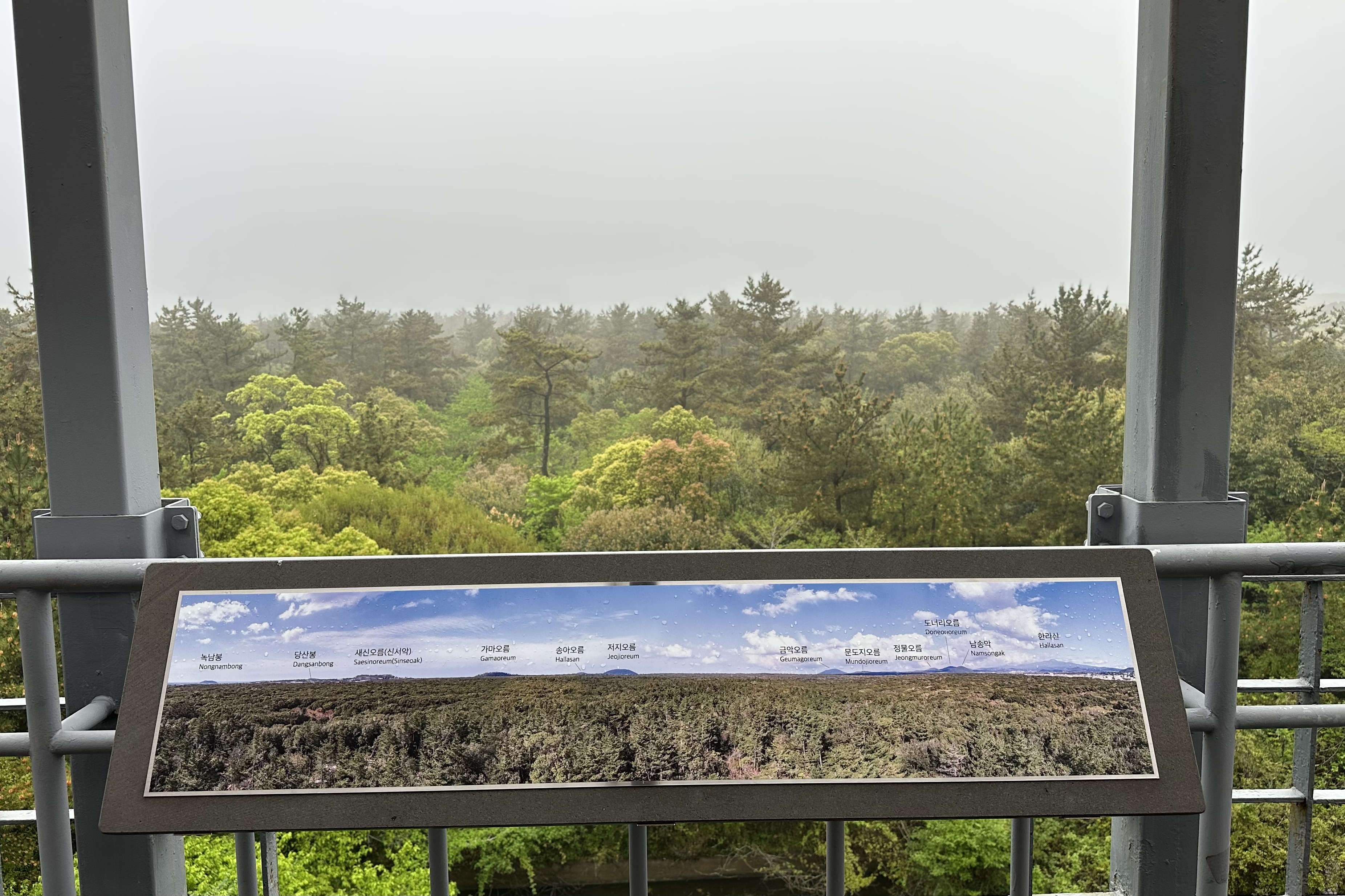 종가시나무, 녹나무, 왕초피 등 다른 데선 볼 수 없는 나무들이 울창했는데, 놀랍게도 현재 이 나무들은 예전에 숯이나 땔감 등의 목적으로 벌채한 후 밑둥에서 새로운 줄기가 자라서 형성된 숲이라니, 나무와 숲의 놀라운 복원력이 새삼 대단해 보였다. 한 시간 정도 걸어가니 4-5층 높이의 사방이 탁 트인 전망대가 나왔는데, 날이 흐려선지 사진에 보이는 것들은 하나도 안 보였지만, 십여 미터 울창한 나무숲의 정수리들을 내려다 보는 것도 즐거운 일이었다.
