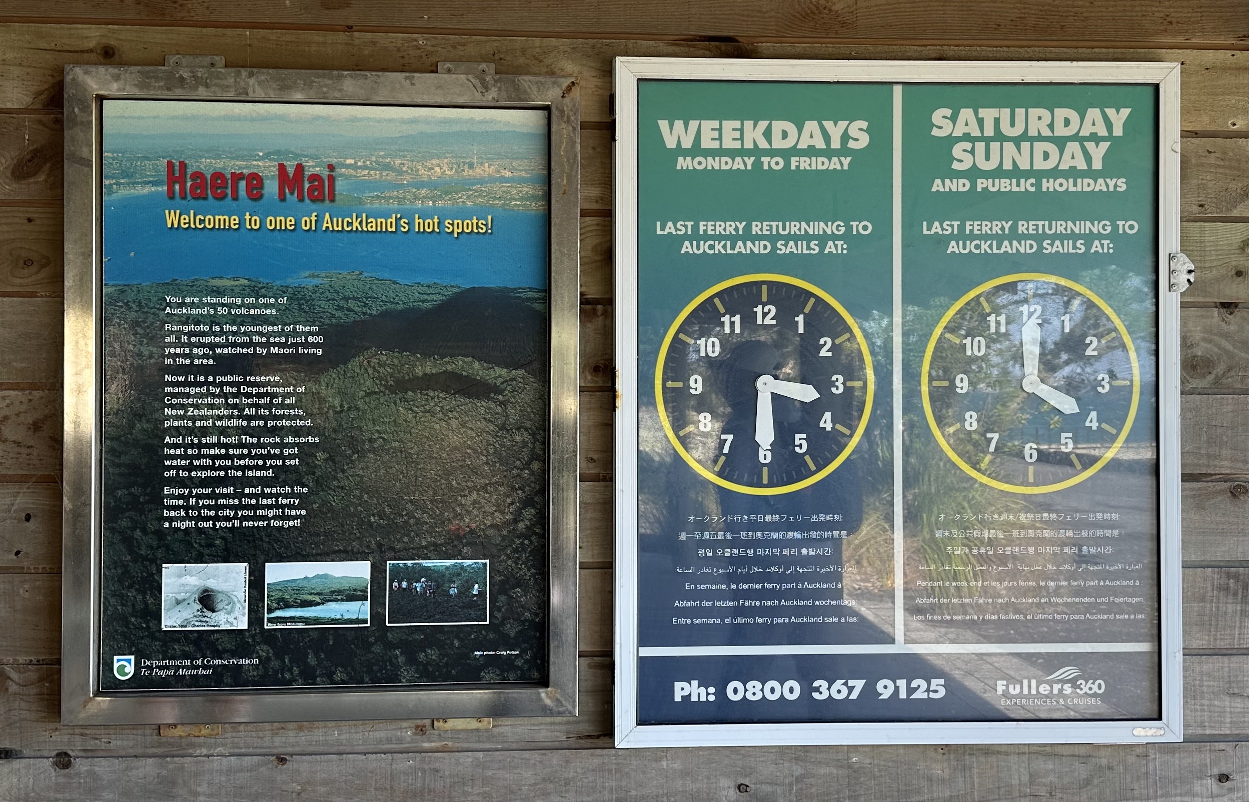 10시 반 페리를 타고 설레는 마음으로 평소엔 안 바르던 선블록까지 바르고, 선착장에 내리니 어떤 풍경과 코스가 기다리고 있을지 개봉박두 두근두근인데, 일단 마오리 풍의 입구에서 기념사진부터 남겼다. 3시 반이 막배라는 안내판이 긴장감을 고조시키는데, 다행히 없다던 화장실이 입구에 보여 안도감을 느끼며 트레킹을 시작했다.