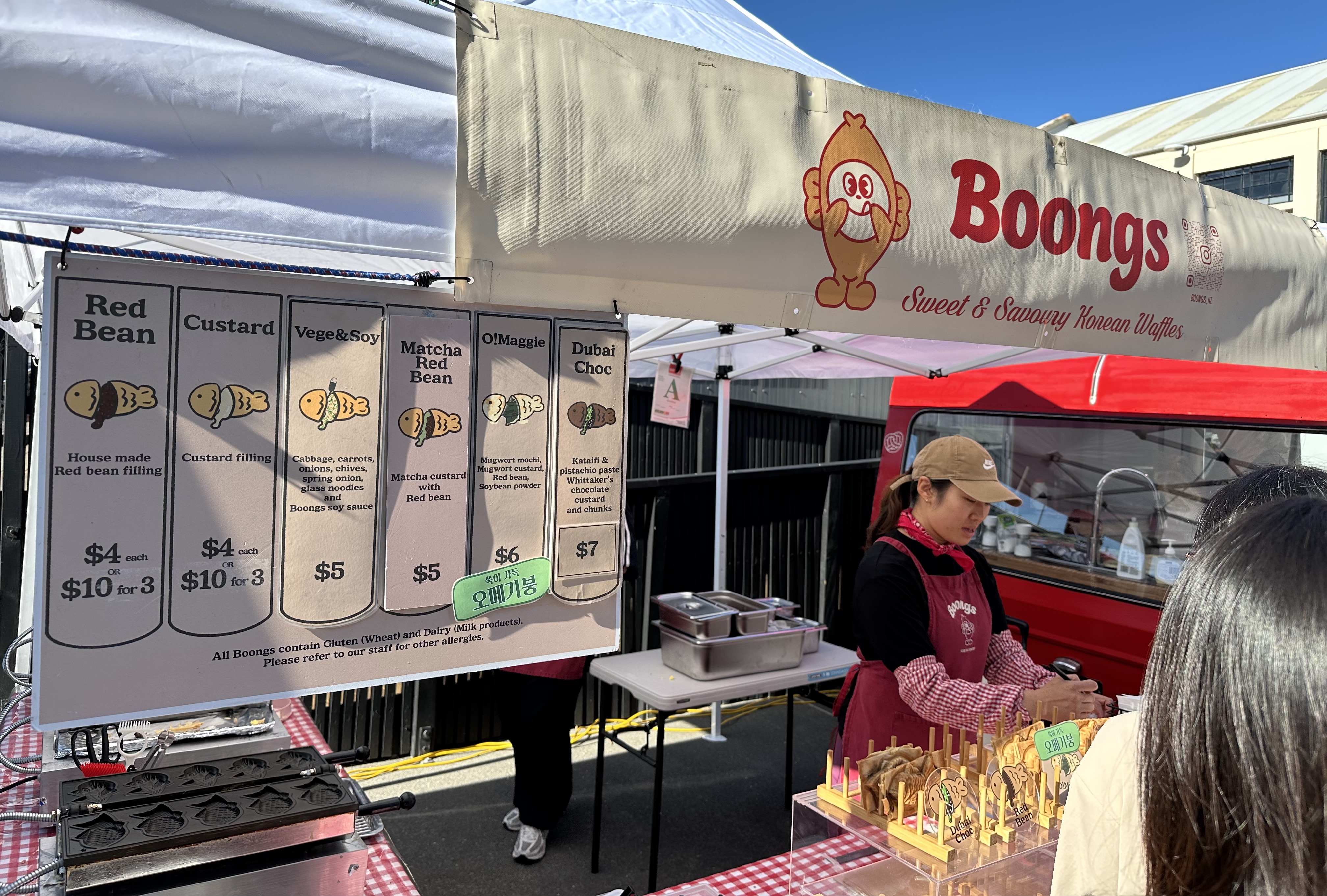 생강으로 음료를 만들어 파는 부스에서 생강 비슷하게 생겼지만 뭔가 다른 게 보였는데, 강황이었다. 한국에서도 제대로 본 적 없는 걸 남반구에서 보게 됐다. 중간 쯤에 '붕스'란 상호를 내건 붕어빵집이 보였다. 교민이 하는 이 붕어빵집은 속에 들어가는 고명도 다양한데, 꽤 인기가 있어 보였다. 붕어 맛은 북반구와 다르지 않았다.^^