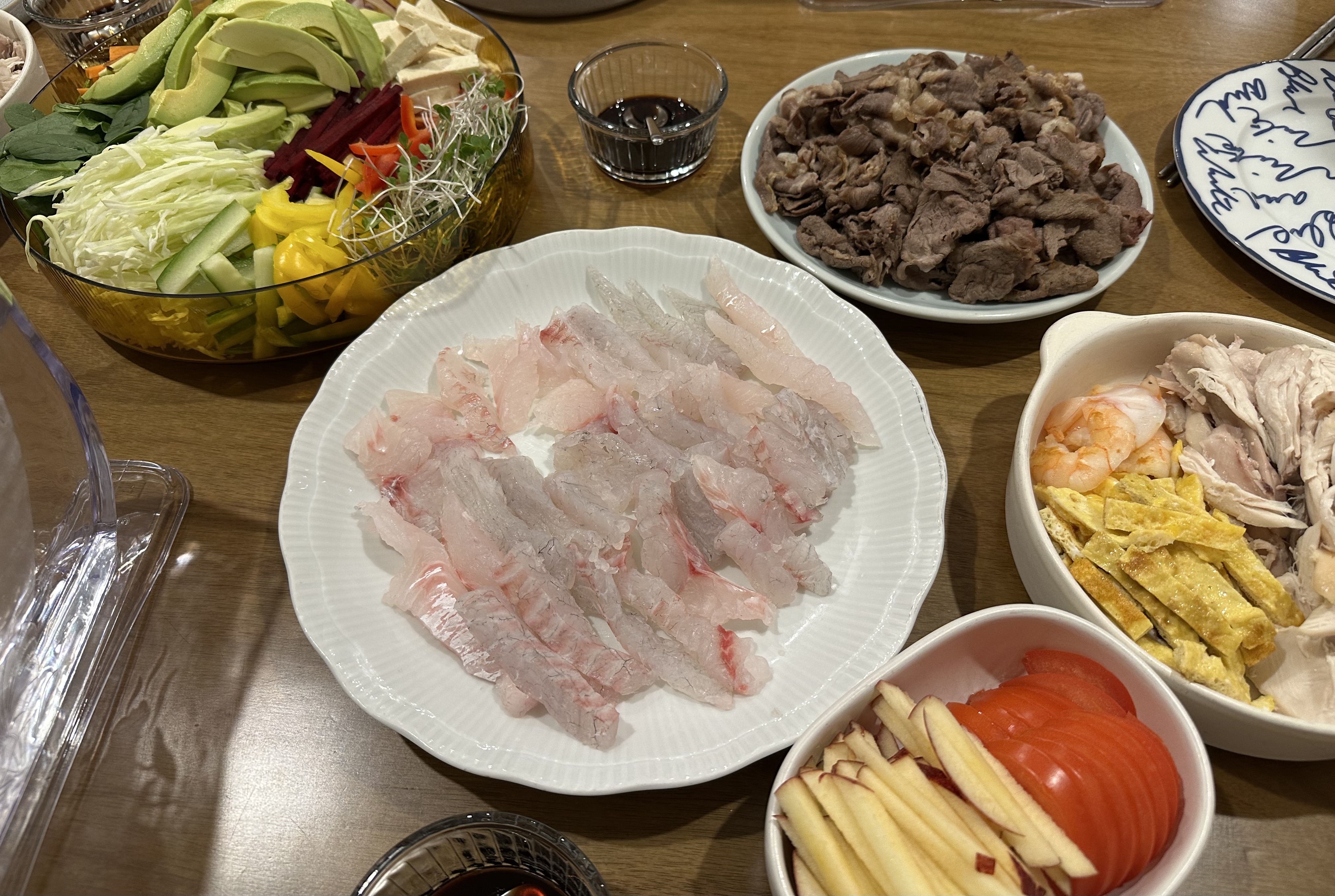 마침 해인이 부친께서 낚시로 잡은 돔을 주셨다면서 사시미도 함께 먹었는데, 이래저래 푸짐한 식사가 됐다. 근처에 사는 윤진, 서영네와 세 가정이 수요일 저녁마다 집에서 남은 반찬들을 가져와 해치우는 모임으로 '웨스트 월남쌈 모임'은 시작됐다는데, 나도 두 번째 함께하는 자리였다. 다음에도 핫팟이든 월남쌈이든 뭐든 먹자!