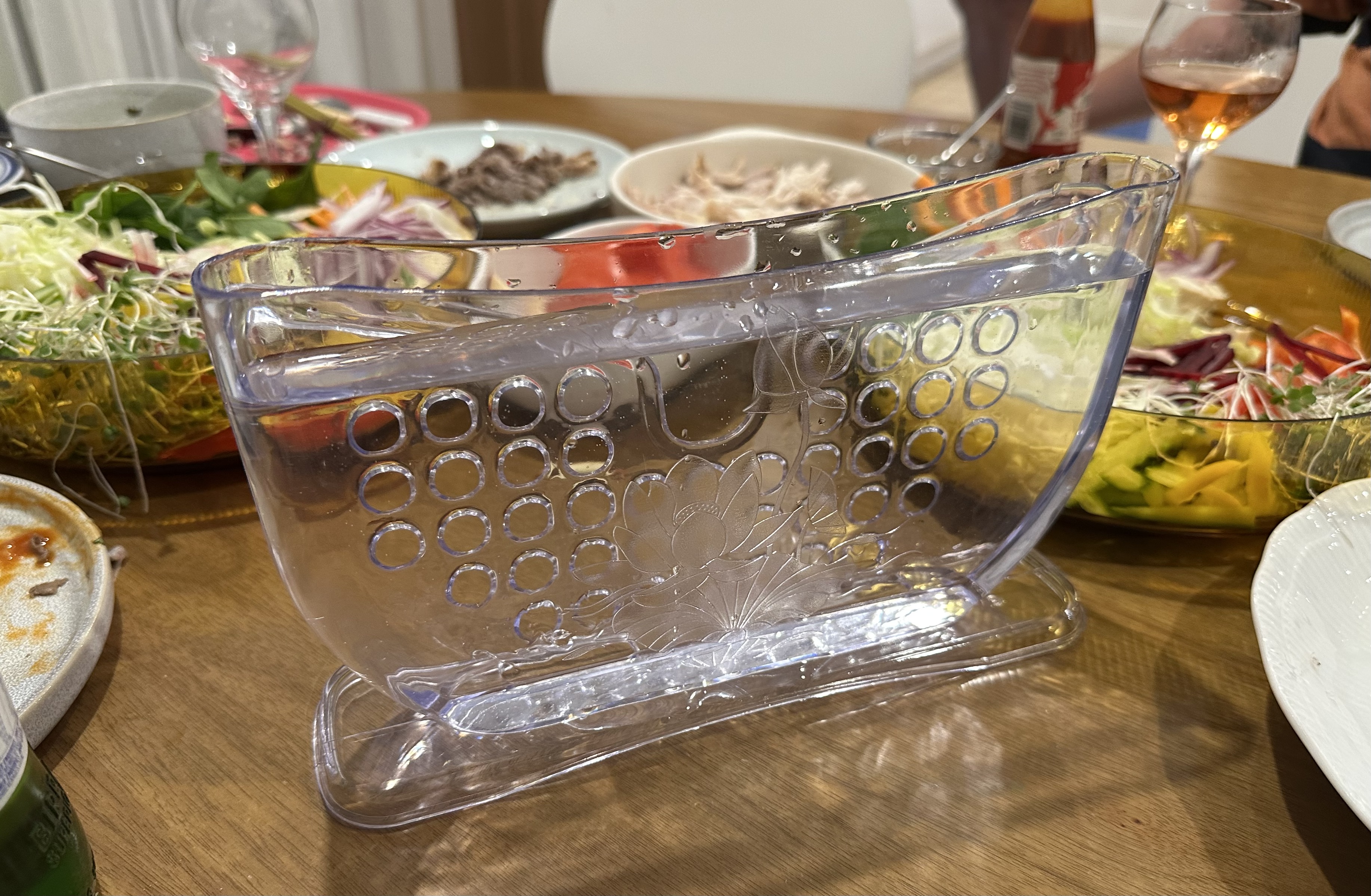 보통 우리는 딱딱한 페이퍼를 뜨거운 물에 넣어 살짝 말랑말랑해진 다음에 재료를 얹어 싸 먹고, 그러다 보면 물이 식어 뜨거운 물을 보충해야 하는데, 이렇게 하면 물을 끓이지 않아도 되니 편해 보였다. 원래 월남쌈은 이렇게 먹는다는데, 지방에 따라 다른 건지, 찬 물에 적시는 페이퍼가 따로 나오는지는 모르겠다.