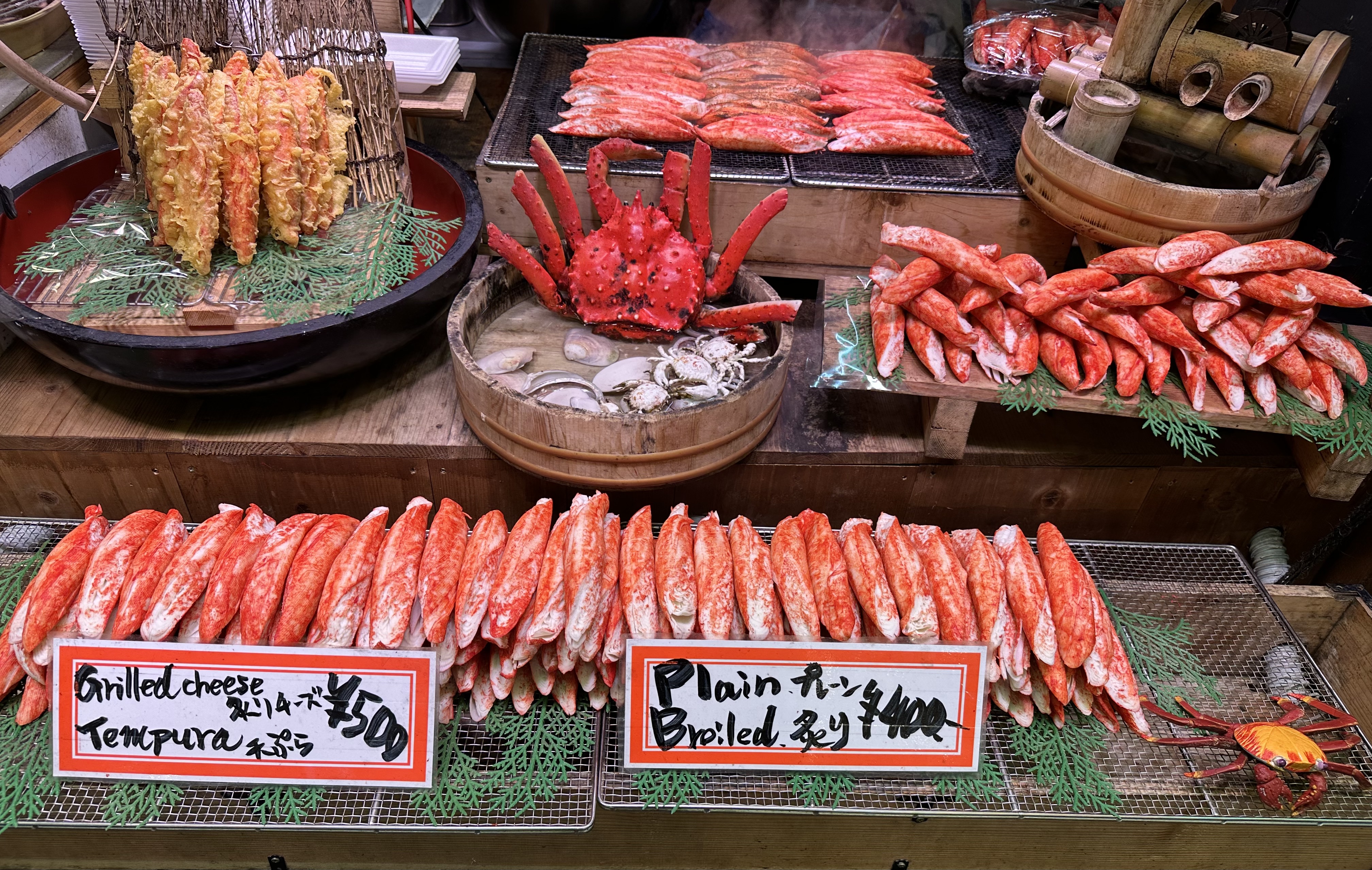 아무래도 즉석에서 군것질할 것들이 많이 보였는데, 싱싱한 굴, 먹음직스런 성게알(우니)이 돋보이는 가운데 게살, 새우 튀김, 장어구이 등도 눈에 들어왔다. 요즘 많이 안 잡힌다는 오징어며, 사케 파는 데도 여러 군데 보였는데, 지나치게 깔끔한 매대가 오히려 덜 매력적으로 여겨져 그냥 둘러만 봤다.