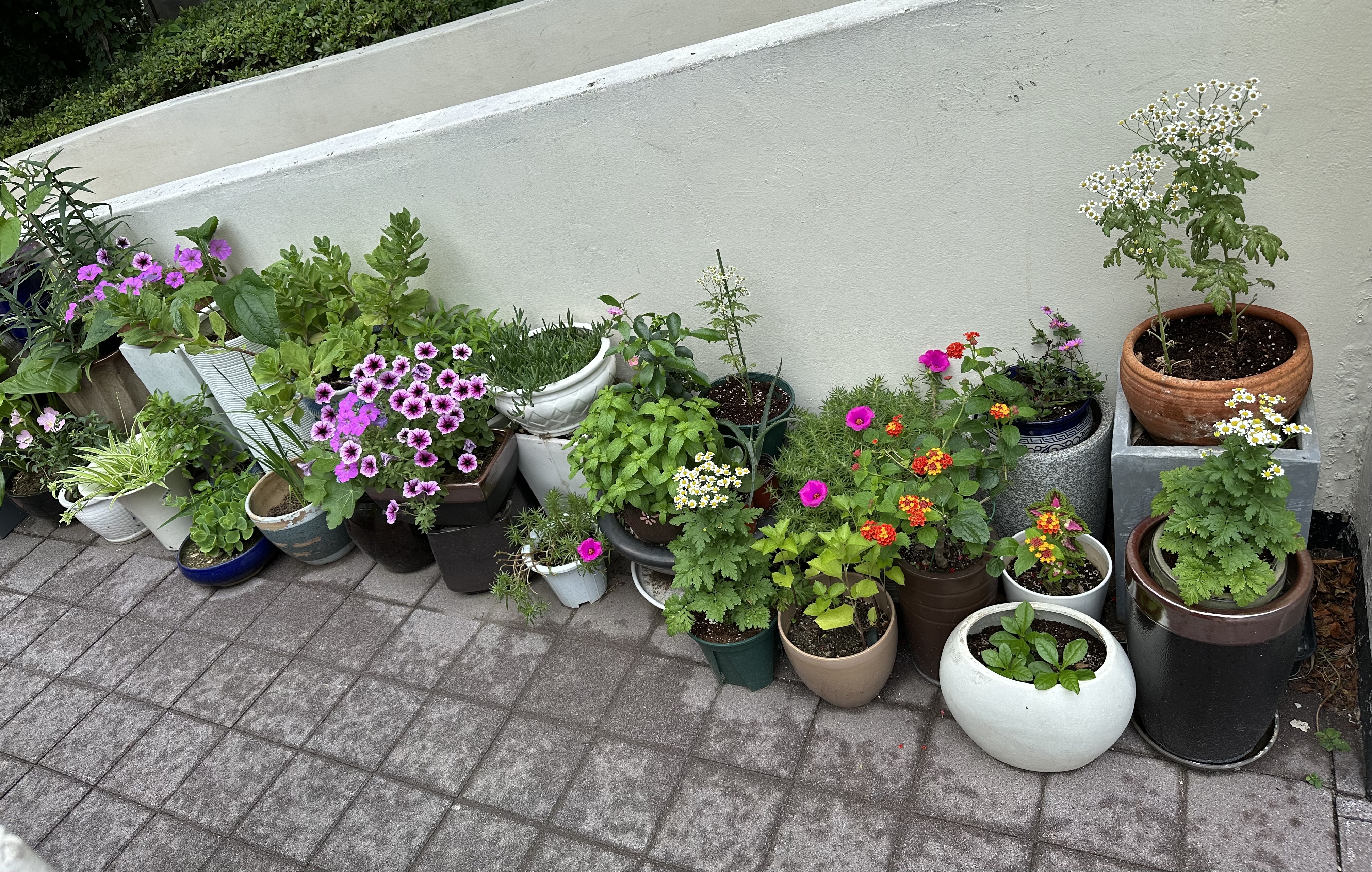 스무 개 정도의 화분은 크기도 다르고 모양도 다른데, 심긴 화초도 달라 옹기종기 올망졸망해 보였다. 그 중 반 이상이 한여름을 맞아 제철이 왔다면서 색색의 꽃을 피워내고 있다. 화단에 연결된 호수와 물통에서 물을 받아 물도 종종 주는 것 같은데, 집안에 있었을 때보다 햇볕은 따갑겠지만, 원래 이런 환경에서 자라던 것들인지라 더욱 빛을 내는 것 같았다.