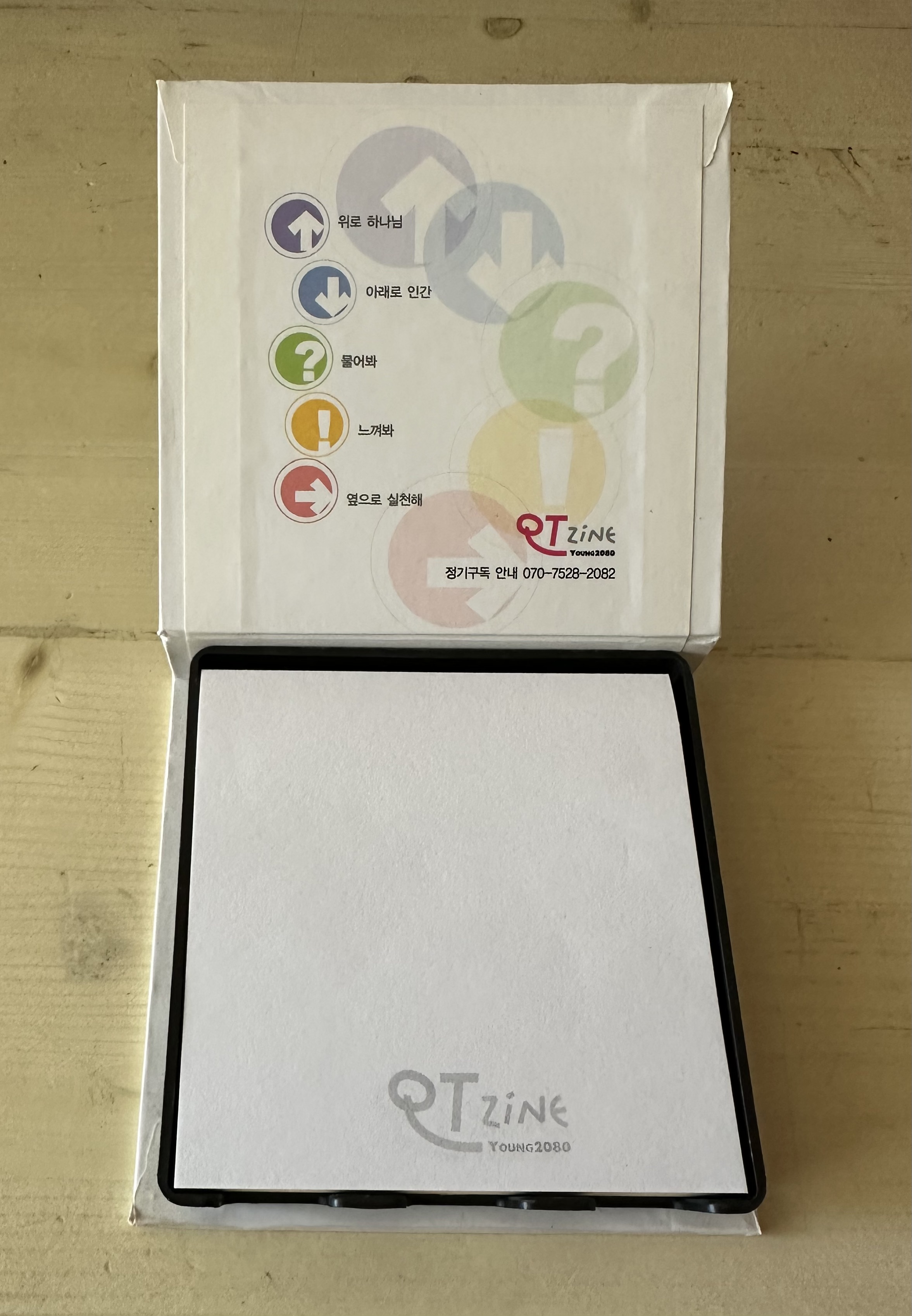 만든 지 15년은 된 듯 싶은데, 3M의 기술력인지 접착력이 멀쩡하다. 오랫동안 <QTzine>표지는 신미식 사진작가의 풍경 사진을 표지로 썼는데, 그 중 작가의 시그니처 격인 바오밥 나무 사진으로 포스트 잇을 만들었던 것이다. 안쪽엔 큐티를 상징하는 큐티 체조의 5가지 아이콘을 넣어 앞뒤로 정체성을 드러내려 했나 보다.