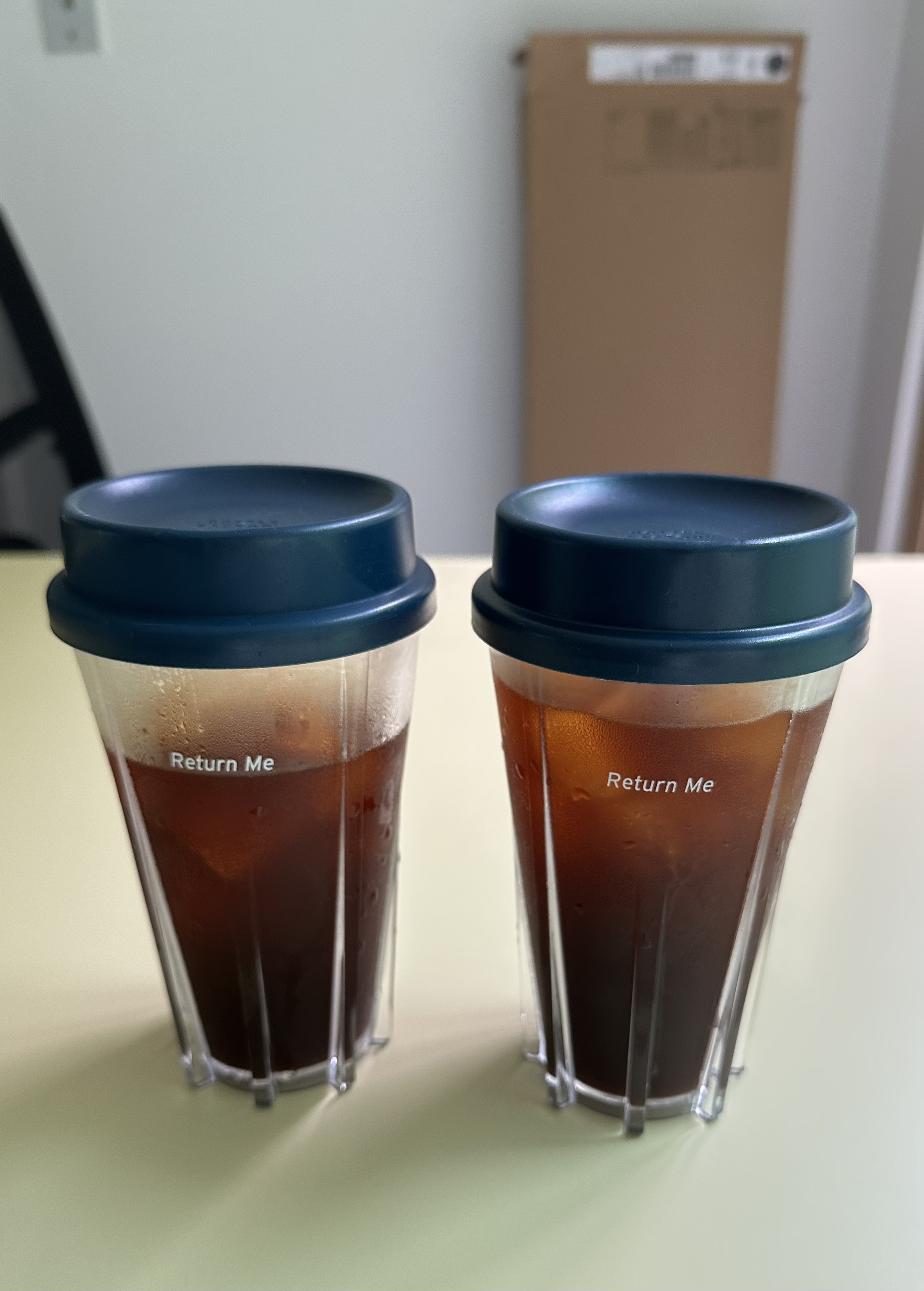 커피잔을 반납하는 곳인데, 테이크 아웃할 때 휴대폰 번호를 남기고 음료와 함께 받은 잘 만든 컵과 뚜껑을 받아와서 마시고 돌려주는 시스템이다. 동네 주민들을 비롯해 단골들이 애용하고 응원할 만한 좋은 정신인 것 같다. 물론 한 번은 아이스아메리카로. 또 한 번은 플랫 화이츠로 마신 커피맛도 괜찮았다.