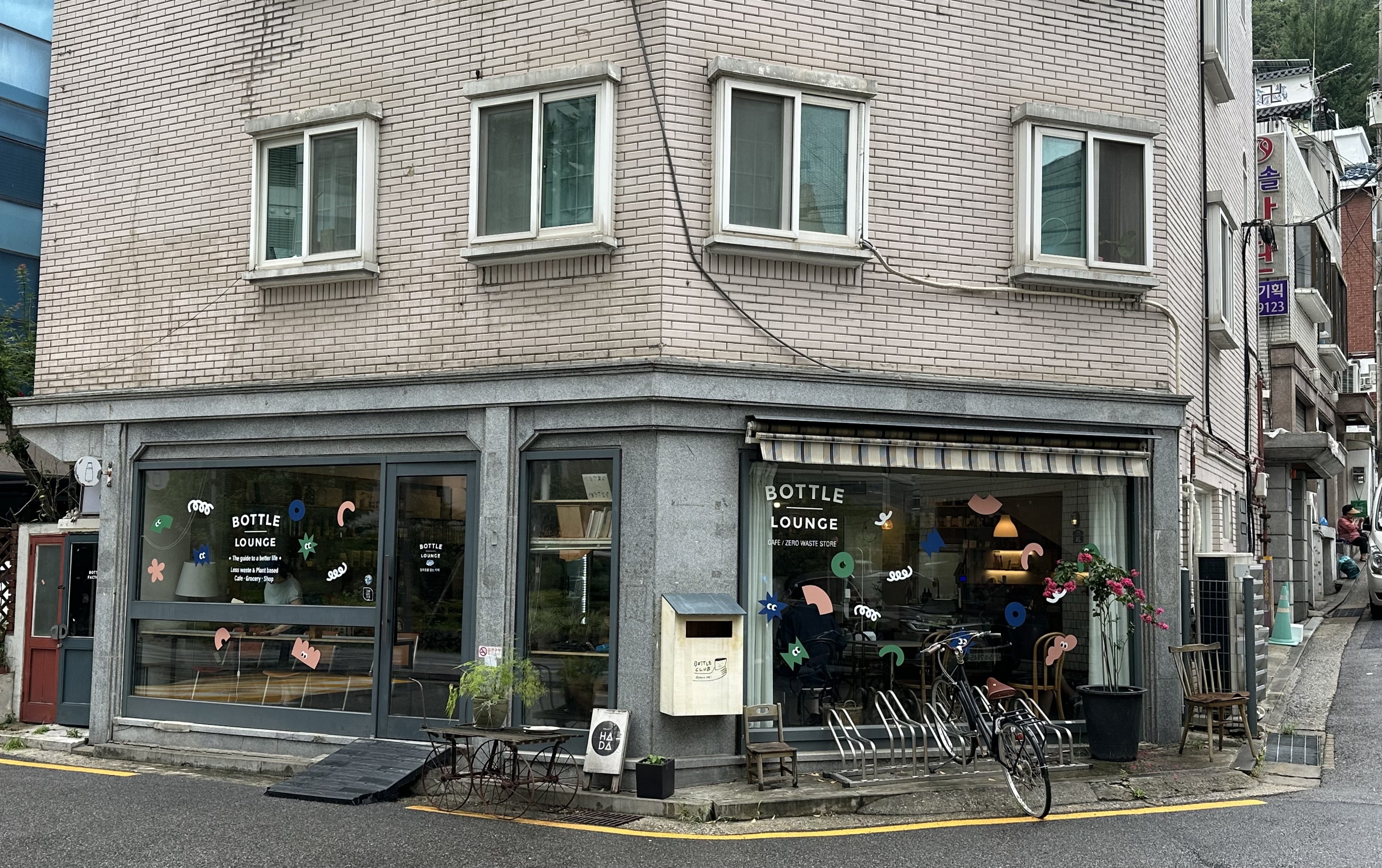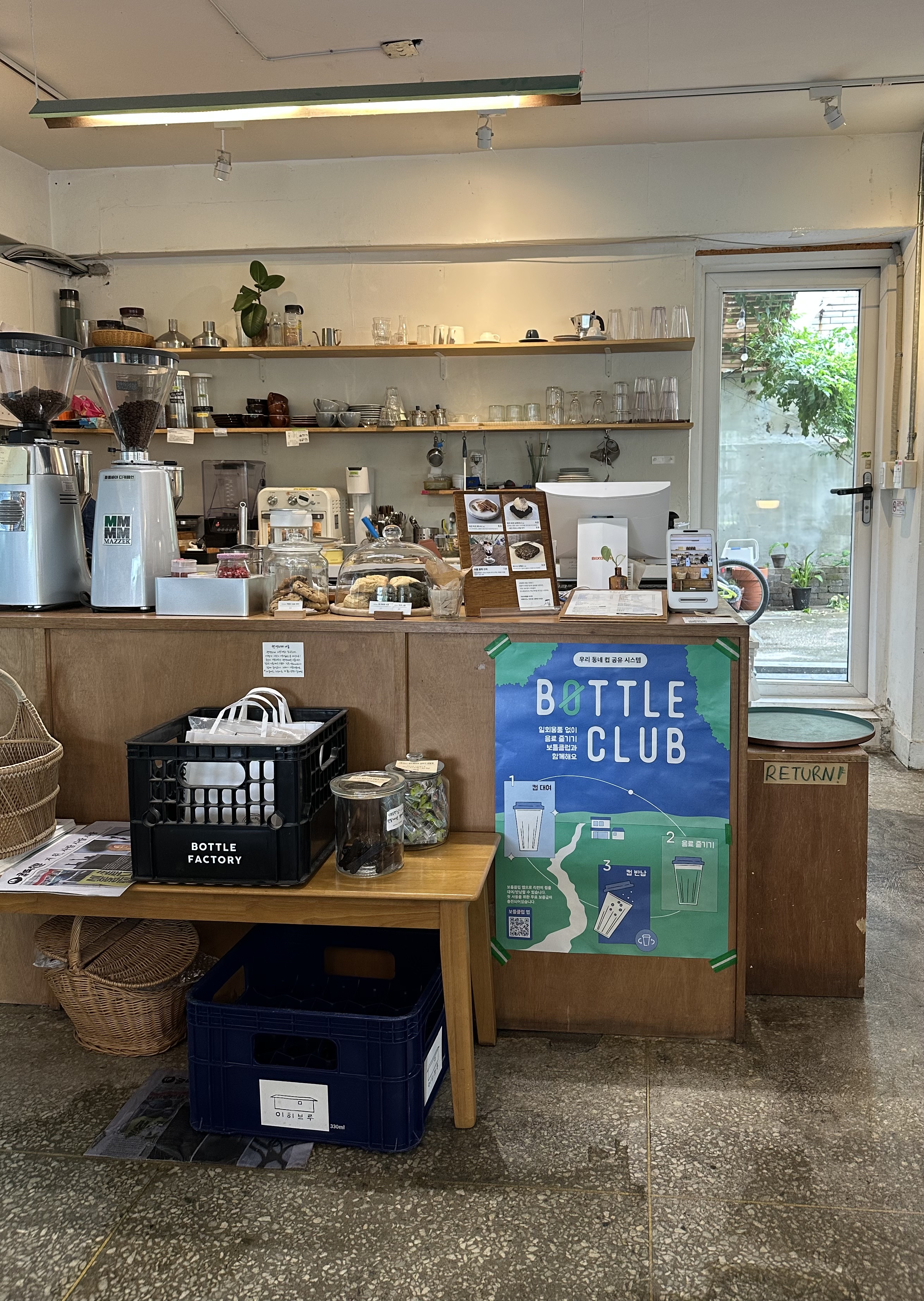 연희동으로 이사한 해인이네 집 근처엔 괜찮은 식당과 카페들이 여럿 있는데, 그 중 바틀 라운지에서 이사하는 날 테이크아웃도 하고, 광복절엔 들어가서 마시기도 했다. 주택가 1층에 자리 잡은 카페는 안팎을 환경을 생각하는 컨셉으로 차분하고 자연스럽게 꾸몄다. 통창으로 꾸민 카페 전면 중앙엔 편지함이나 우체통 같은 게 보여 궁금증을 자아내게 만든다.