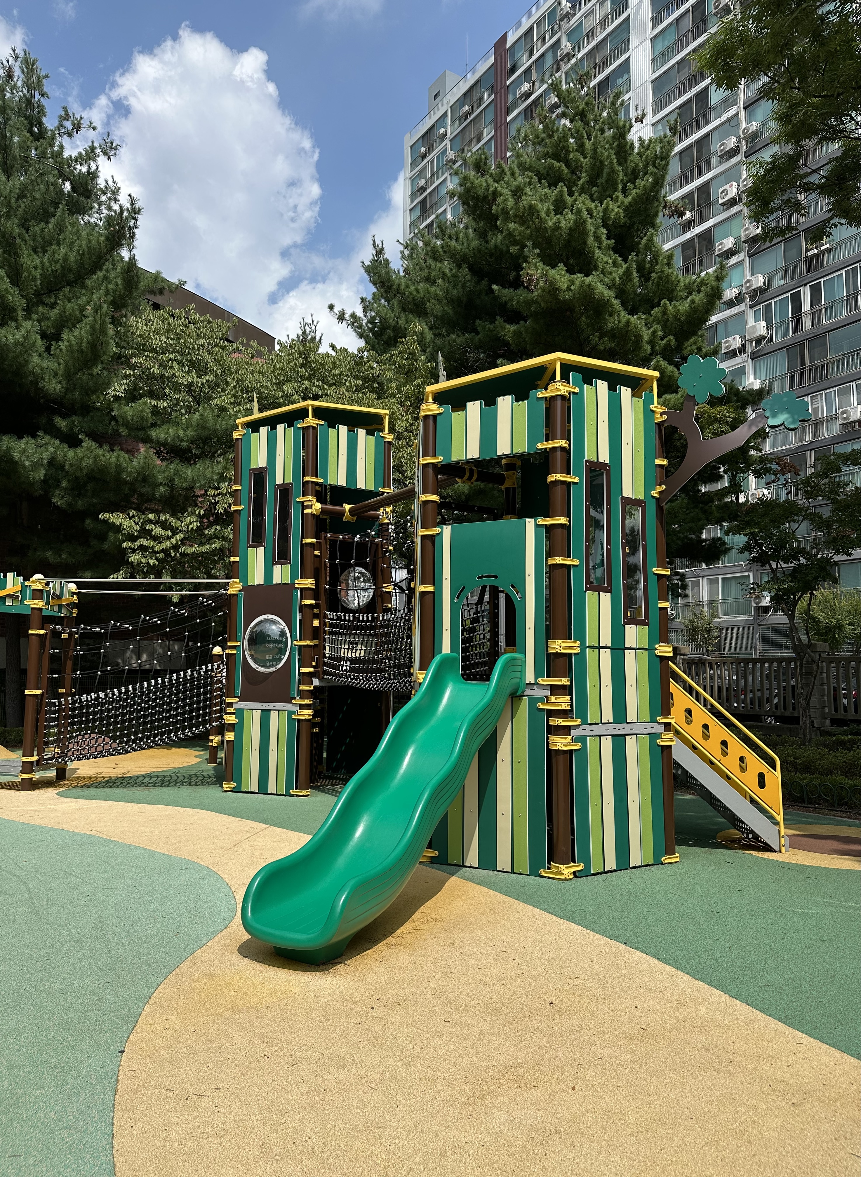 도서관 갔다 오는 길엔 성당 옆으로 놀이터가 보인다. 이것저것 시설도 많고 컬러도 다양한 게 깨끗하고 세련돼 보였다. 대표 놀이 기구인 미끄럼틀도 아이들이 반할 정도로 잘 만들어 놓았고, 그네와 철봉, 아이들이 방방 뛰어노는 트램펄린과 모래 언덕도 나무를 밟고 올라갈 수 있도록 제법 경사지게 잘 만들어 놓았다.
