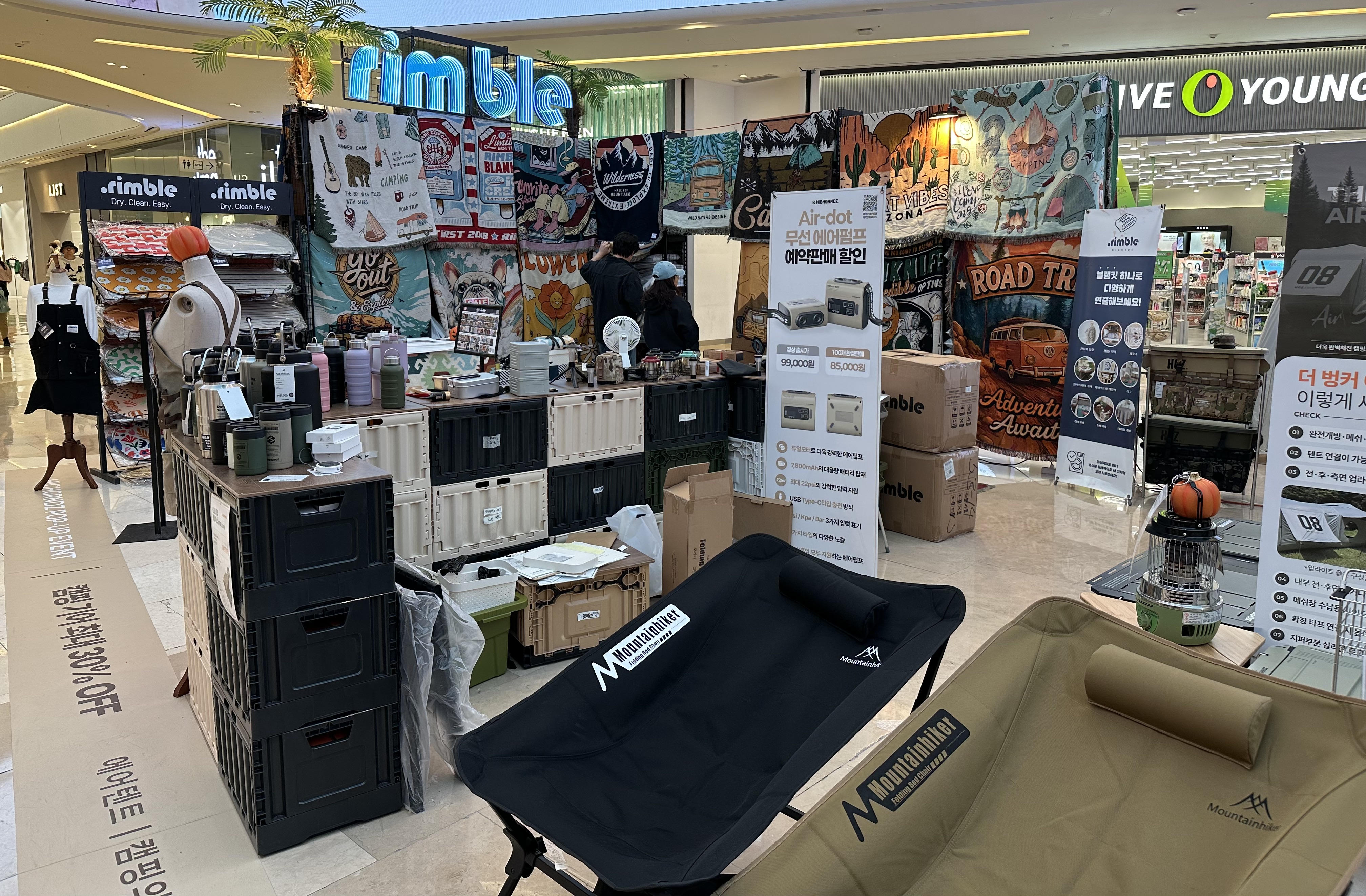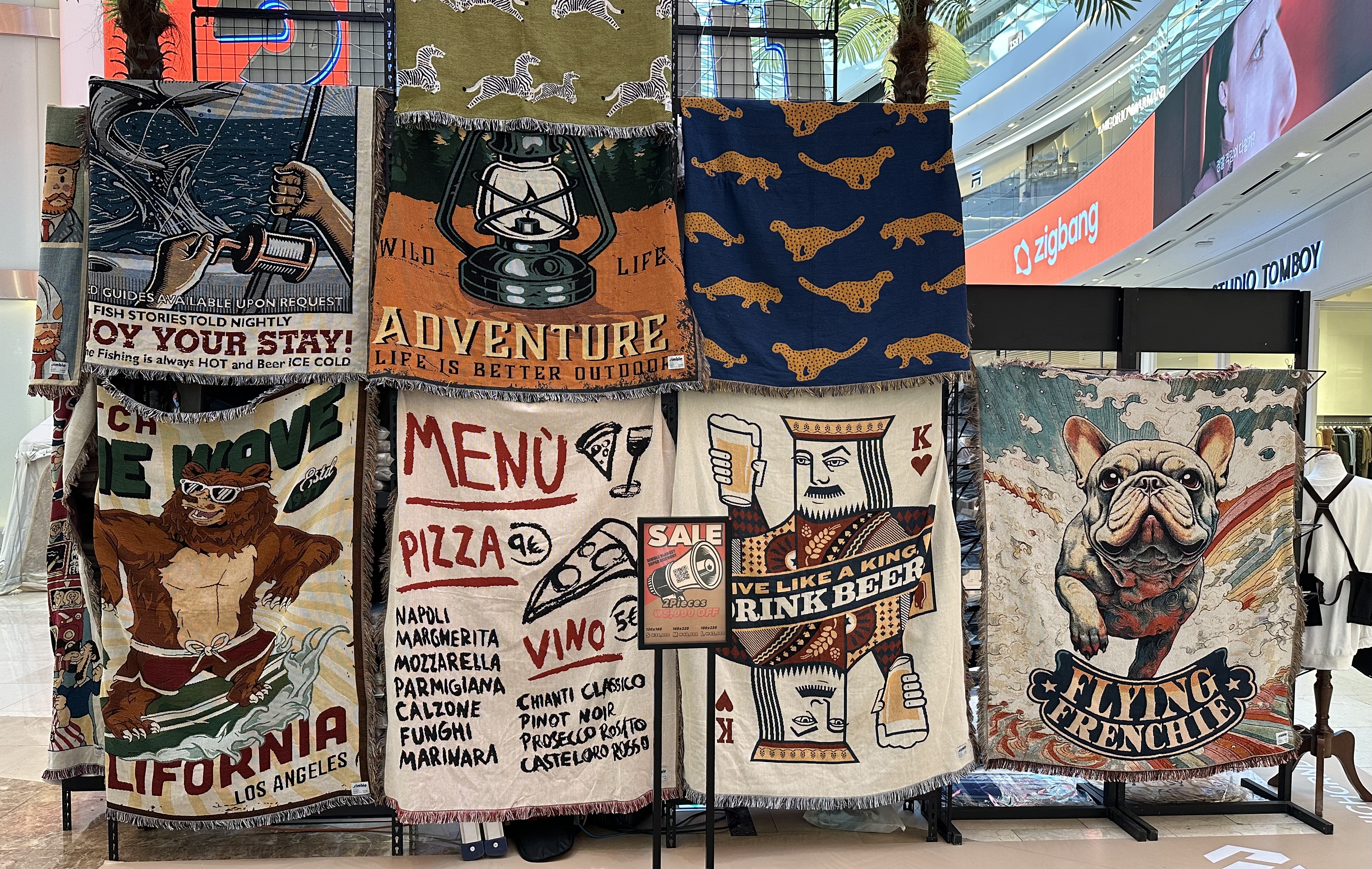 블랭킷은 러그나 담요 정도로 볼 수 있는데, 다양한 그림이나 디자인이 눈길을 끌었다. 캠핑과 피크닉에 유용하게 쓰는 건 물론이고, 카 시트나 릴랙스 의자를 감싸거나 벽면에 거는 등 다양한 용도를 알리는 배너도 흥미를 북돋워 주었다. 하나 정도 있으면 이리저리 유용하게 활용할 수 있는 아이템으로 보였는데, 일단 아이쇼핑을 했다.