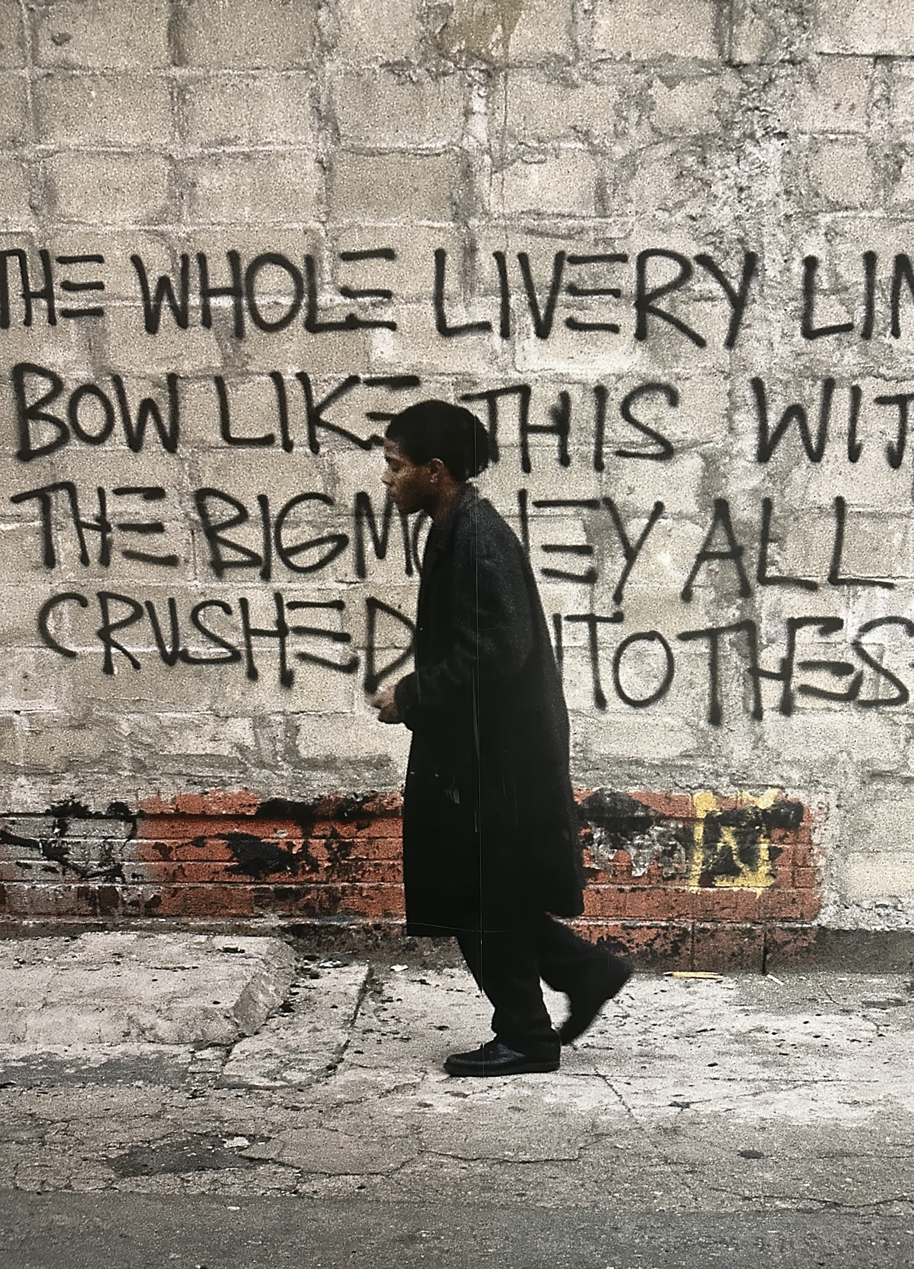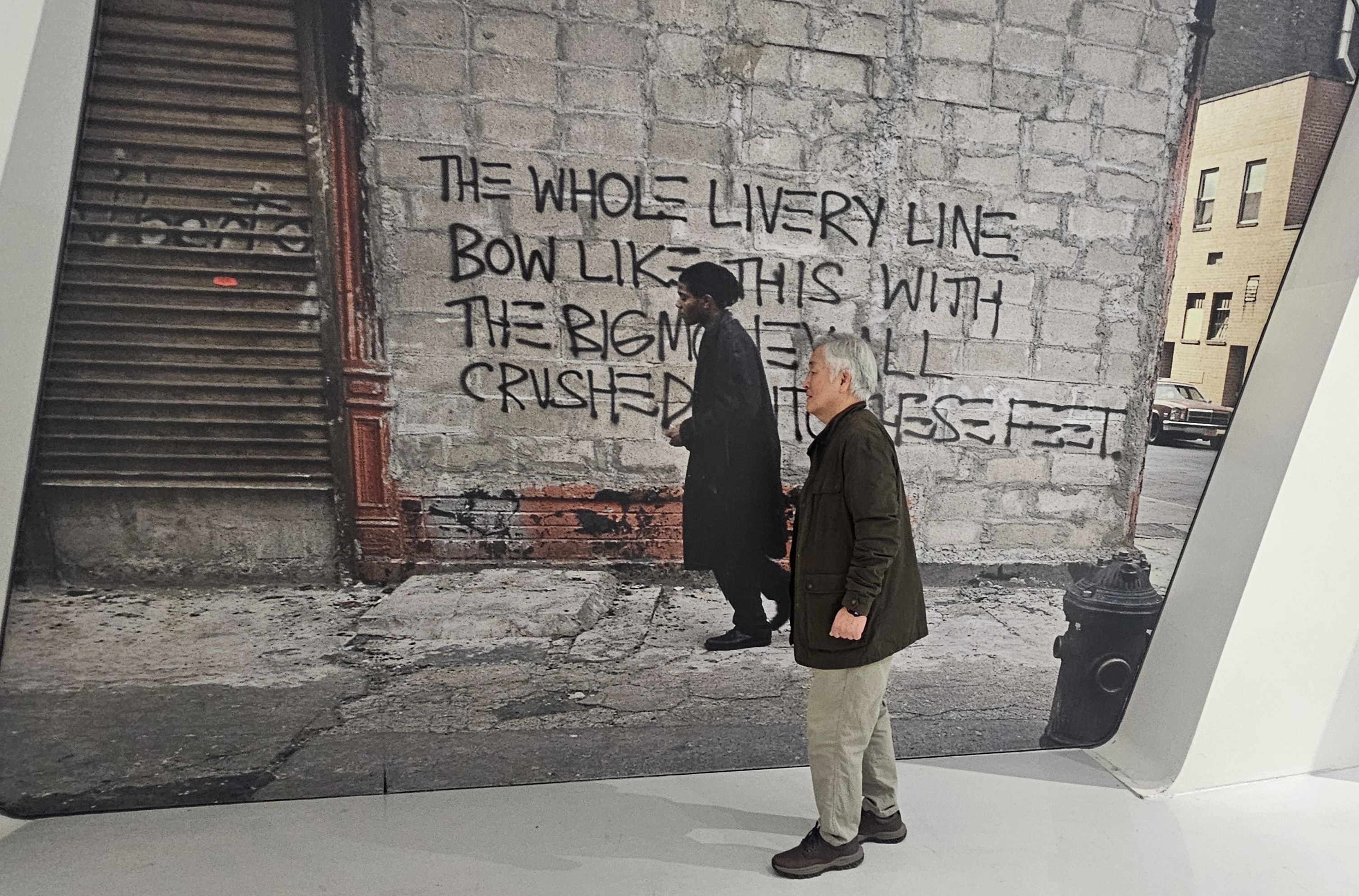 11월에 바스키야 전(11/26/25)에 갔다가 입구를 장식하는 차분한 거리 그림 사진에 마음을 뺏겼다. 그가 살았던 뉴욕 할렘 가의 어느 거리인듯 싶은데, 담벽에 라카로 반듯하게 쓴 대문자 문장을 배경으로 진한 바바리를 입고 무심한듯 걸어가는 노숙자 풍의 흑인 청년을 포착한 분위기가 아주 그럴듯해 보였다.