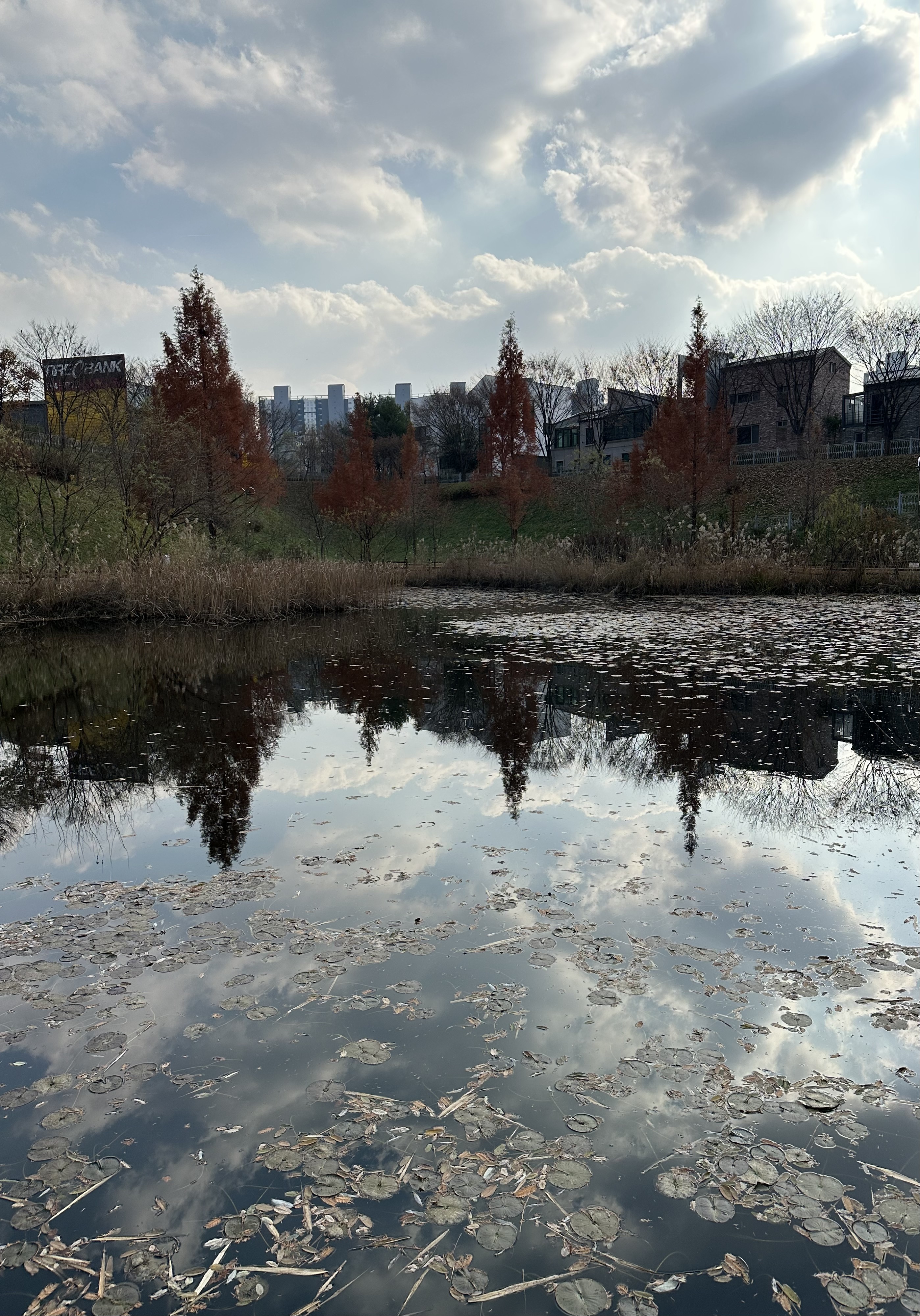 어느 날 집에서 강변산책 대신 다시 걷고 싶어지는 길인데, 얼추 40분 정도면 걸어갈 수 있을 것 같다. 눈으로 봤던 풍경이 사진으로도 잘 나왔는데, 여기도 계절에 따라 색다른 풍경을 보여줄 것 같다. 무슨 공원인지, 호수 이름은 있는지 찾아봤지만, 아무런 이름이 없는 게 더 신비롭고 자연스러워 보인다.