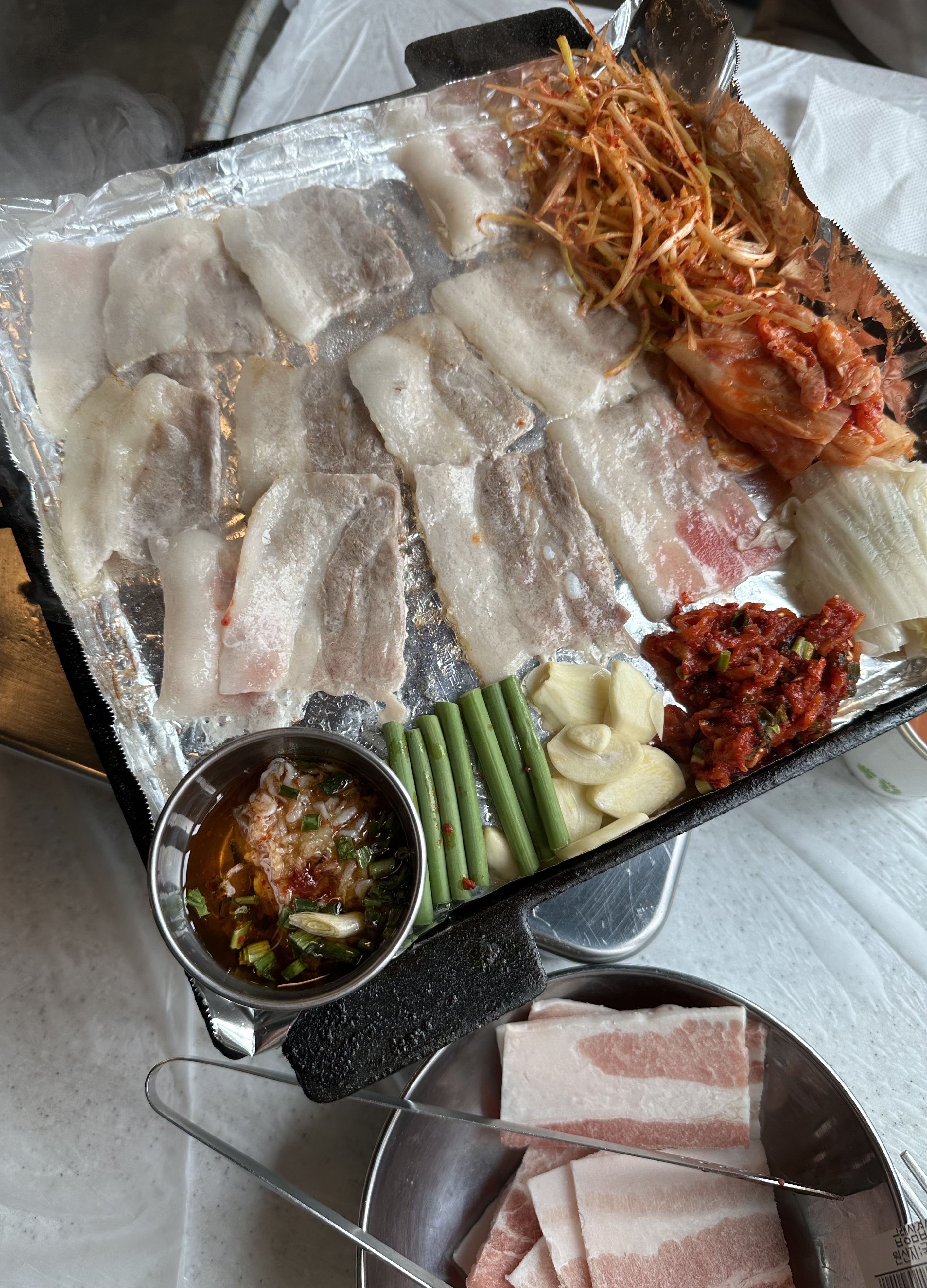 이 집은 불판이 달궈지는 동안 반찬을 오봉에 가득 담아내오는데, 작은 스덴 종지만 열 개여서 비주얼에서 일단 먹고 들어간다. 그런데 자세히 보면, 실제 반찬은 단출한 편이다. 김치와 파절이, 마늘 등 불판에 올릴 것들이 많은데, 삼겹살이 구워지면서 내뿜는 기름에 둘러 먹는 재미와 맛이 괜찮다.