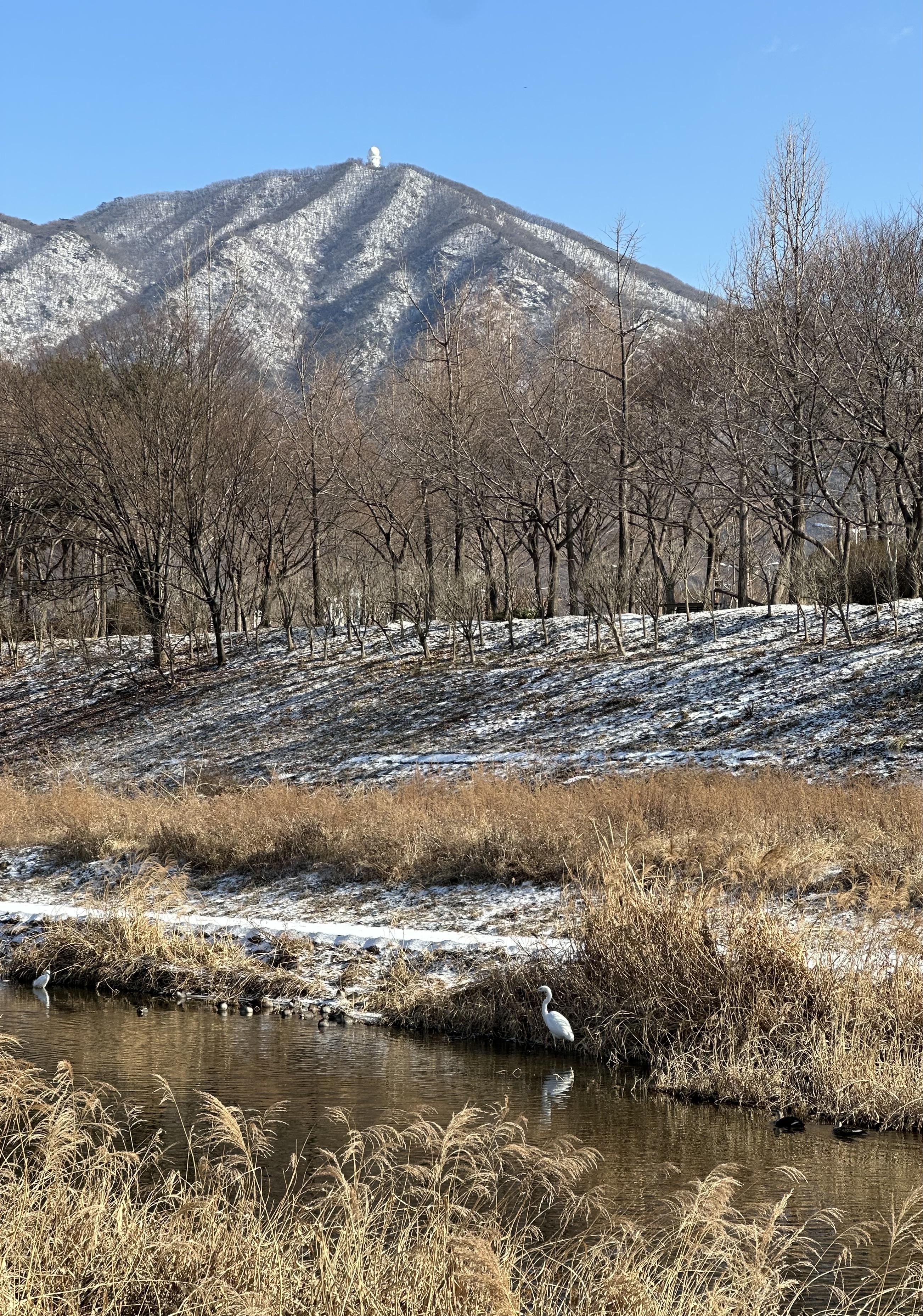 강추위가 연일 계속되면서 바깥 산책도 많이 게을러졌는데, 엇그제 눈 내린 산곡천과 강변 산책로를 칼바람을 맞으면서 걸었다. 겨울모자에 파카 모자까지 뒤집어쓰고도 바람을 맞았지만, 강추위 속 풍경은 상쾌하고, 산책하는 발걸음은 시원했다. 산곡천에서 한강으로 이어지는 길을 걷다 보면 강변 철새들 무리에서 빠져나와 유유히 고독한 수변 산책을 즐기는 왜가리(7/16/24) 두어 마리를 심심찮게 볼 수 있다.