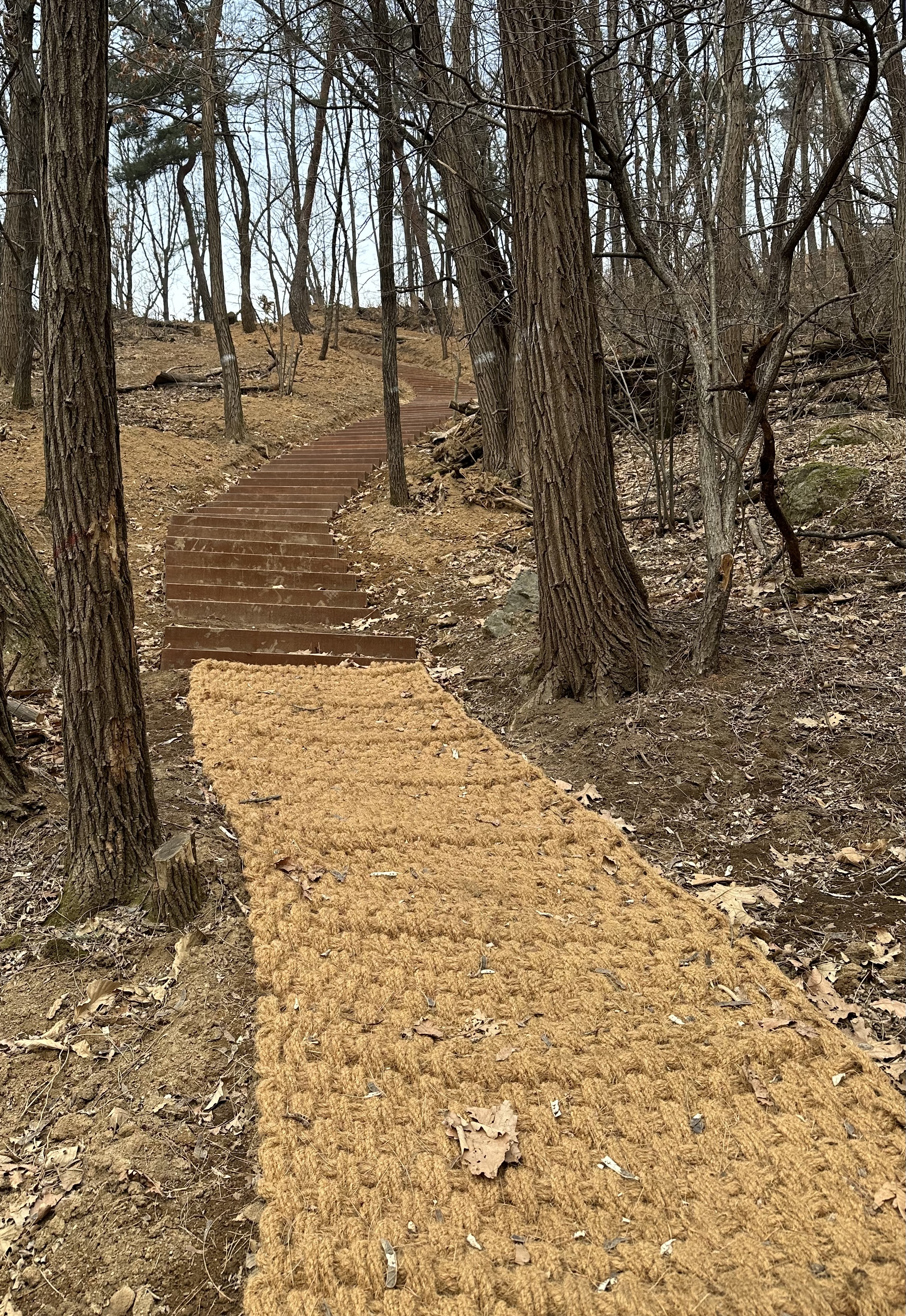 낙엽송 구간을 통과해 한 시간 넘게 걷다 보니 저 앞에 미군부대 펜스와 집들이 보였는데, 왔던 길을 돌아가는 건 아니겠다 싶어서 마을을 지나 버스를 타고 돌아왔다. 최고 고도는 2백 미터 정도 되는 것 같고, 집에서 한 시간 반, 만 보 정도를 걸은 것 같다. 날이 따뜻해지면 등산 대신 왕복으로 걸어보려 한다.