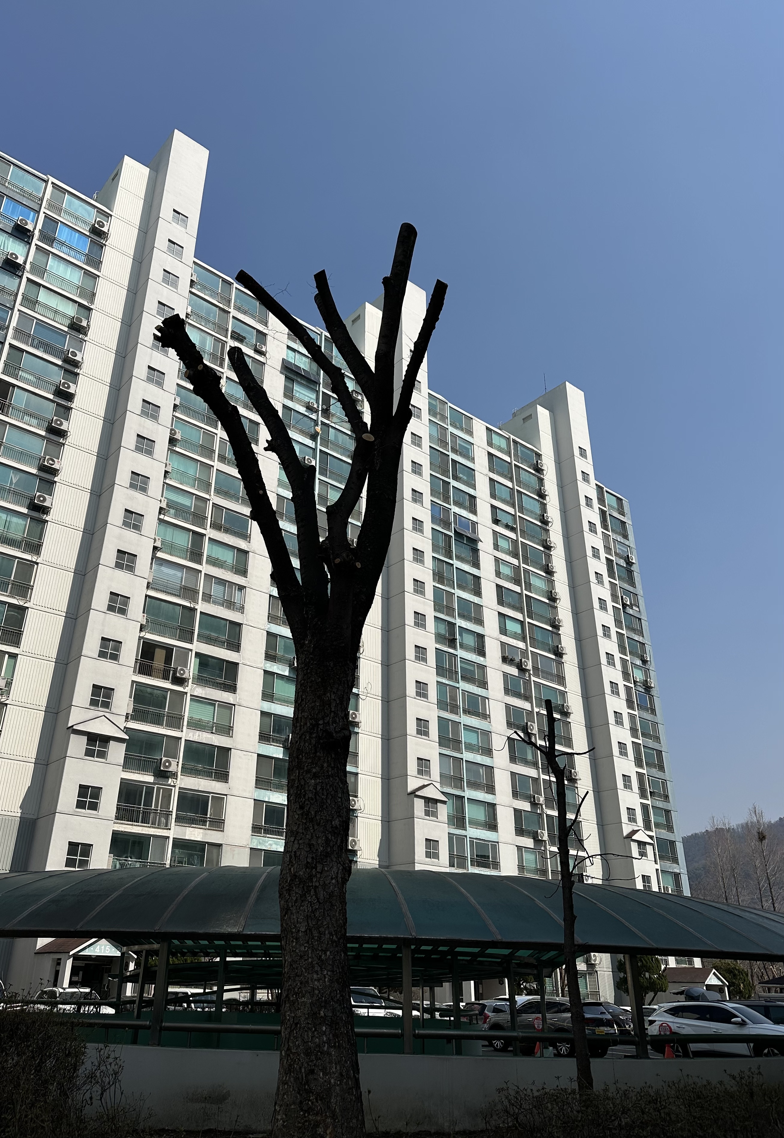 병충해 방지 목적으로 건강하게 자라도록 가지치기 하는 거야 나무의 숙명이지만, 단지 나무들 대부분을 이리 해 놓으니 일단 을씨년스러운 게 보기 안 좋다. 물론 나무의 왕성한 생명력과 복원력이 계절이 바뀌면 언제 그랬냐는 듯이 새 가지를 내고 새 잎들로 덮어, 이런 일이 있었다는 걸 짐작도 못하게 만들겠지만, 당분간은 풍경이 영 아니게 생겼다.