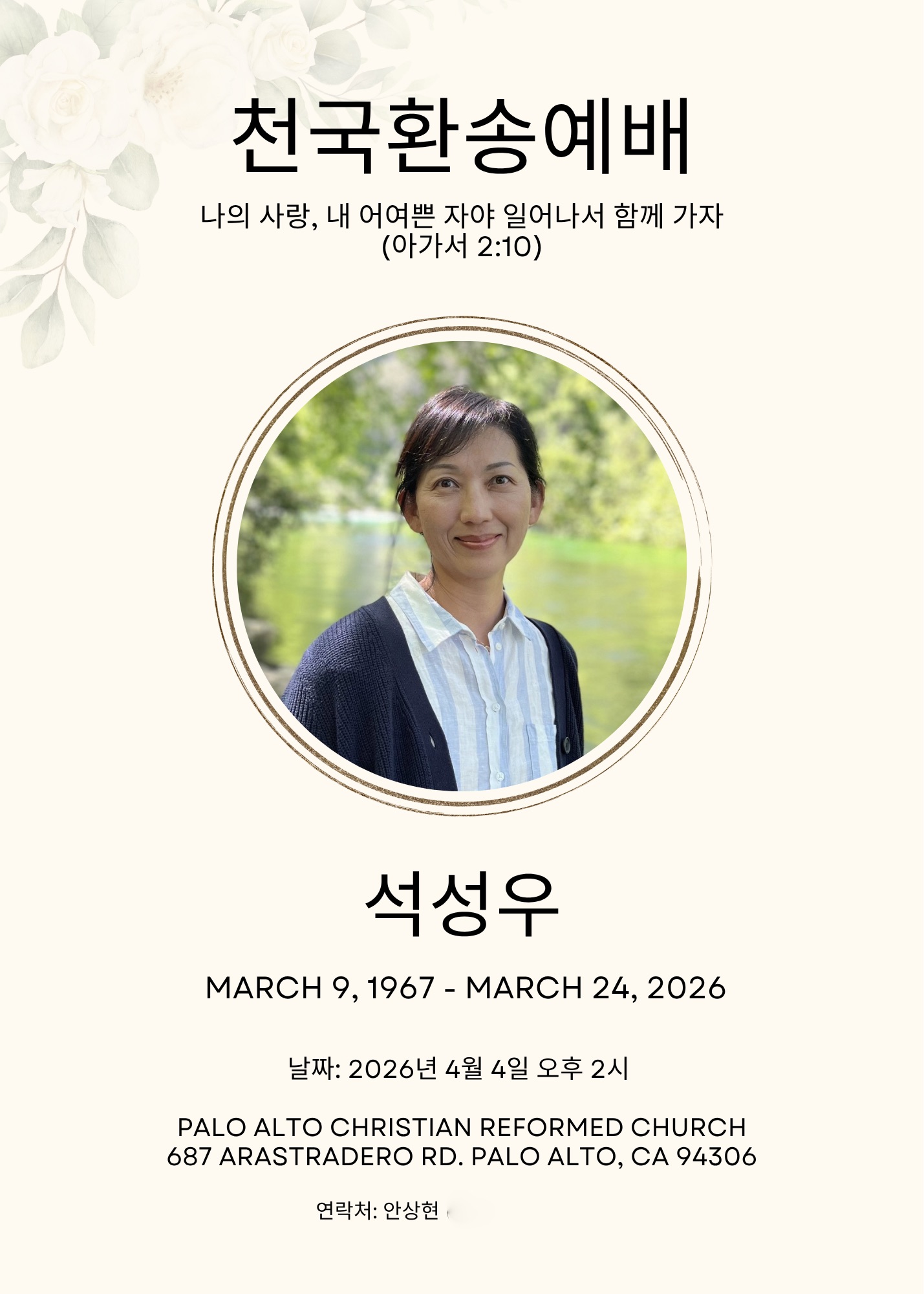 지난주에 참으로 안타까운 부고를 접했다. 미국 산호세에 사는 안상현 목사의 아내 석성우 사모가 3년여 투병 끝에 소천했다는 소식을 카톡 그룹기도창과 페이스북을 통해 알게 됐다. 두 분을 알고 지낸 지도 10년이 넘고, 미국과 한국에서 여러 번 함께 시간을 보내면서 나눈 대화들과 기억들이 따뜻하고 생생한데, 한 분은 다시 못 뵈게 되었으니 착잡한 심정을 주체할 수 없다.