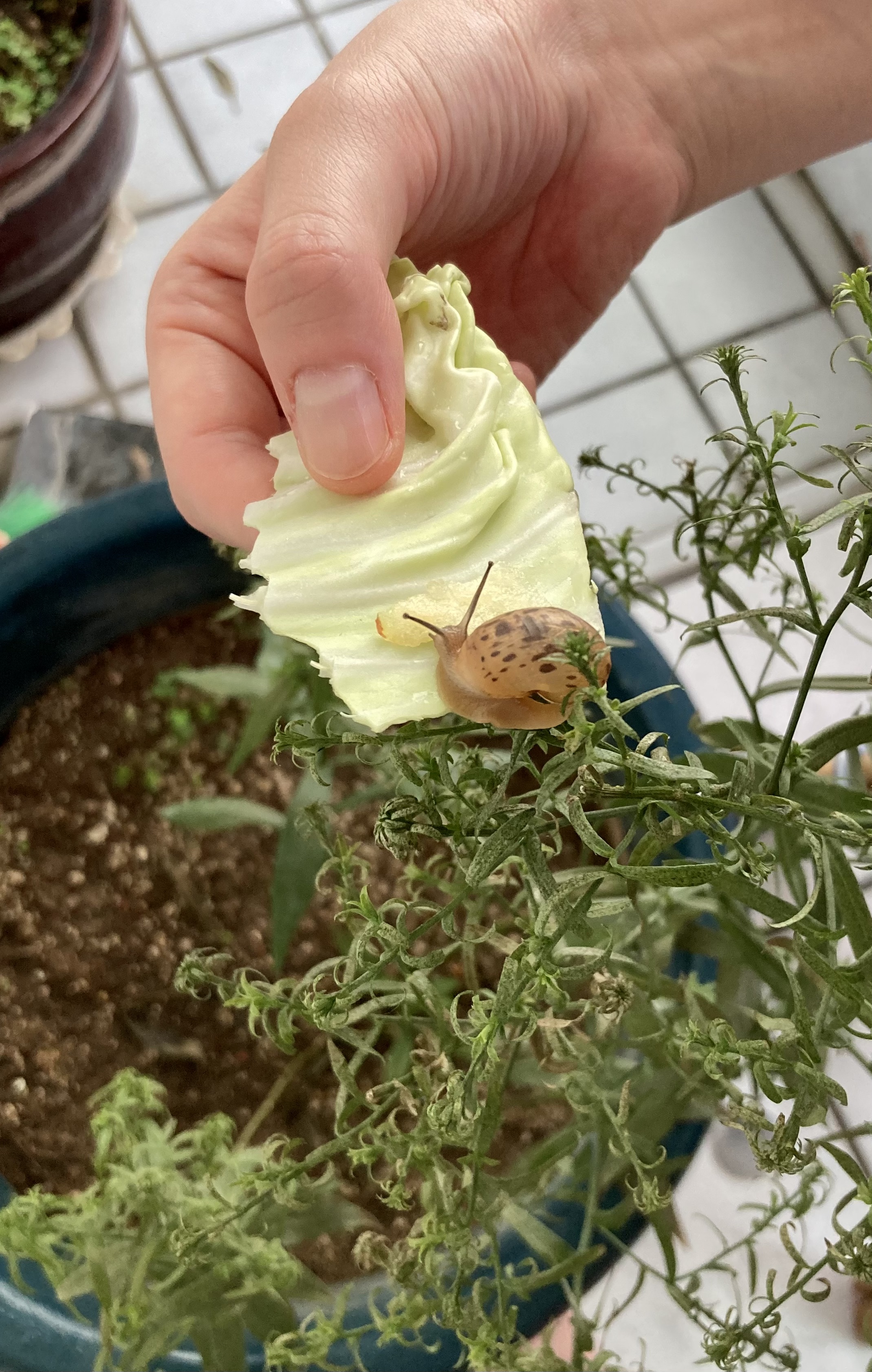 그 다음날부터 아내와 g는 아침에 일어나면 베란다로 달려가 새 식구의 존재를 확인하는 게 하루 일과의 시작이 됐다. 화초 가지 사이에 매달려 있다가 화분으로 기어가 붙어 있기도 하는 달팽이와 하는 숨바꼭질이 재밌는 모양이다. 급기야 g는 사과를 얇게 썰어 양배추 위에 놓고 먹이로 주기도 했는데, 맛이 있는지 곧잘 받아 먹는다.