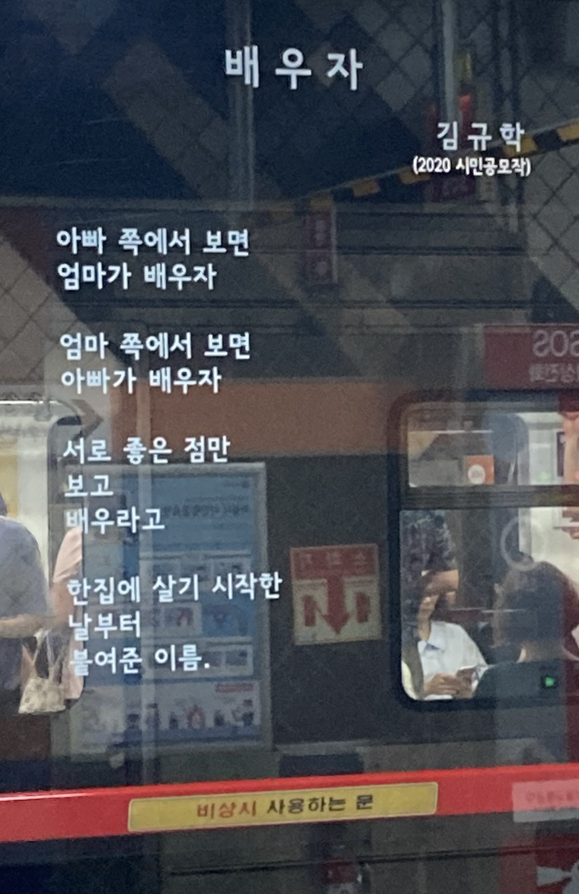 얼마 전 3호선 압구정역에서 <배우자>란 시를 봤는데, 배우자를 명사와 동사로 쓸 수 있는 데 착안한 짧지만 뼈를 때리는 언어유희가 빛났다. 아하, 그렇게도 생각할 수 있겠구나 하게 만드는 시였다. 간단하고 쉬워 보이지만, 의외로 잘 안 하거나 못하는 수가 많았다는 걸 자책하고 수긍하게 만들었다.