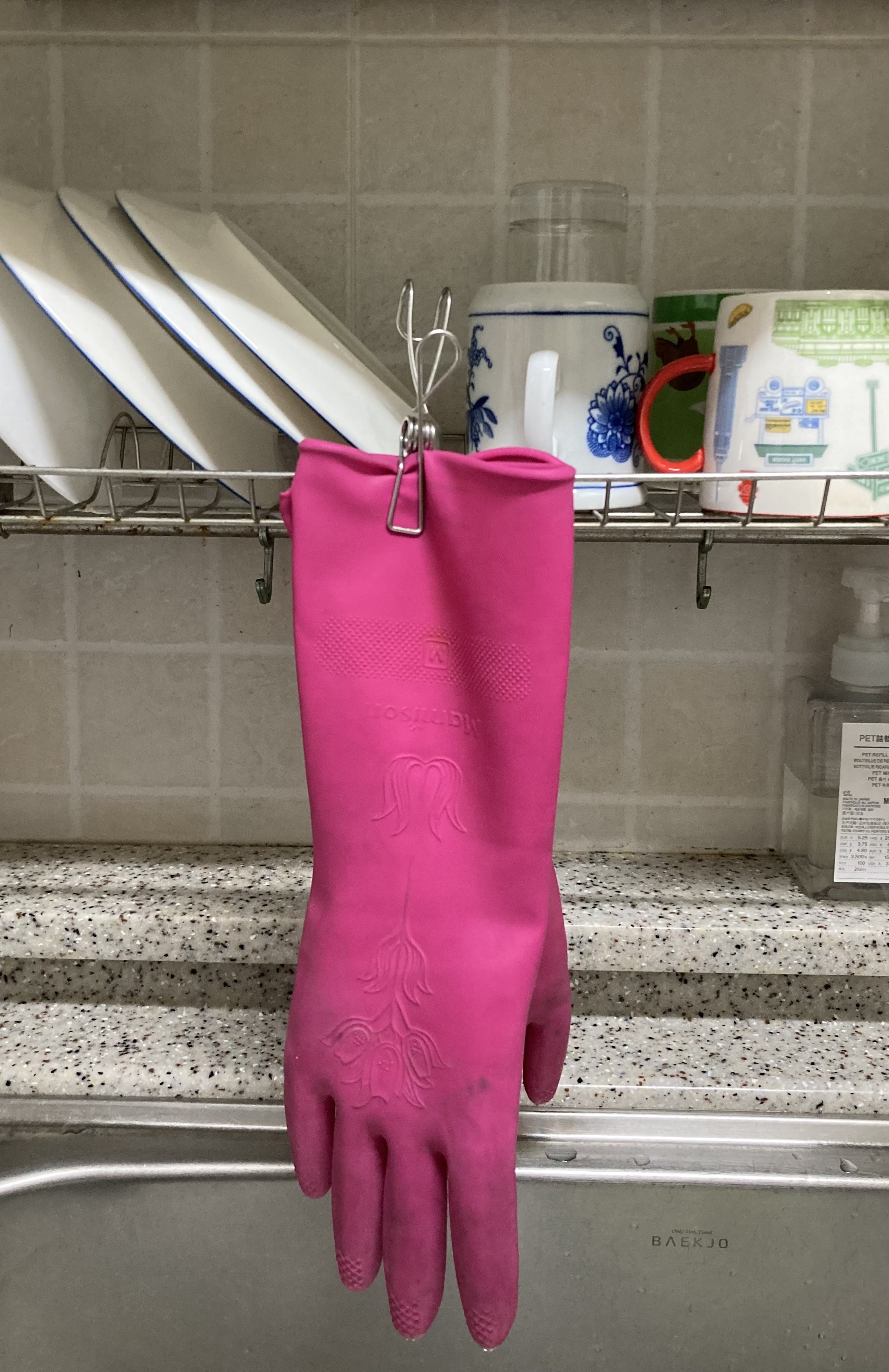 카페에서 일하면서 배웠는지, 늘 마무리는 앞쪽에 걸쳐놓는 우리완 달리 고무장갑을 길게 걸어놓는데, 확실한 마무리로 일단 보기가 좋다. 물론 설거지의 핵심은 잘 닦고 헹궈 물이 잘 마르도록 가지런히 놓는 것일 테지만, 이렇게 해 놓지 않으면 제대로 안 한 셈이 되어 종종 우리도 한 마디씩 듣는다.