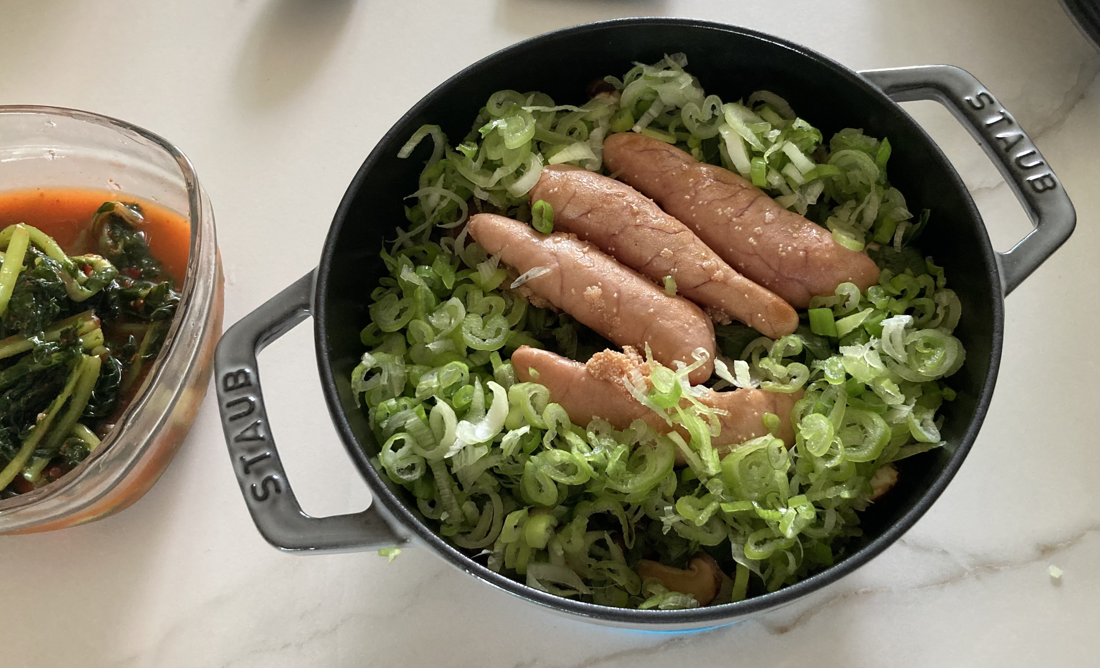 다른 젓갈과는 달리 명란젓은 냉동에 보관하고 꺼내서 바로 먹을 수 있다는 팁도 얻어 왔다. 보통은 파를 잘게 썰어 넣고 참기를 살짝 뿌려 밥에 올려 먹는데, g가 표고버섯을 넣고 명란솥밥을 하겠다고 나섰다. 뜸들인 솥두껑을 열고 파 썬 걸 올려주니, 오~ 비주얼이 그만이었다!