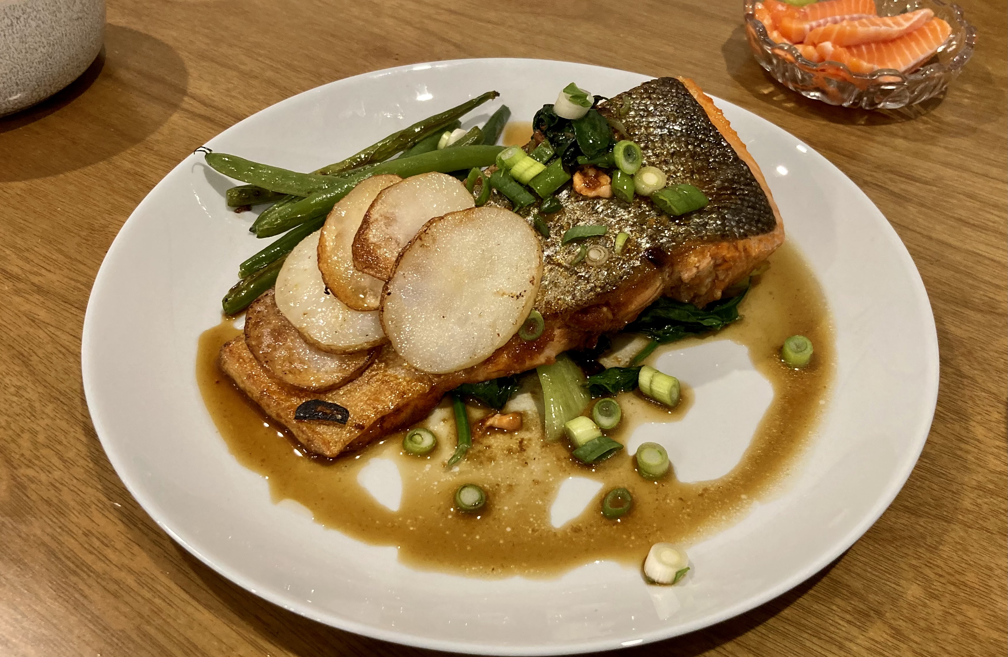 한국에선 주로 노르웨이산을 먹는데, 지구 반대쪽 바다에서 자란 뉴질랜드 연어 맛에 홀딱 빠질 수밖에 없었다. 잘 굽기도 했고, 간장 조린 슴슴한 소스도 아주 적당했다. 시금치와 아스파라거스 그리고 얇게 썬 감자까지 흠잡을 구석이 없었다. 게다가 생연어까지, 이제 당분간 다른 연어는 눈에 안 들어올지 모르겠다.^^