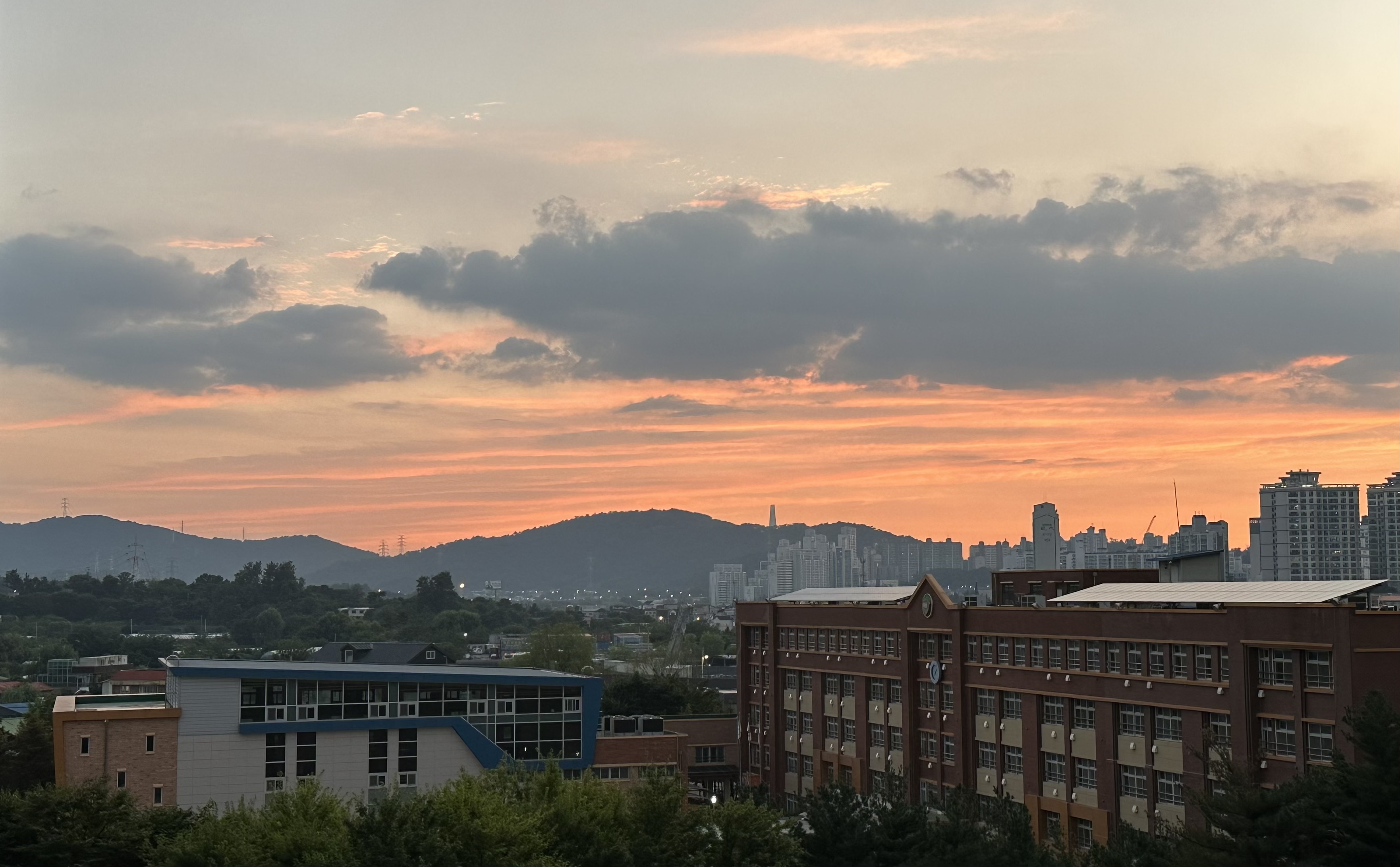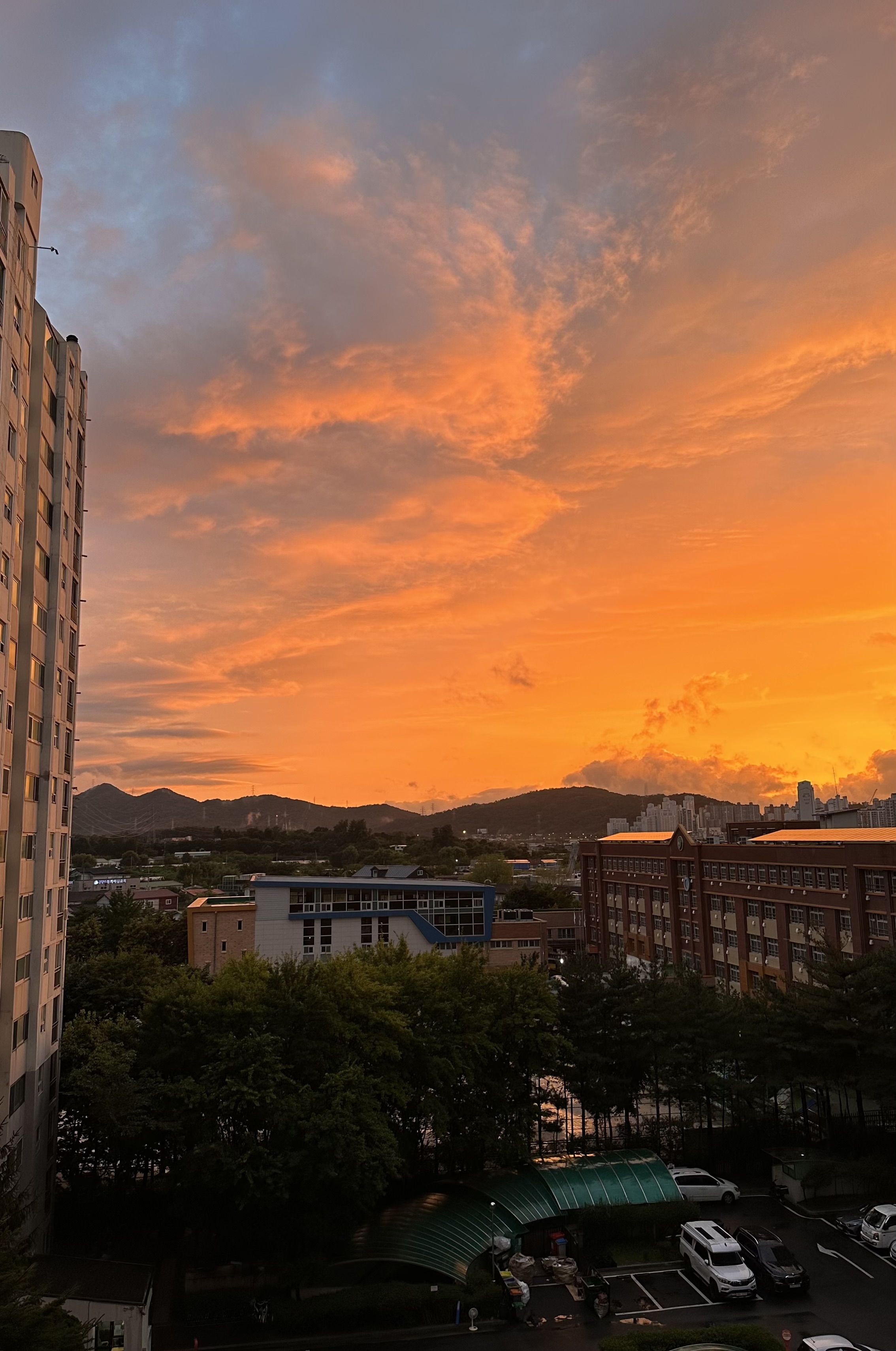 거실 베란다가 서향인 우리집은 은근히 노을 맛집이다. 날이 길었던 한여름부터 가을의 문턱에 있는 요즘까지 저녁 무렵이면 산 너머 하늘을 부드럽게부터 빠알갛게까지 물들이는 노을이 참 볼만 하다. 일출이나 일몰 장면을 보려고 찾아다니는 이들도 많은데, 우린 앉아서 멋진 노을을 누리고 있다.