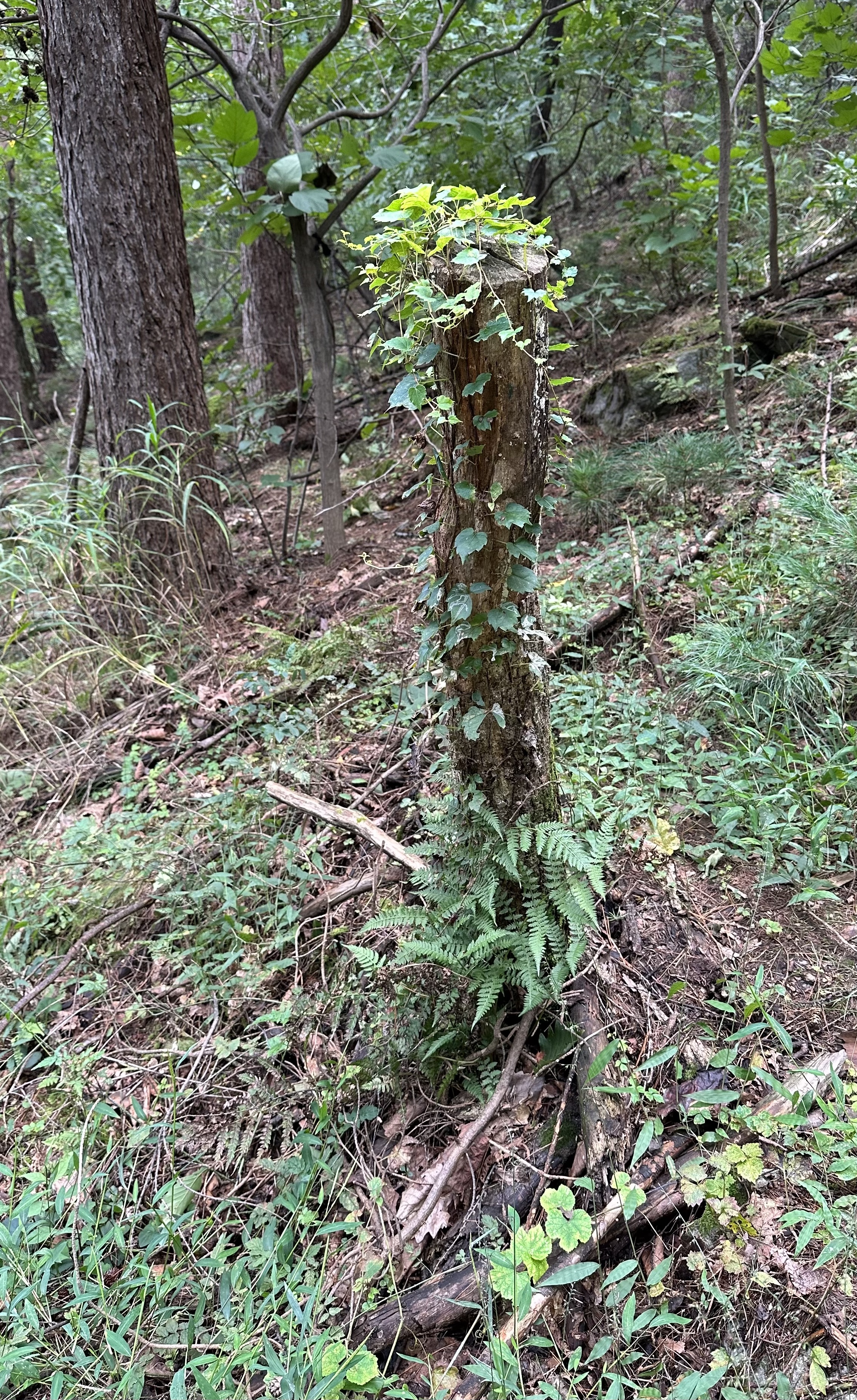 사람 키 높이로 잘려 죽은 나무 같지만 여전히 뿌리를 박고 있는 나무 위로 담쟁이 같은 덩쿨 식물들이 타고 올라 자리를 잡았다. 더 이상 가지나 잎을 맺지 못하는 나무를 대신하는 것 같은 이런 조합은, 그늘진 곳에서 많이 이루어지는데, 검단산에선 등산로 바로 옆에서도 쉽게 찾아볼 수 있다.