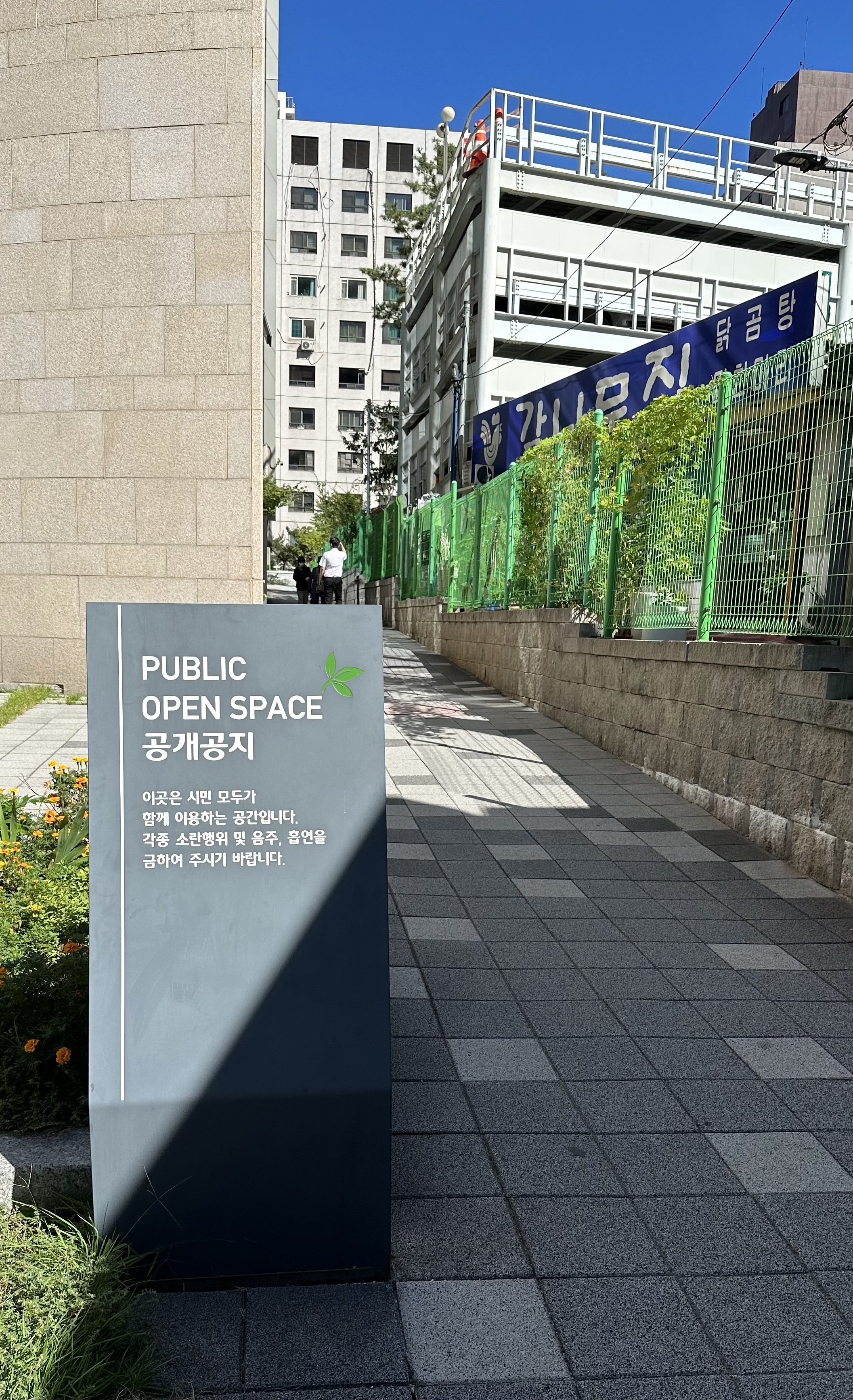 광화문과 홍대를 걷다가 처음 보는 단어인 "공개공지"(Public Open Space) 안내판을 보게 됐다. 일정 규모 이상의 건물을 지을 때, 일반인들이 이용할 수 있도록 작은 공간을 만들어야 한다는 개념 같다. 큰 건물 옆의, 잘 보이지도 않는 짜투리땅이 시민들에게 얼마나 효용이 있을지 모르겠지만, 건축법상 의무조항인듯 싶었다.