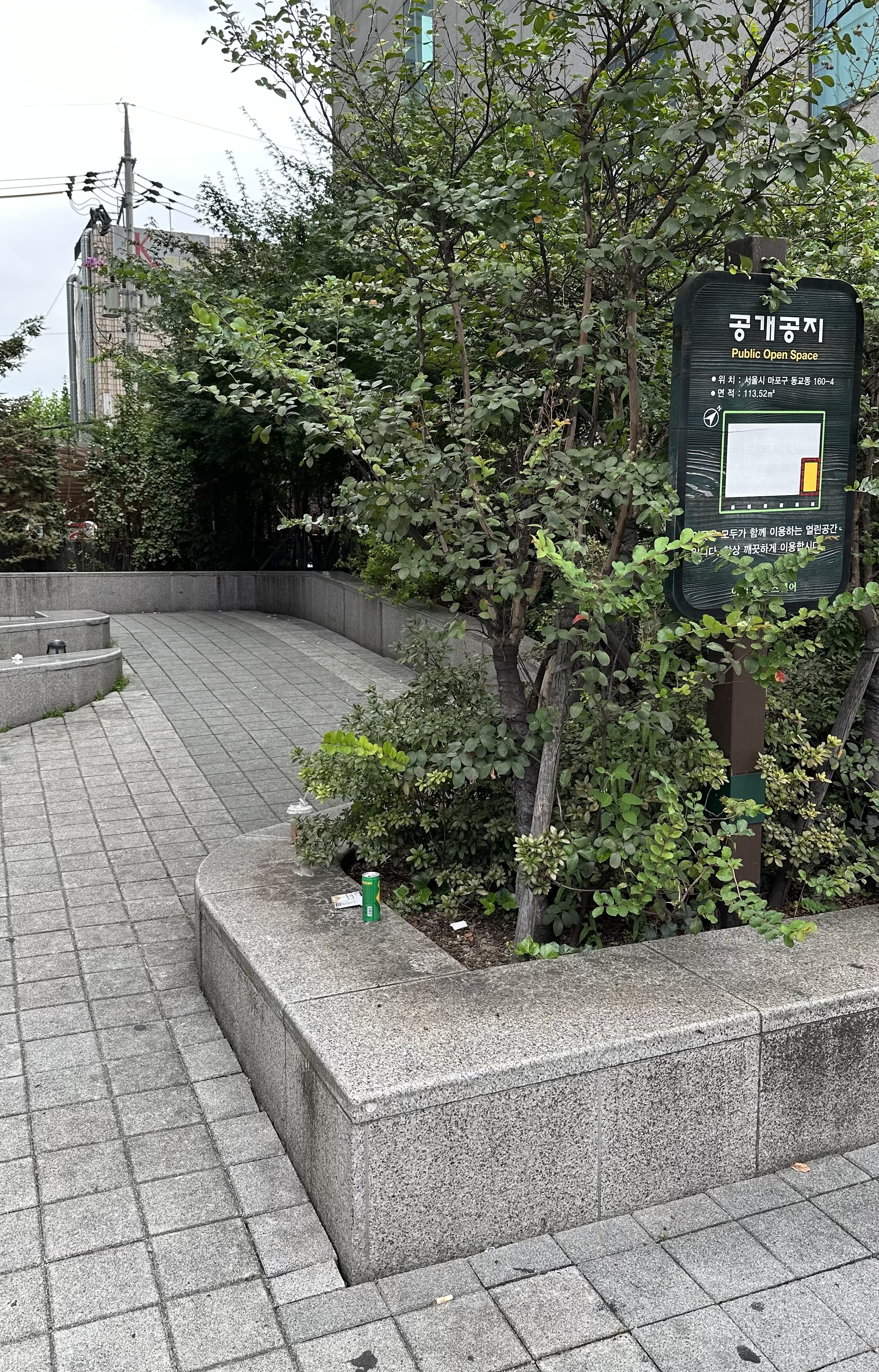 두 곳 다 이렇다 할 볼품은 없었지만, 큰 빌딩이 들어선 금싸라기 땅에 이렇게 숨통을 틔울 수 있는 자그마한 공간이 있다는 게 없는 것보다는 낫겠다 싶고, 넓게 보면 공공선을 이루는 한 방편이 될 듯 싶다. 현실은 그 건물에서 일하는 이들의 담배 피우는 장소로 많이 쓰일 것 같긴 했다.
