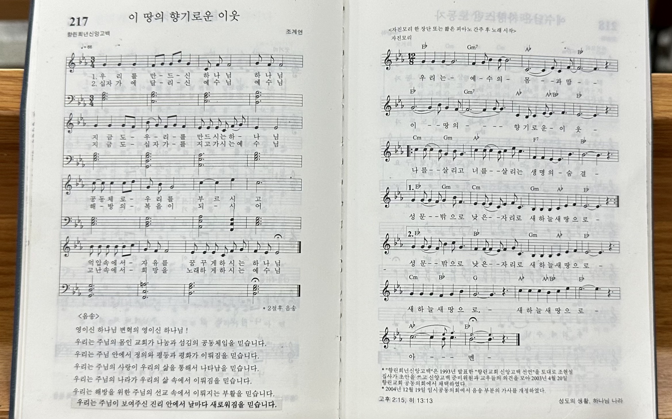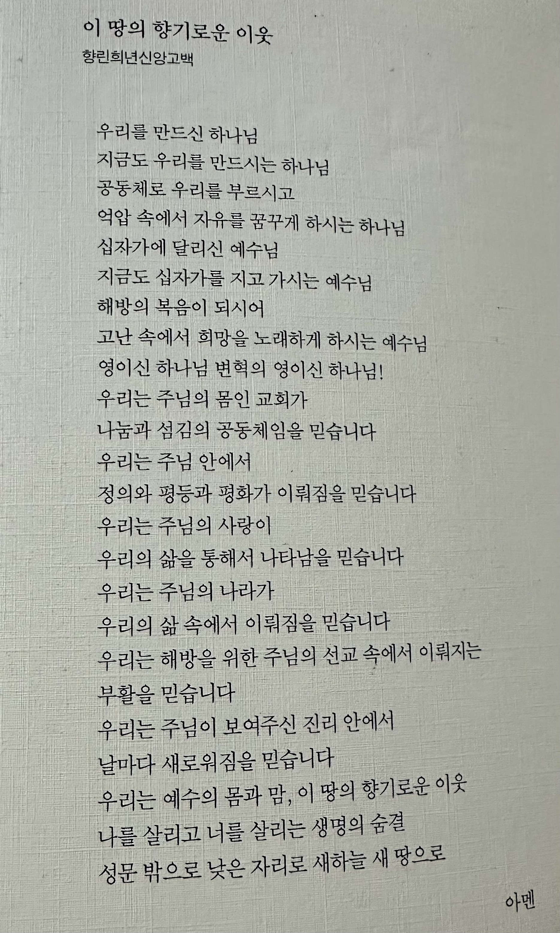이 교회가 사용하는 국악찬송가를 펴면 노래들이 나오기 전에 이 교회 교우들의 신앙고백이 나온다. <희년신앙고백>이란 이름을 붙인 걸 보면 아마도 교회를 시작한 지 50년이 되는 2천년대 초반에 정리한 게 아닌가 싶은데, 서양 교회들의 고백을 번역하는 데 그치지 않고 국악 찬송가들처럼 우리 식으로 단어와 문장을 고른 게 눈에 띈다.