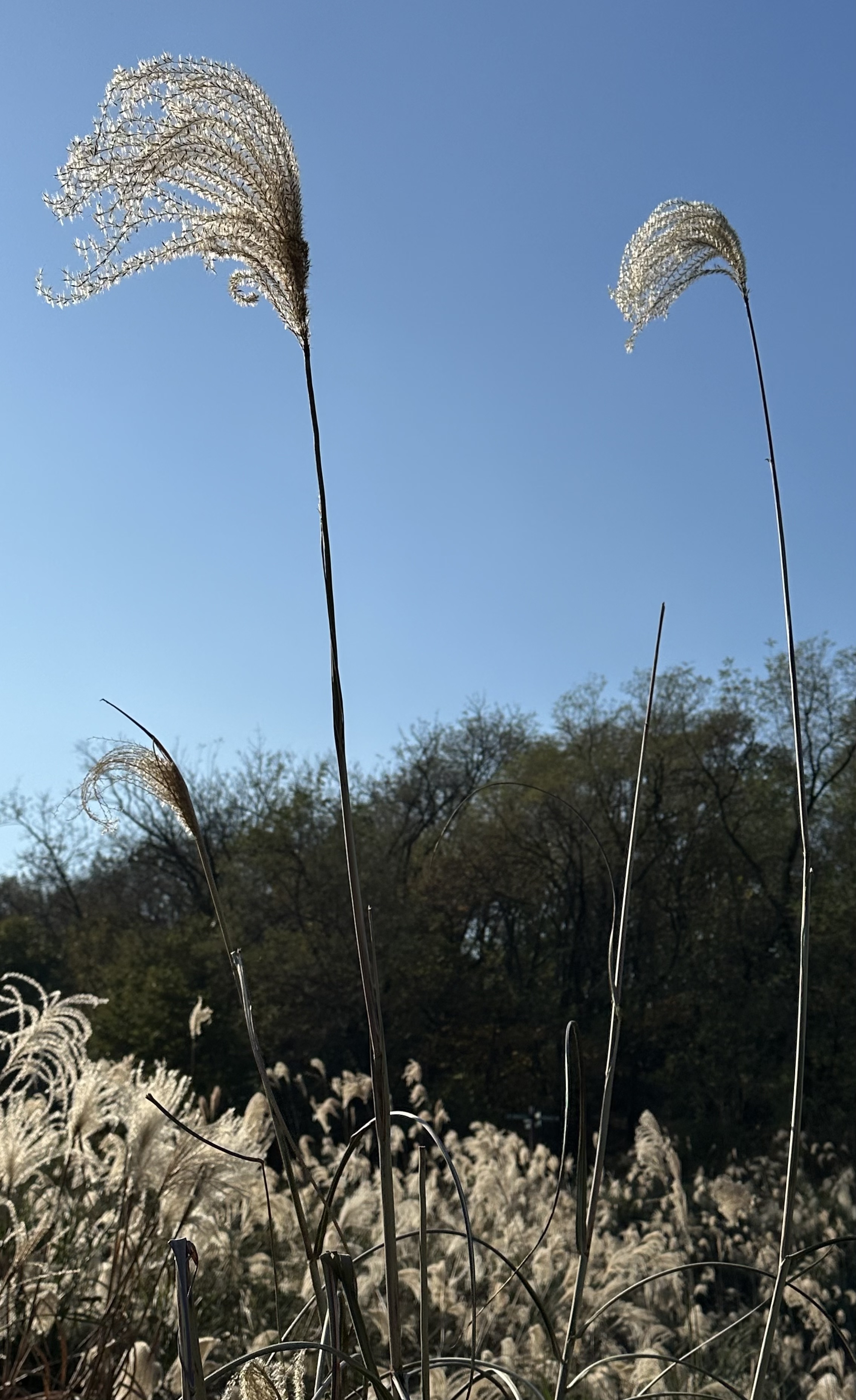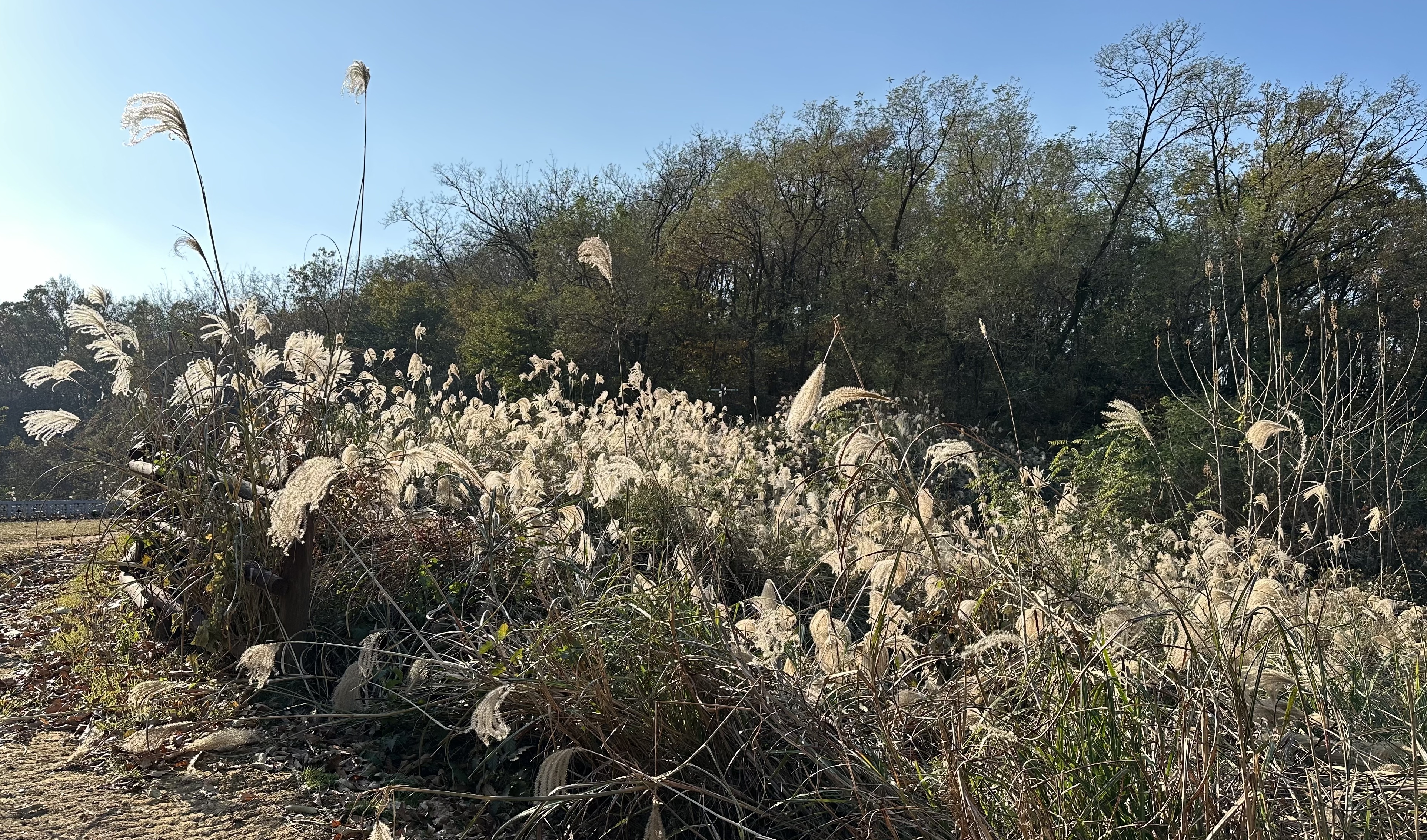 강변과 산등성이에 억새가 한창이다. 팔당대교와 스타필드 사이 너른 공간엔 군데군데 억새밭(10/7/23)이 금빛 물결을 이루고 바람이 불면 휘청 출렁거리면서 산보객들의 시선과 발길을 끌어당긴다. 보통이 사람키이고, 개중에 삐죽 솓은 애들은 3미터를 훌쩍 넘기는 장신이다.