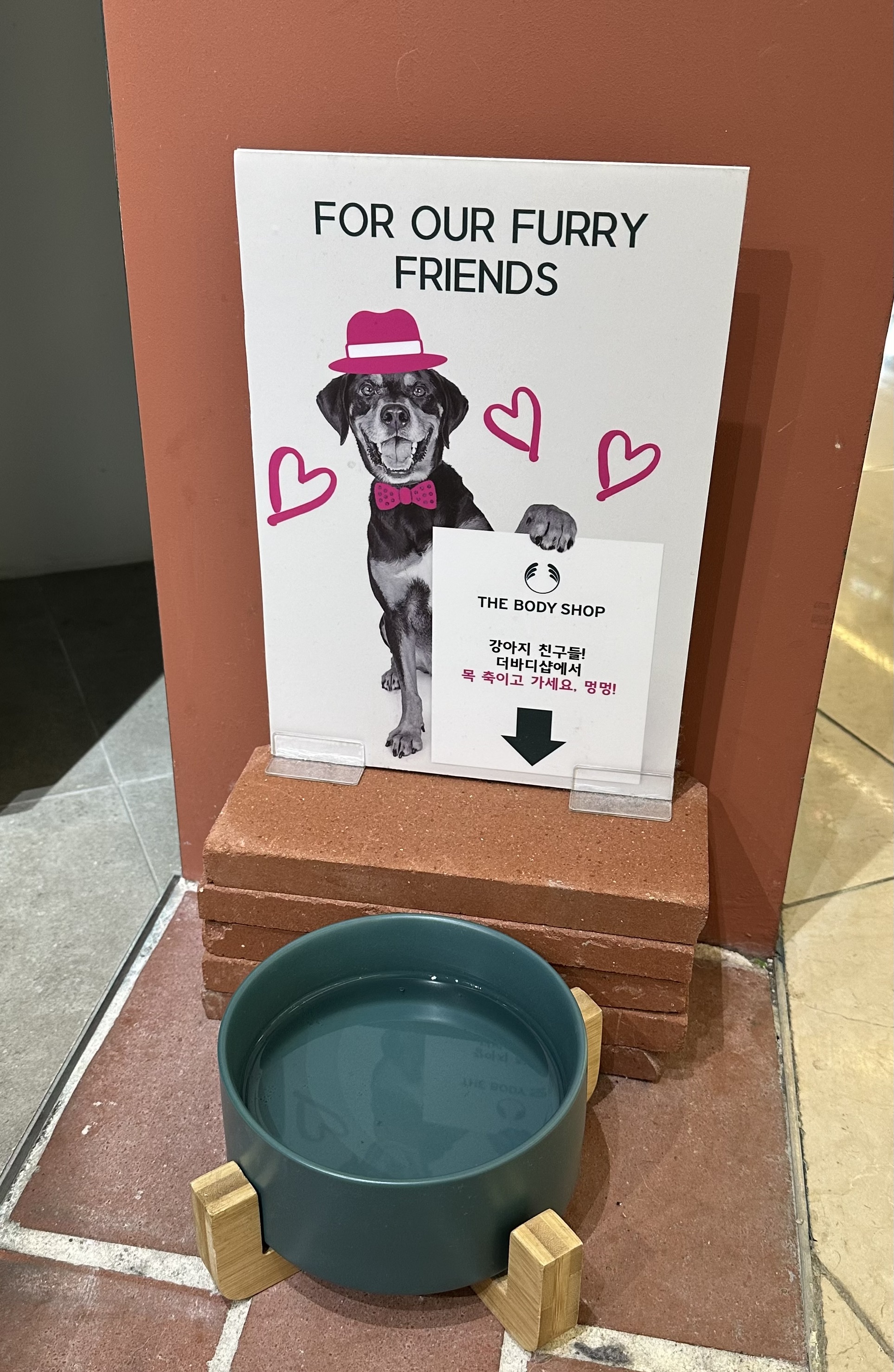 스타필드 1층 바디샵에 들어간 아내를 기다리는데, 스토어 입구 한 구석에 작은 물통이 놓여 있었다. 바닥에 놓인 게 사람용은 아닌 것 같고, 주인을 따라온 반려동물에게 물을 먹이라고 마련한 모양이다. 강아지들이 글과 하트, 화살표는 읽을 수 없어도 직관적으로 물통으로 향할 순 있을 것 같았다.