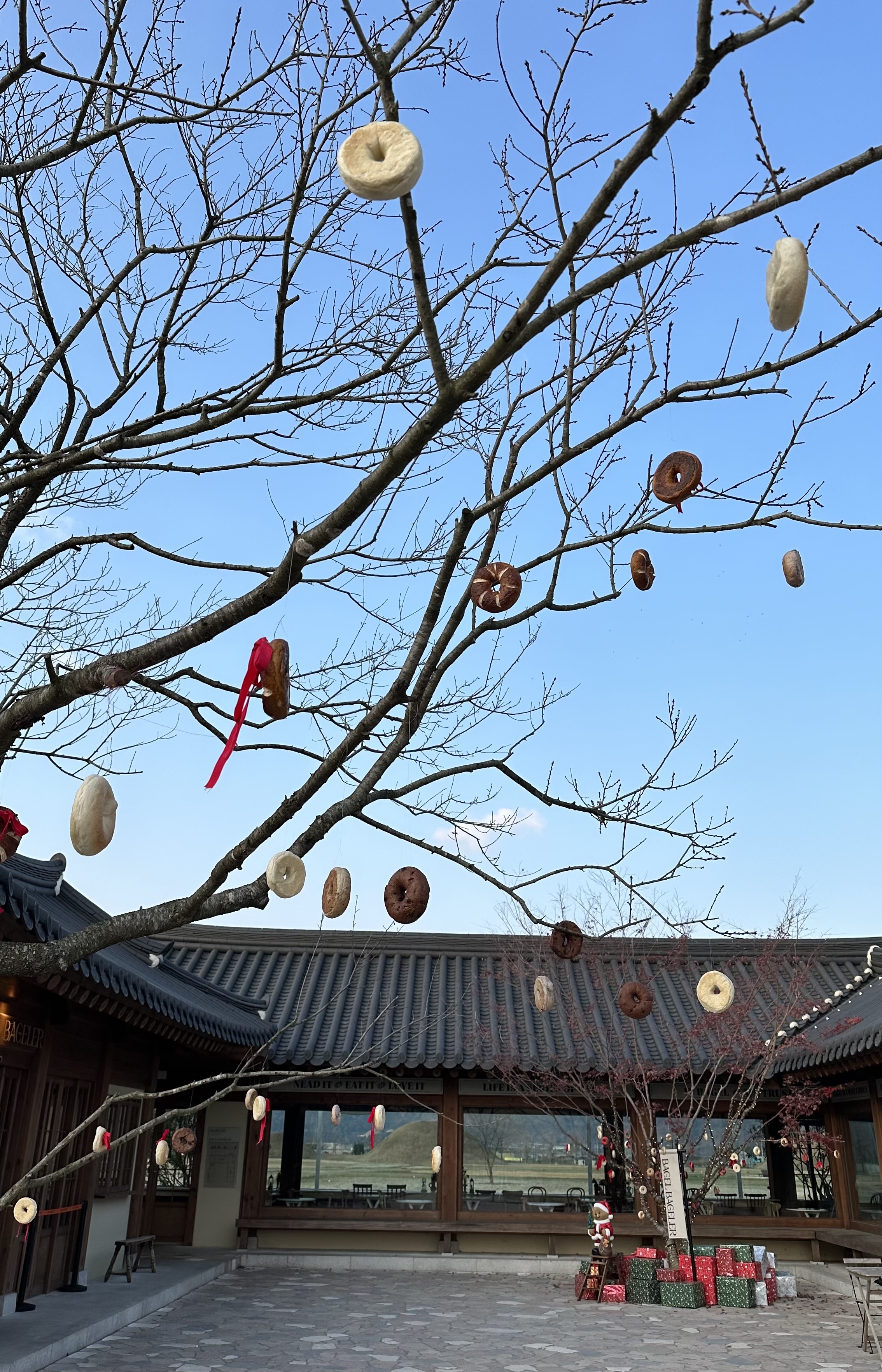 매장 마당에 있는 나무 두 그루에 베이글을 주랑주렁 매달아 놓았는데, 베이글이 열리는 나무가 있나 보다.^^ 선물 박스들과 함께 크리스마스 트리로 아주 잘 어울려 보인다. 모형이 아니라 실제 베이글이었는데, 새들이 쪼아먹게 하려는 건지, 지나다니는 이들이 하나씩 따서 먹게 하려는 건지 모르겠다.