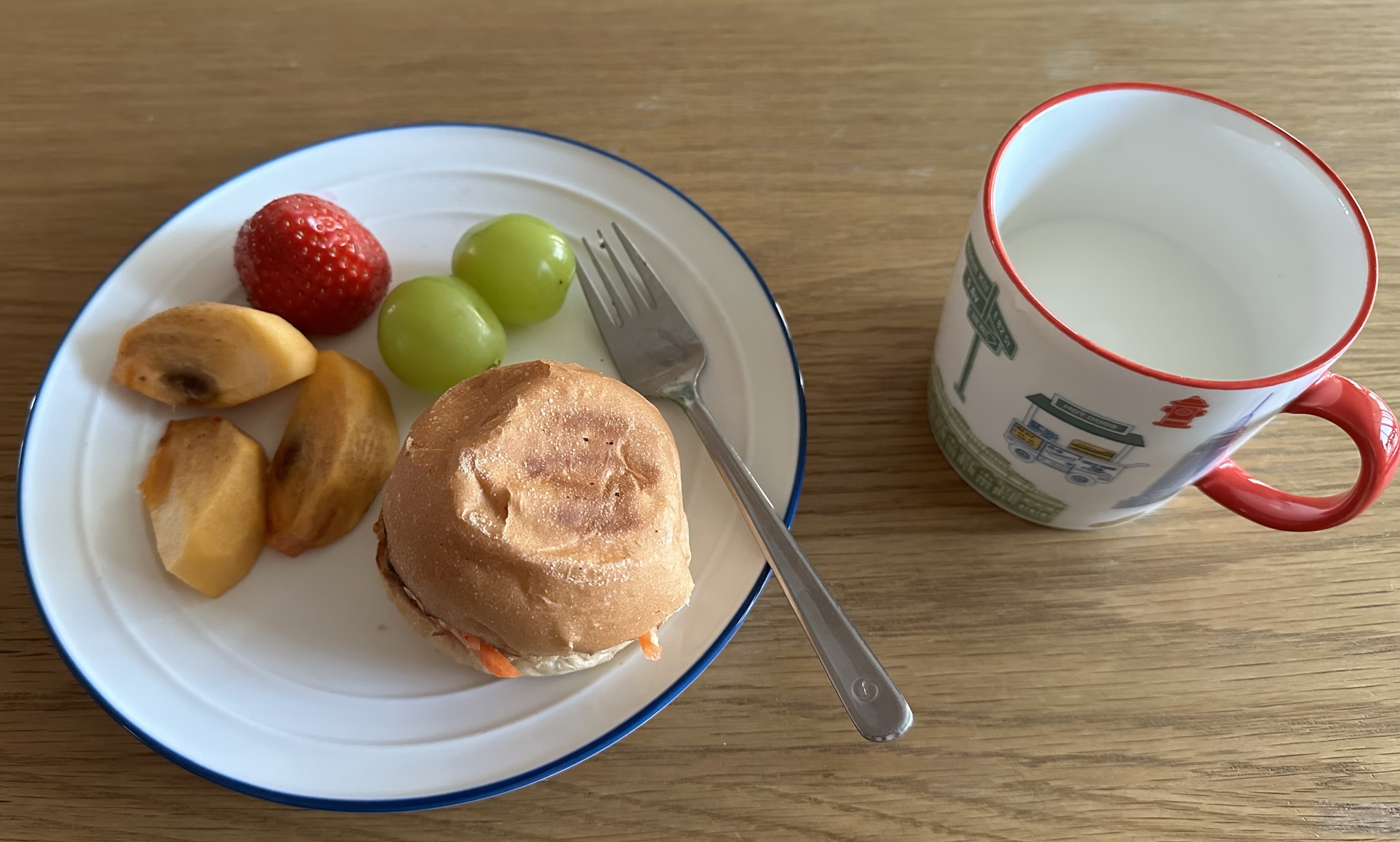 아침에 눈을 뜨면 냉장고에 있던 우유 반 잔을 따르고 한 시간 정도 지난 다음에 빵을 굽고 커피를 내린다. 그 동안에 아내는 과일을 깎고 자르는데, 주말이라 늑장을 부렸더니 과일 접시에 모닝빵 샌드위치와 함께 얹어 놓았다. 과일은 보통 사과 두 조각을 먹는데, 이 날은 사과 대신 단감과 샤인 머스켓 그리고 딸기 하나가 담겨 컬러풀했다.